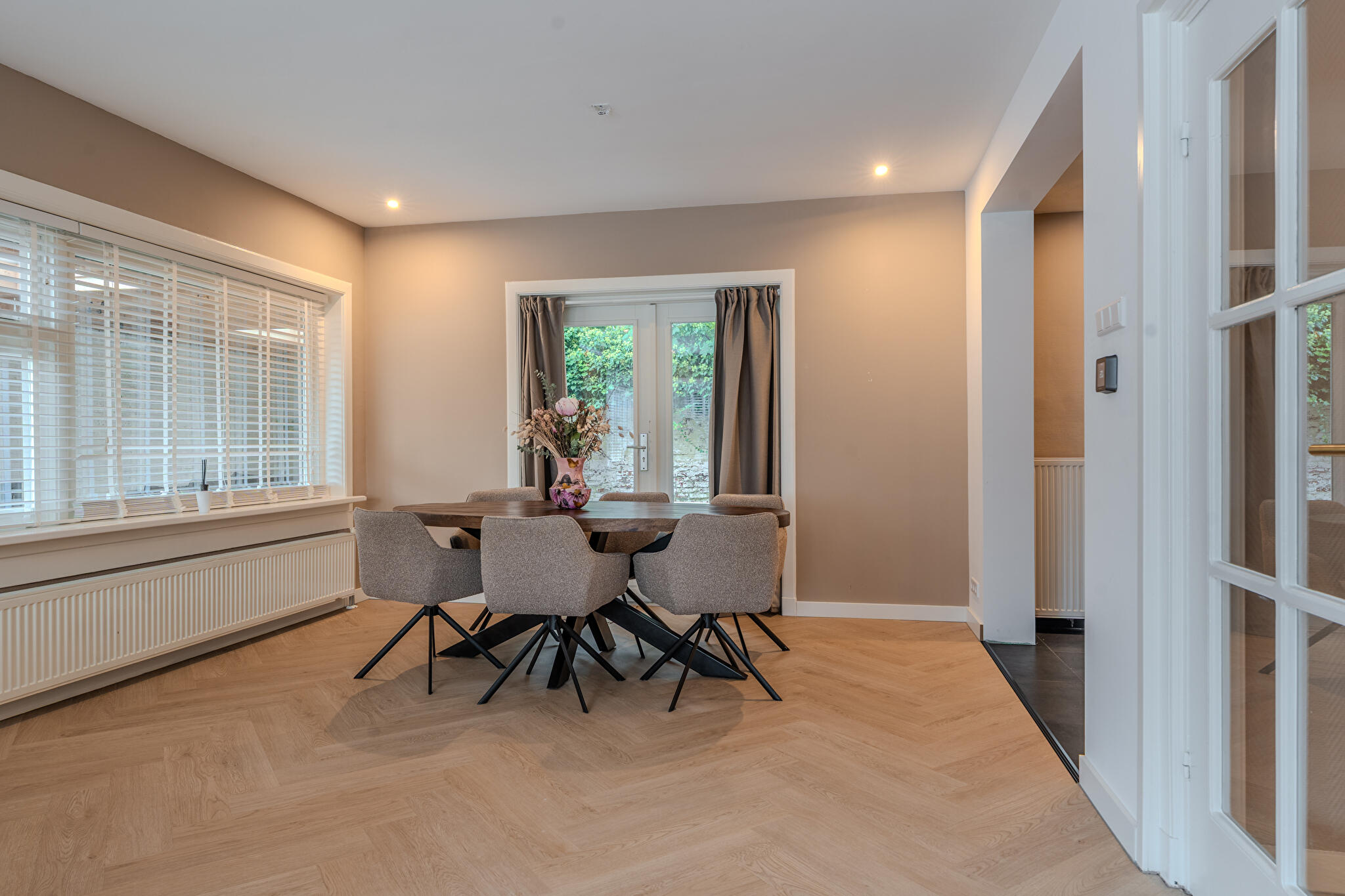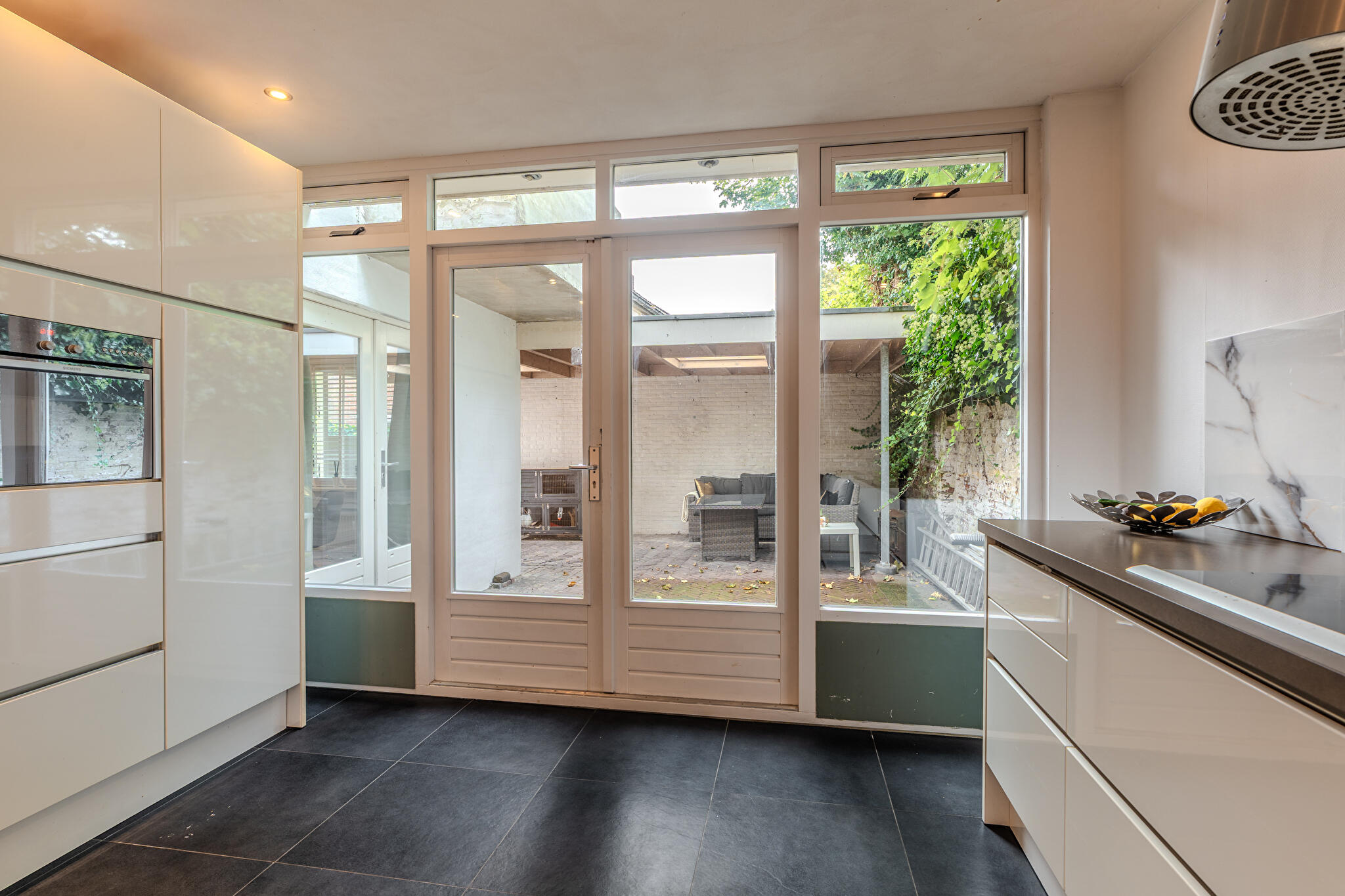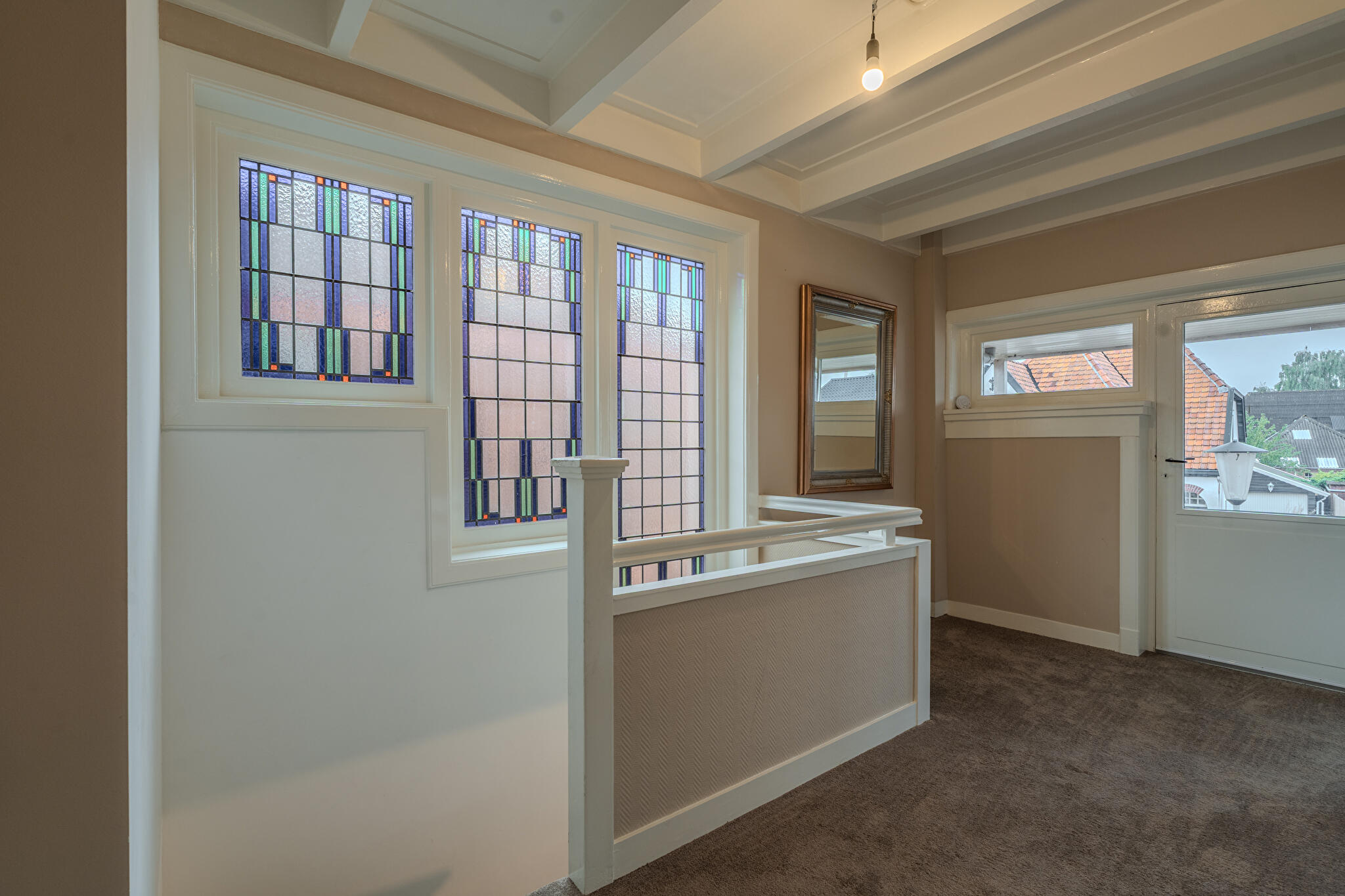 Begane grond: overdekt entree aan voorzijde van de woning, ruime hal, kelder en trapopgang naar de verdieping voorzien van karakteristieke glas-in-loodramen die zorgen voor veel sfeer en lichtinval. Moderne toiletruimte voorzien van wandcloset en fonteintje, royale, sfeervolle woonkamer voorzien van airconditioning en openslaande deuren, moderne hoekopgestelde (woon) keuken voorzien van diverse inbouwapparatuur en openslaande deuren die direct toegang geven tot de tuin met overkapping.