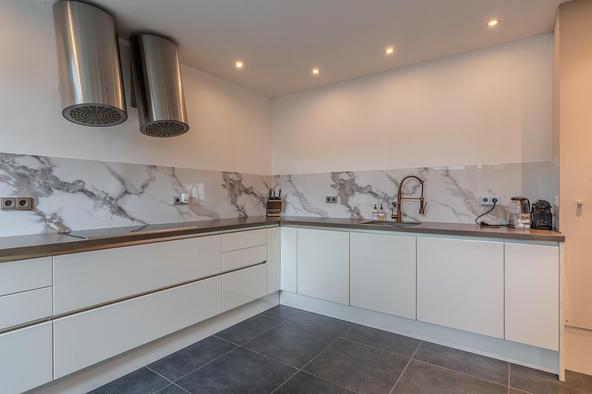 Eerste verdieping: ruime overloop met toegang tot een balkon, totaal 3 slaapkamers, waarvan één voorzien van vaste kasten en één met direct toegang tot het balkon, badkamer voorzien van douche, dubbele wastafel, hoekbad, designradiator en 2e wandcloset.