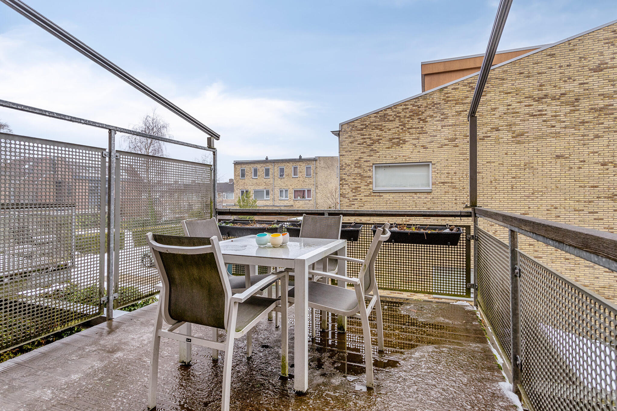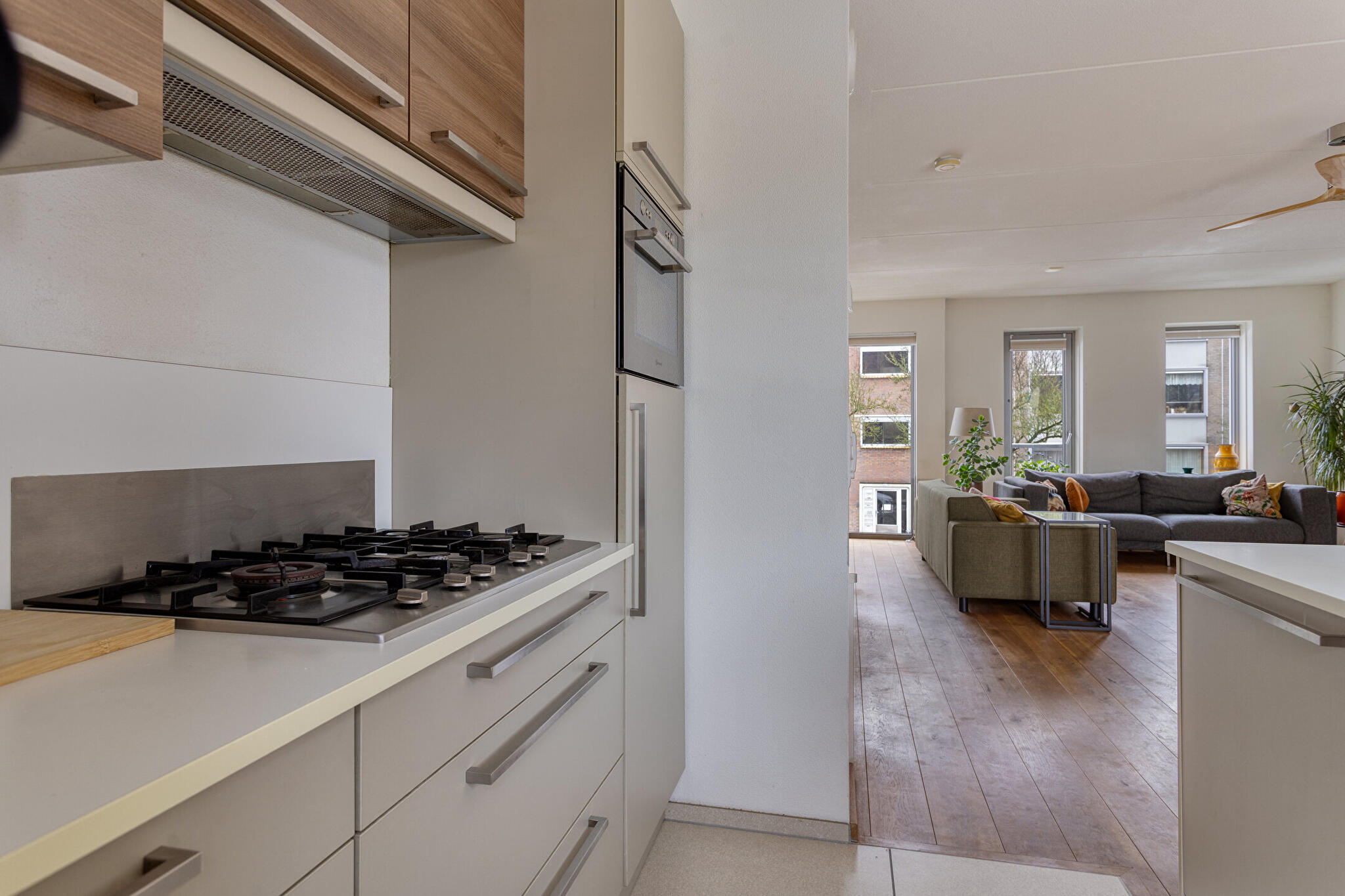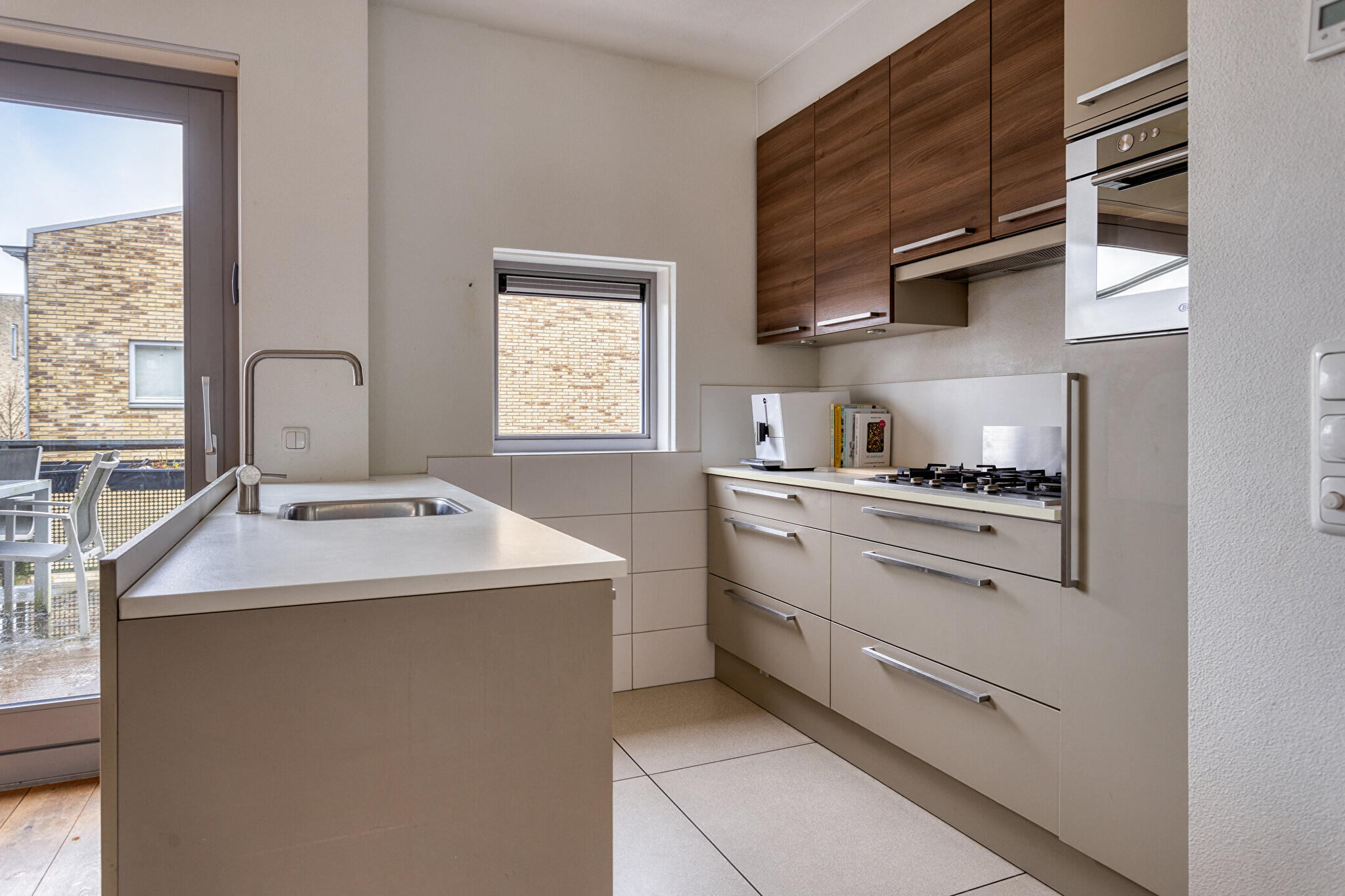 Eerste verdieping: royale, lichte woonkamer met grote raampartijen en nette houten vloer, open keuken voorzien van diverse inbouwapparatuur (o.a. 5- pits kookplaat met wokbrander, afzuigsysteem, koelkast, vaatwasser en combi-oven) en schuifpui naar het dakterras (ca.12 m²), het dakterras is voorzien van een elektrisch zonnescherm dat over het hele terras reikt. Vanuit de woonkamer trapopgang naar de tweede verdieping.