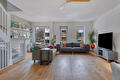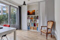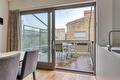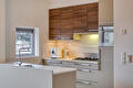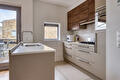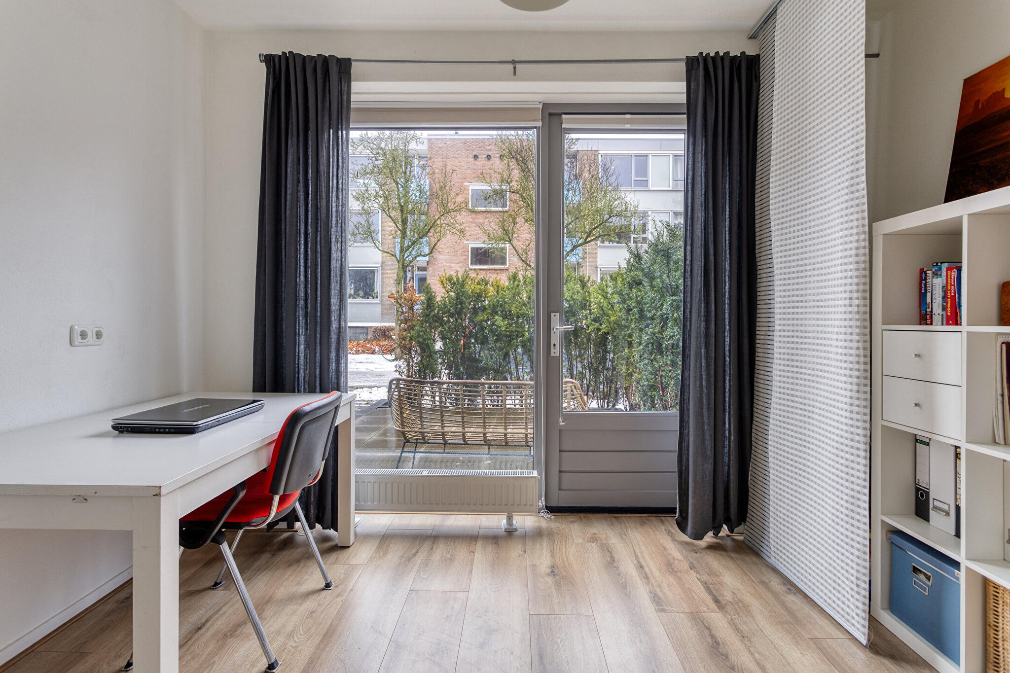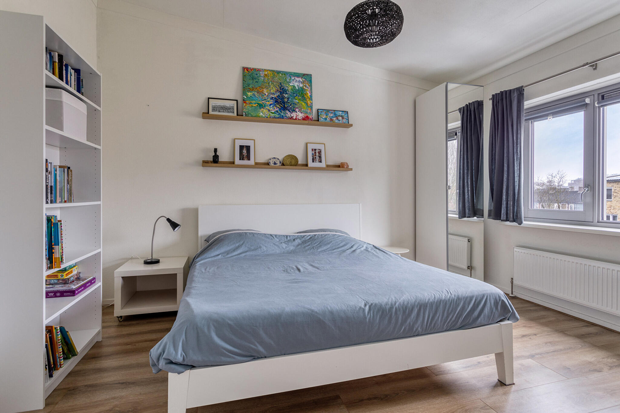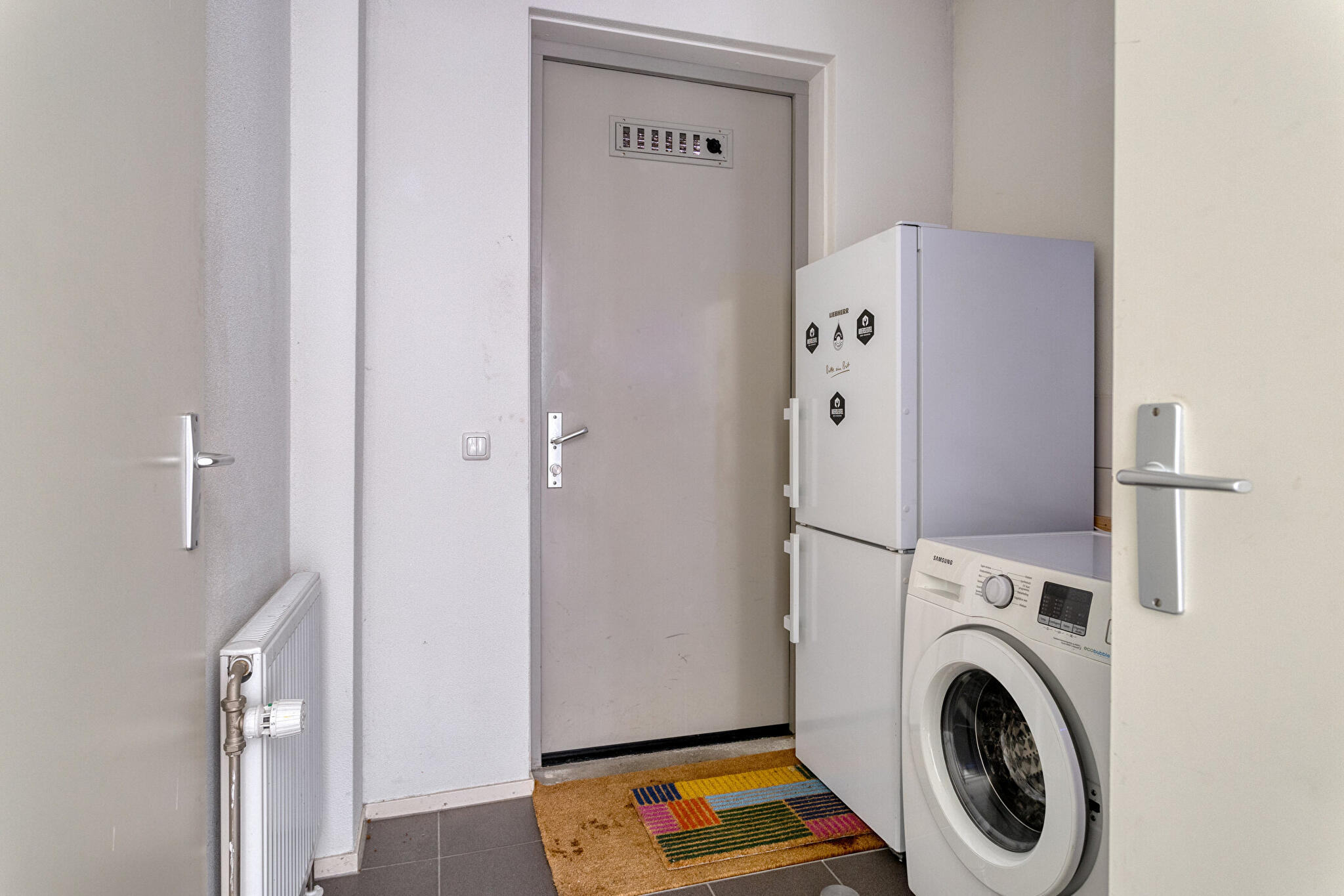 Eerste verdieping: royale, lichte woonkamer met grote raampartijen en nette houten vloer, open keuken voorzien van diverse inbouwapparatuur (o.a. 5- pits kookplaat met wokbrander, afzuigsysteem, koelkast, vaatwasser en combi-oven) en schuifpui naar het dakterras (ca.12 m²), het dakterras is voorzien van een elektrisch zonnescherm dat over het hele terras reikt. Vanuit de woonkamer trapopgang naar de tweede verdieping.