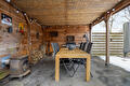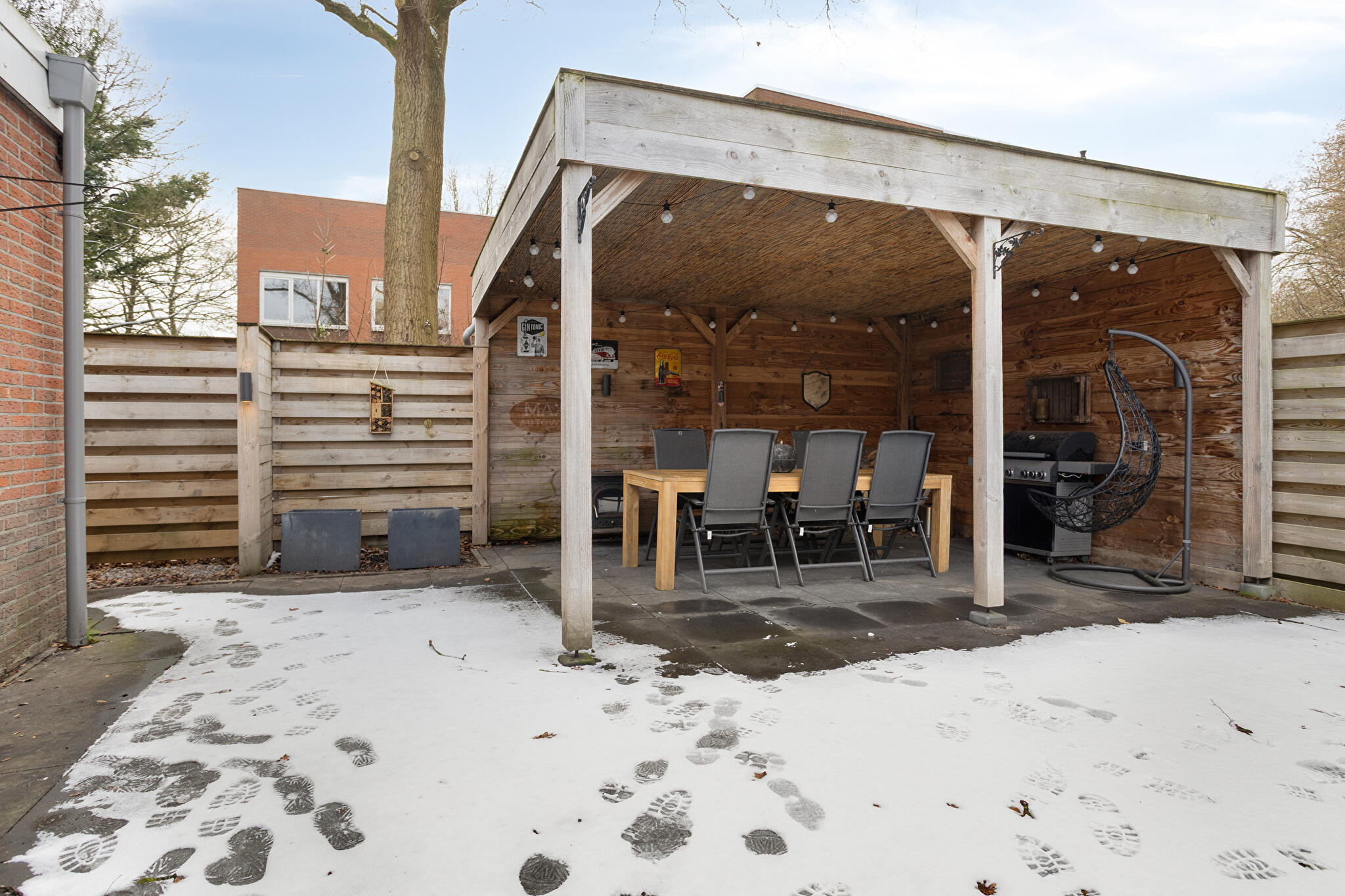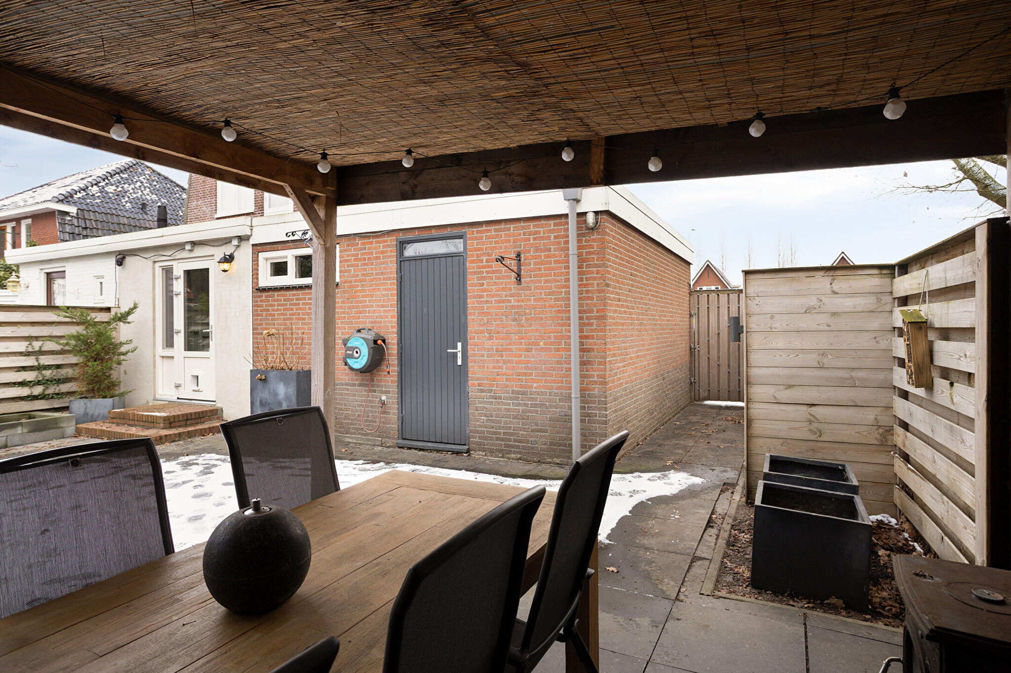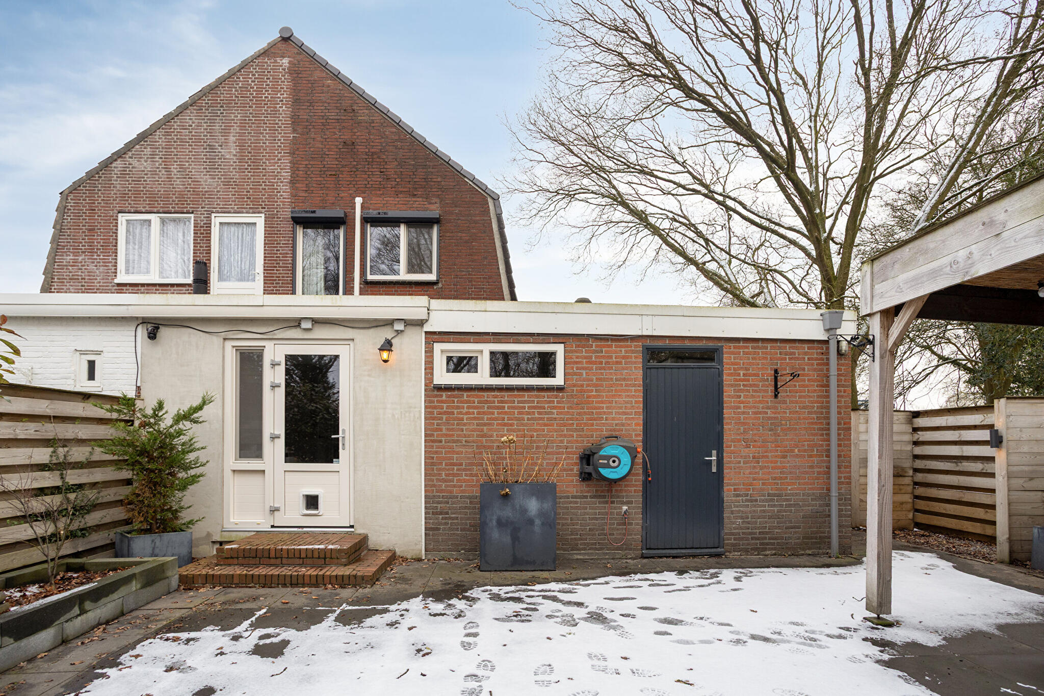 Buitenruimte: de onderhoudsvriendelijke achtertuin op het noordwesten biedt een sfeervolle overkapping. Verder beschikt de woning over een aangebouwde stenen garage en een eigen oprit met plaats voor meerdere auto’s.