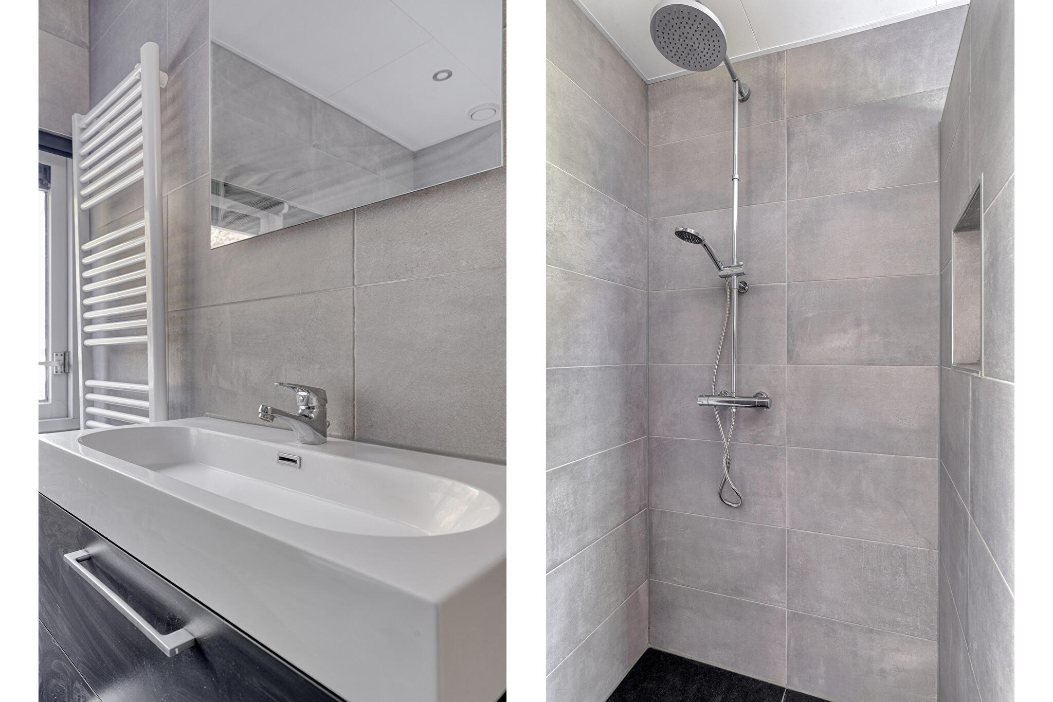 Eerste verdieping: overloop, 3 slaapkamers, moderne badkamer met douche, vaste wastafel met meubel, tweede wandcloset en designradiator.