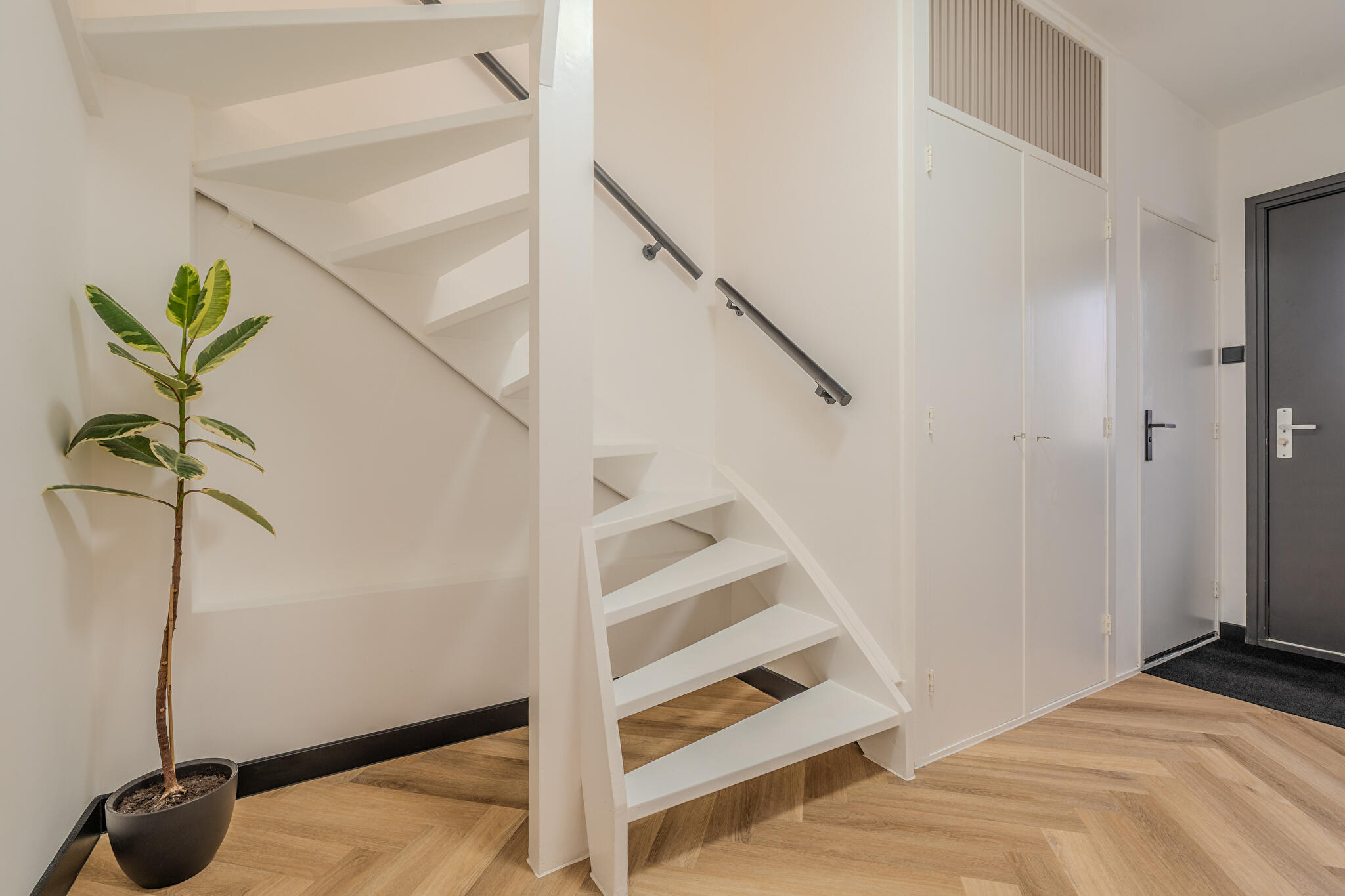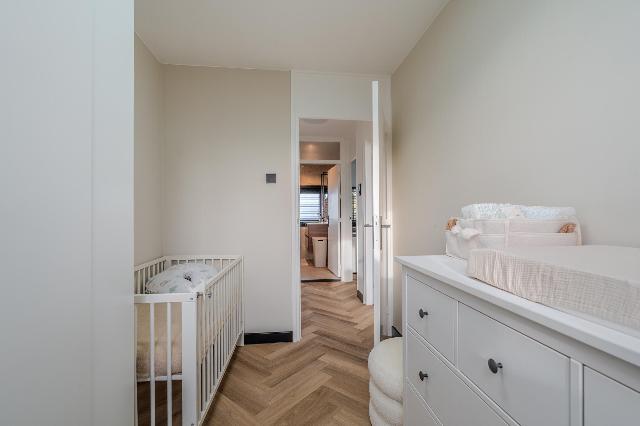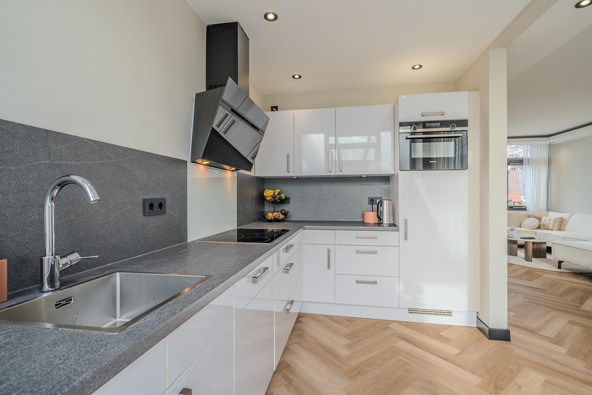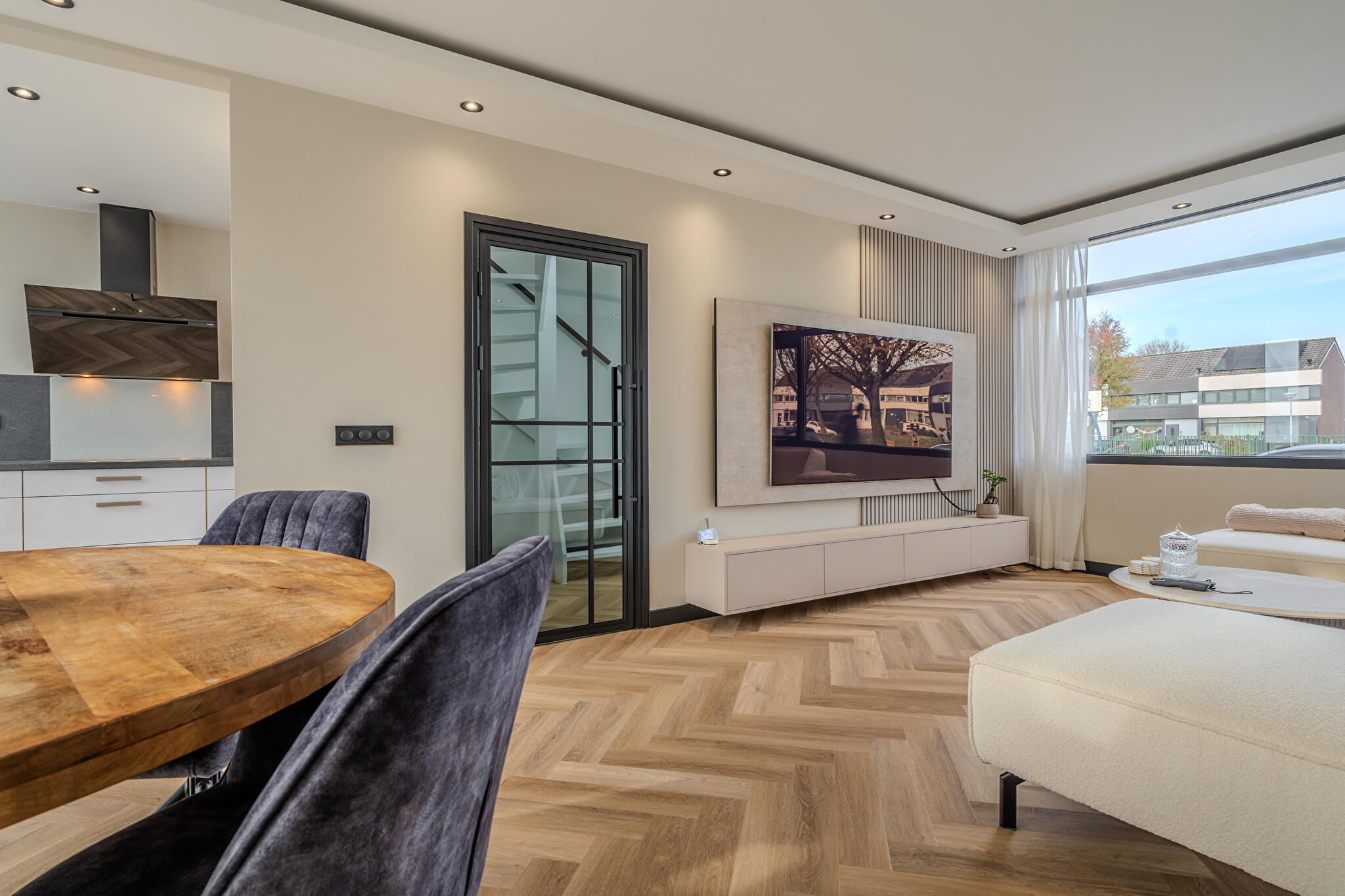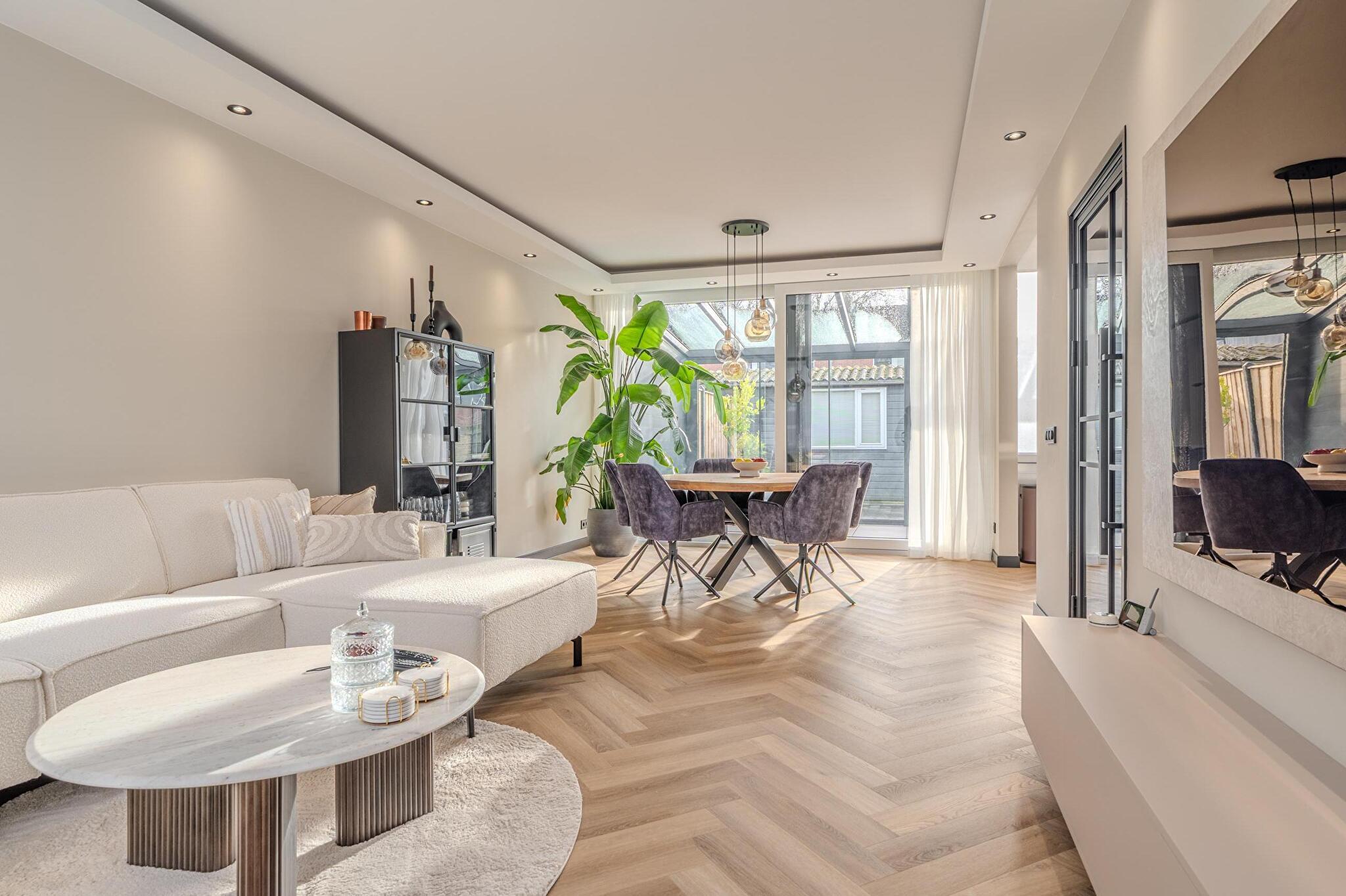 Begane grond: ruime hal/entree met trapopgang naar de eerste verdieping, moderne toiletruimte met wandcloset, bergkast, lichte doorzonkamer met grote stalen deur, schuifpui en voorzien van stijlvolle visgraatvloer die perfect aansluit bij het moderne afwerkingsniveau, een nieuwe open keuken met moderne hoekopstelling en inbouwapparatuur. Vanuit zowel de woonkamer als de keuken is er direct toegang tot het terras en de royale tuinkamer.