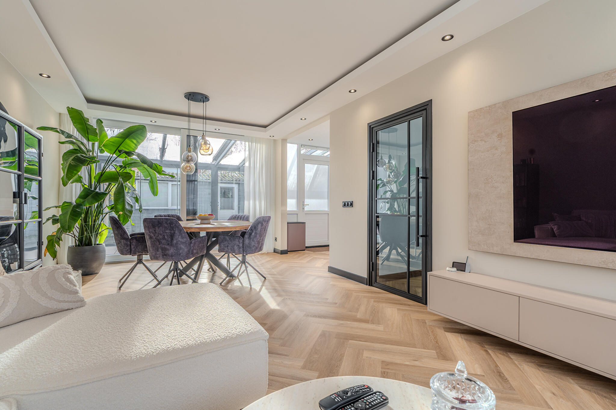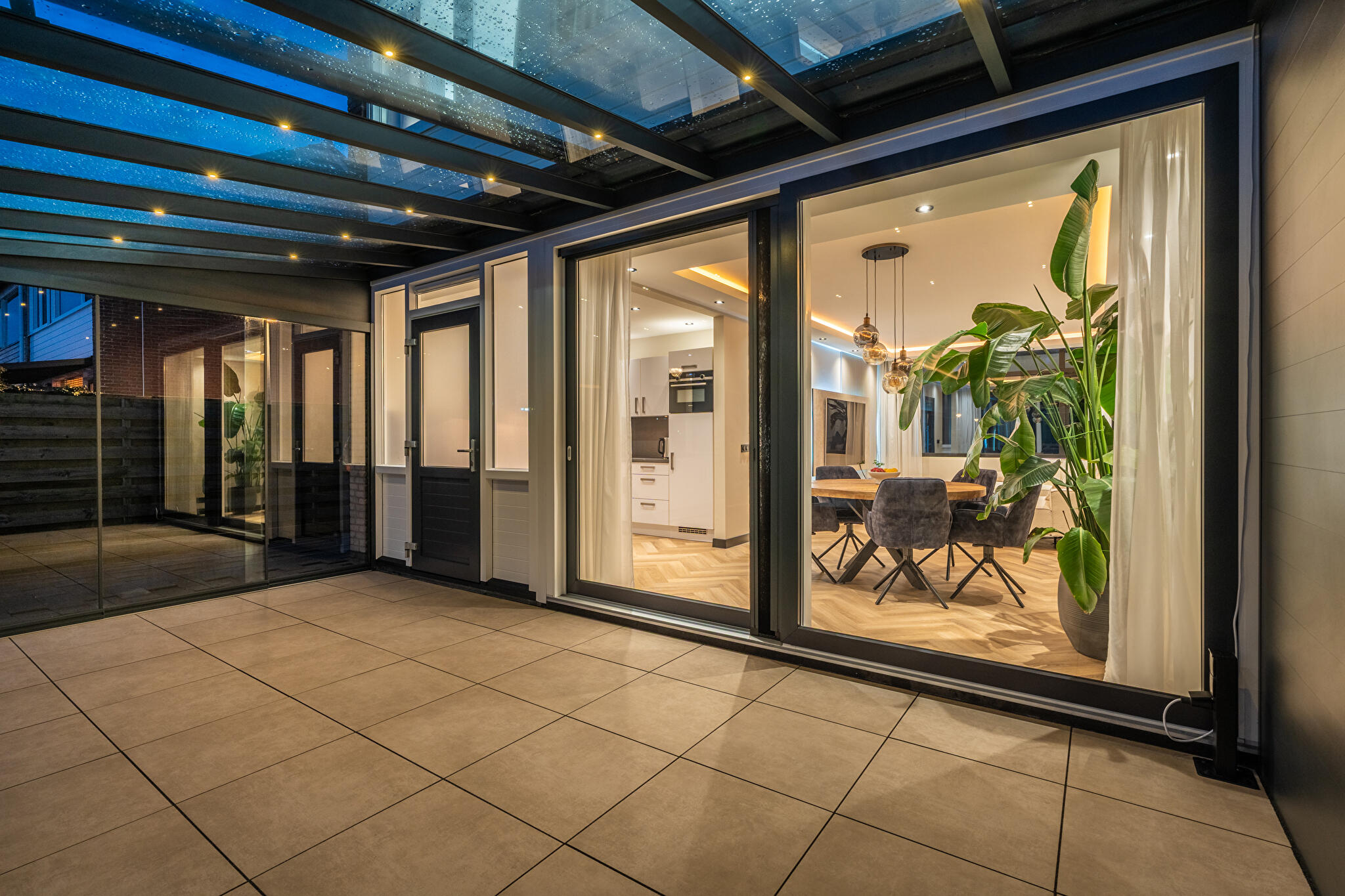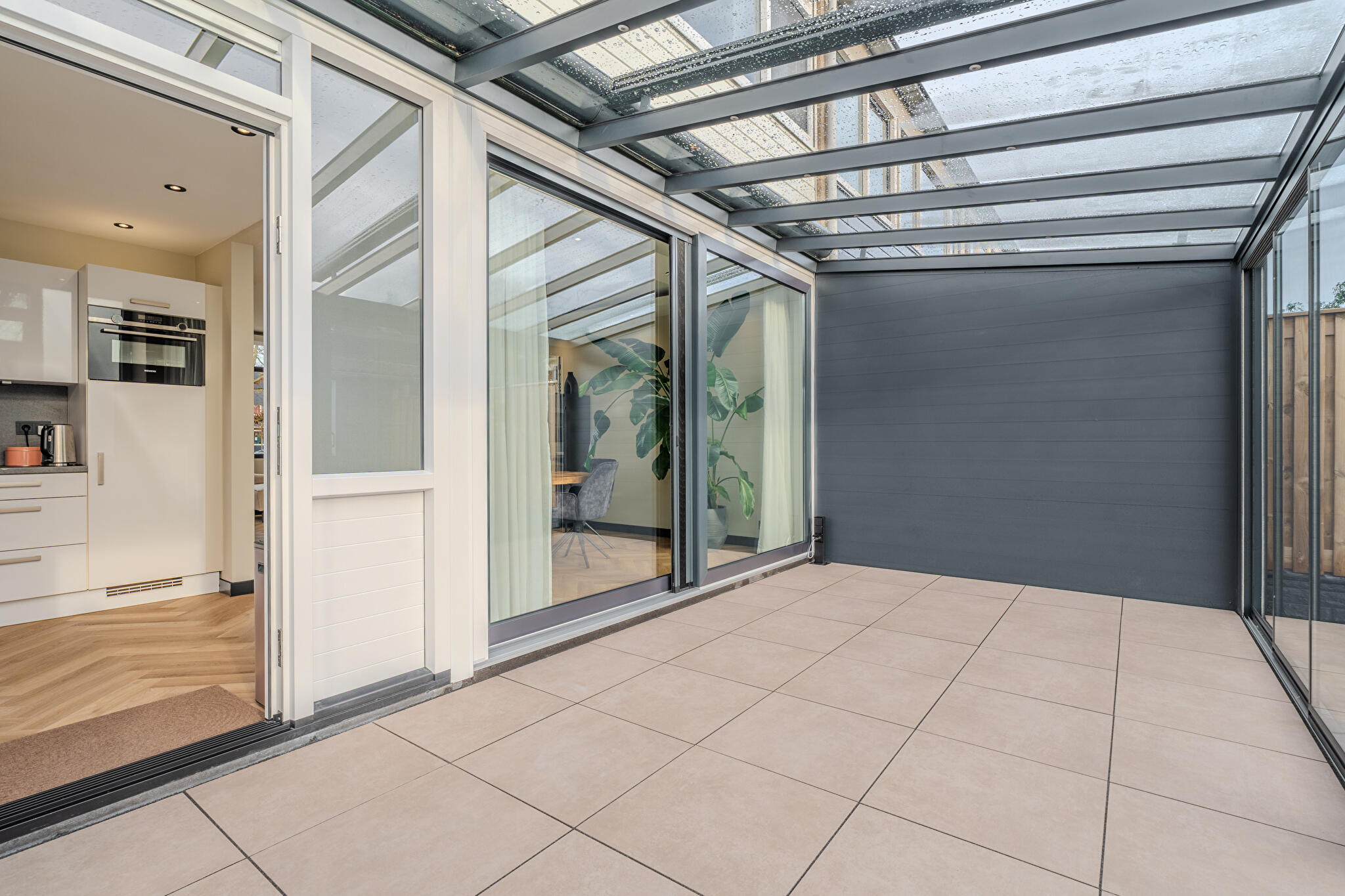 -tuinkamer met glazen dak (met zonwering en verlichting) en glazen schuifdeuren;