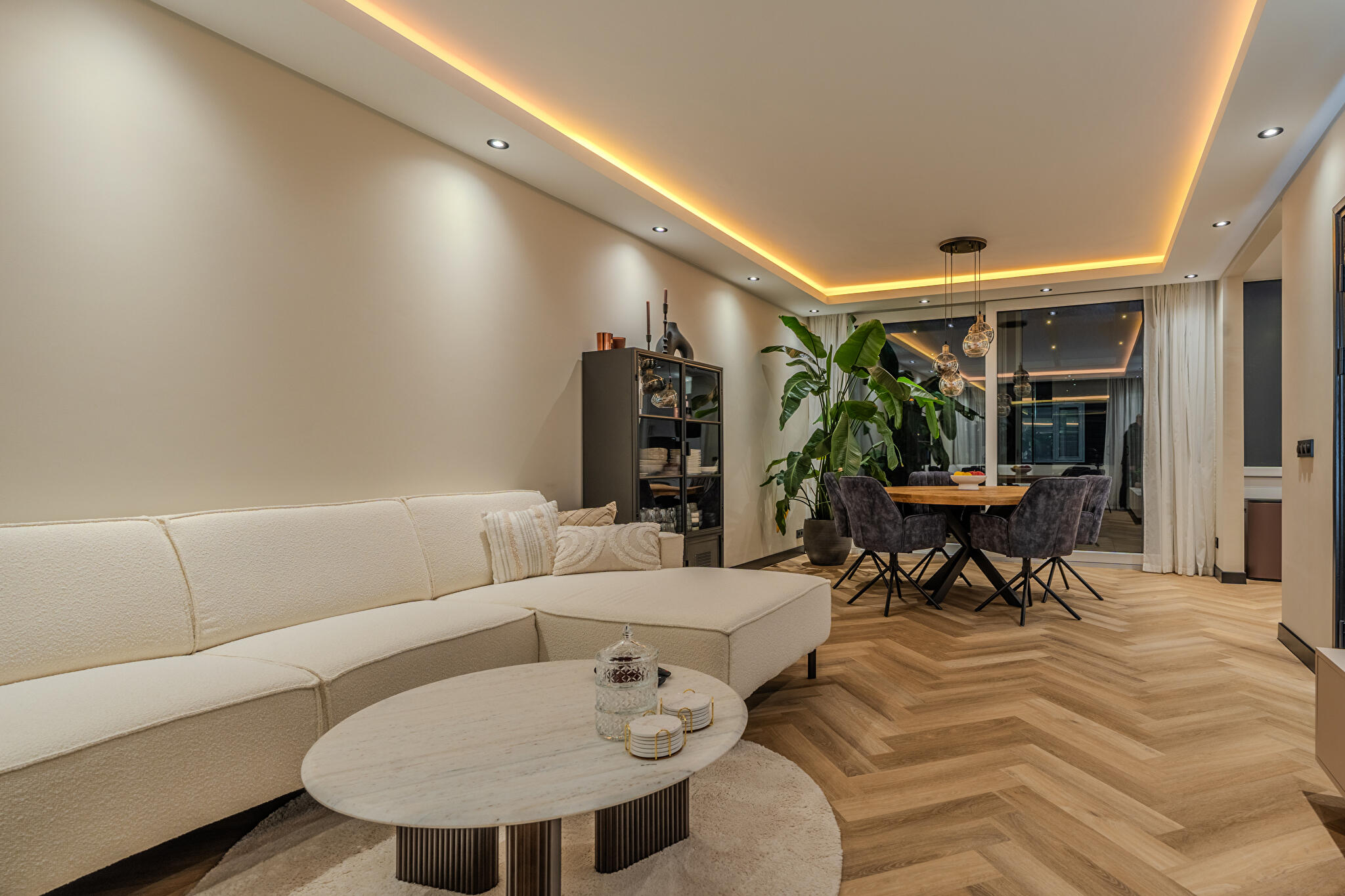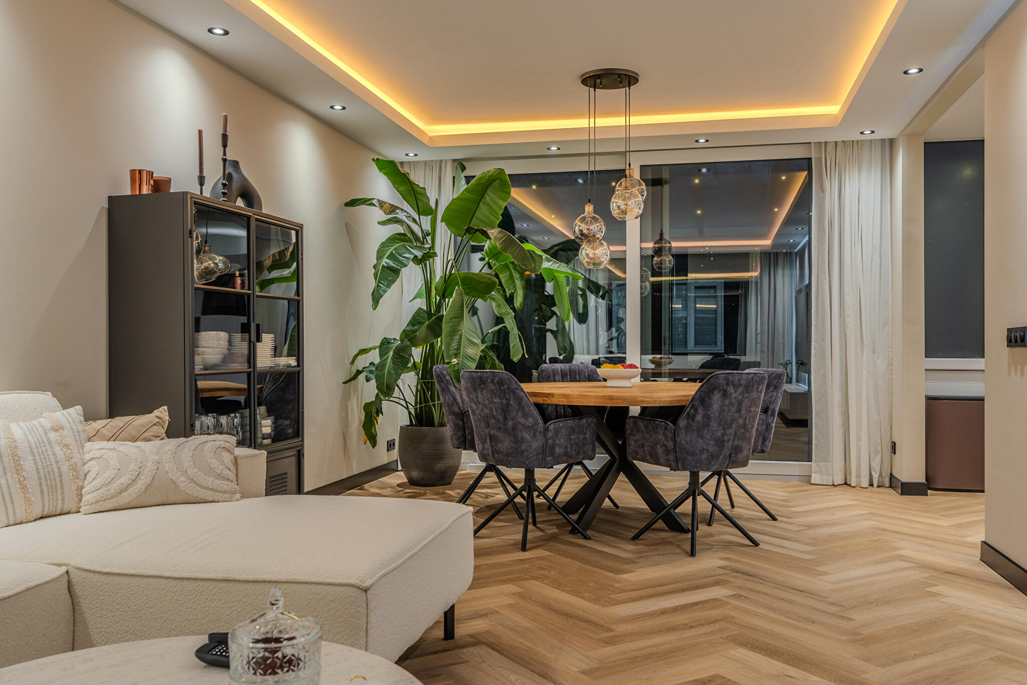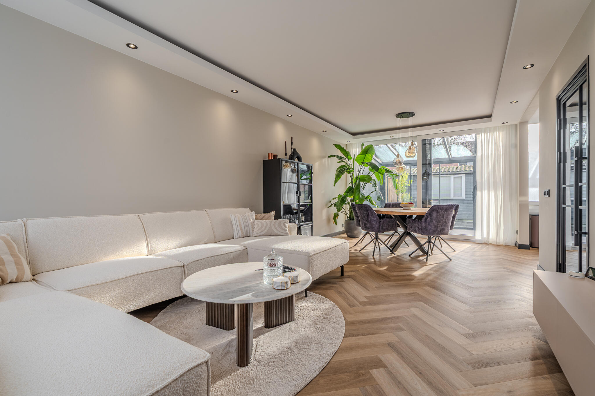 -tuinkamer met glazen dak (met zonwering en verlichting) en glazen schuifdeuren;