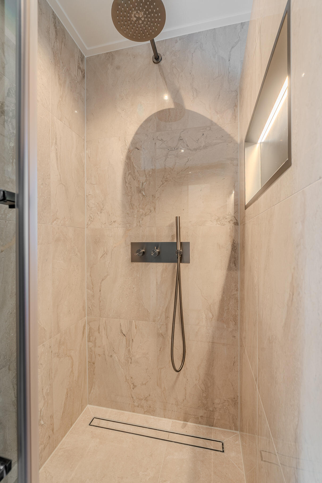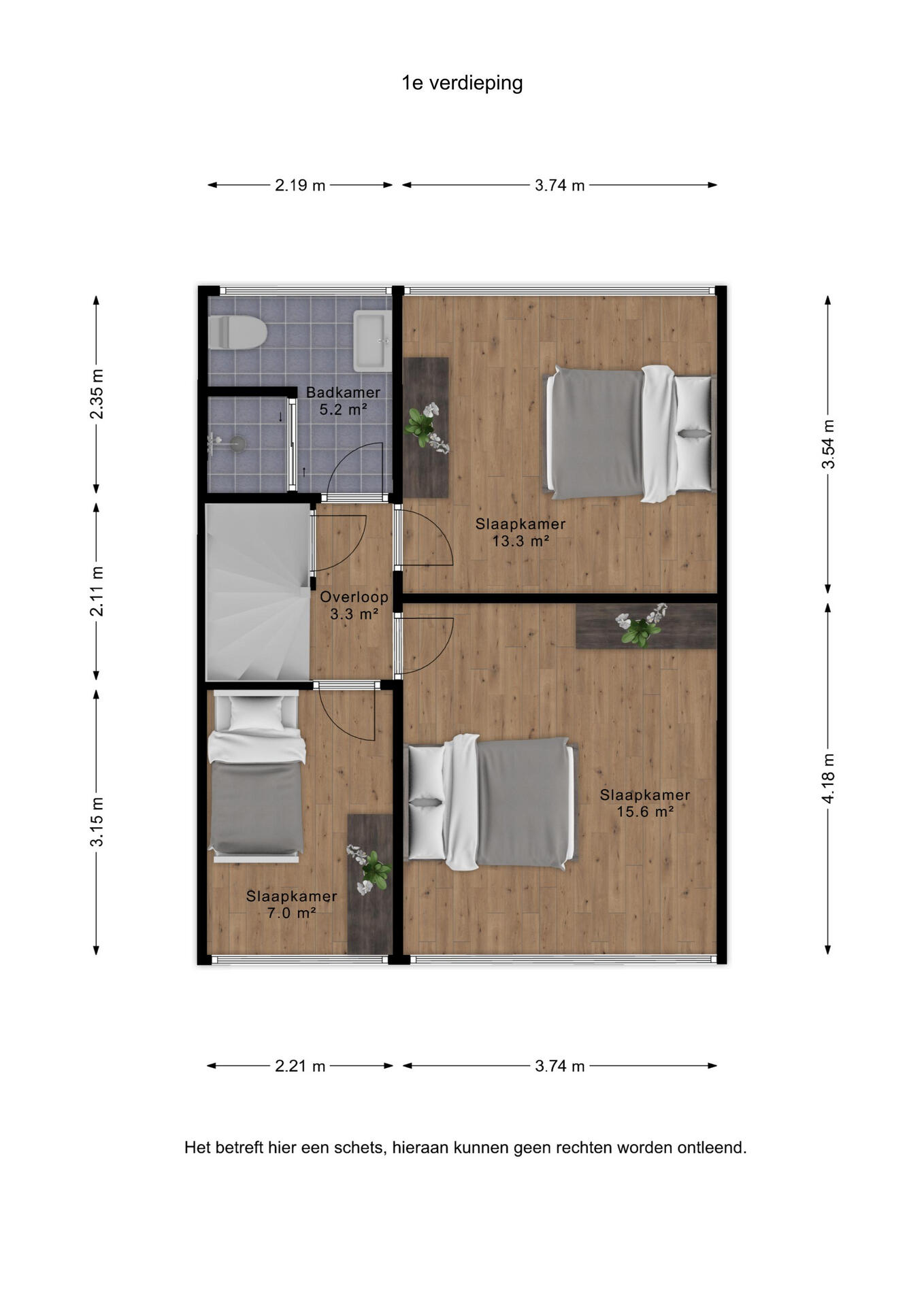 Eerste verdieping: overloop, drie ruime slaapkamers en een nieuwe, luxe badkamer voorzien van ruime douche met stortdouche, tweede wandcloset en wastafel met meubel en vloerverwarming.
