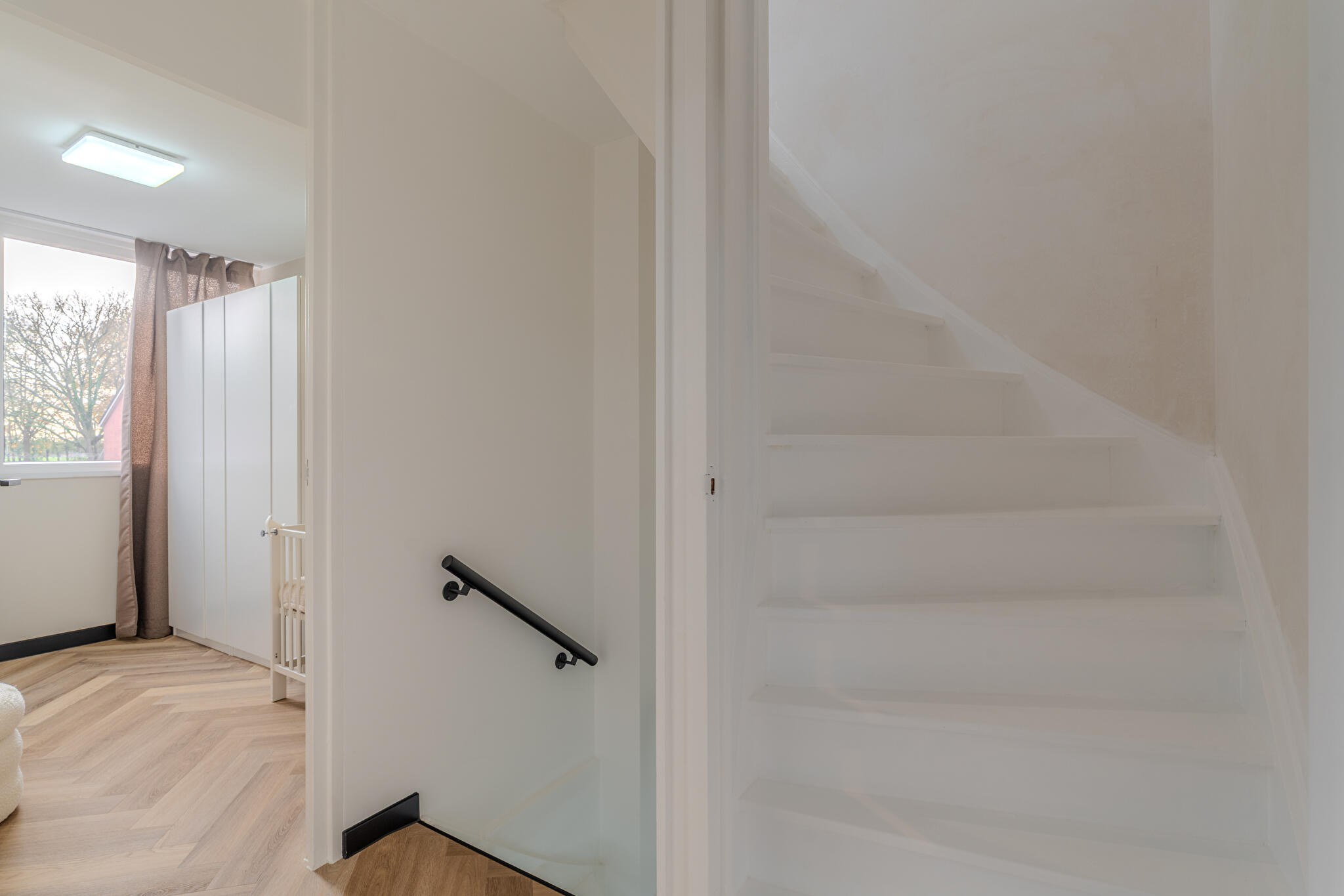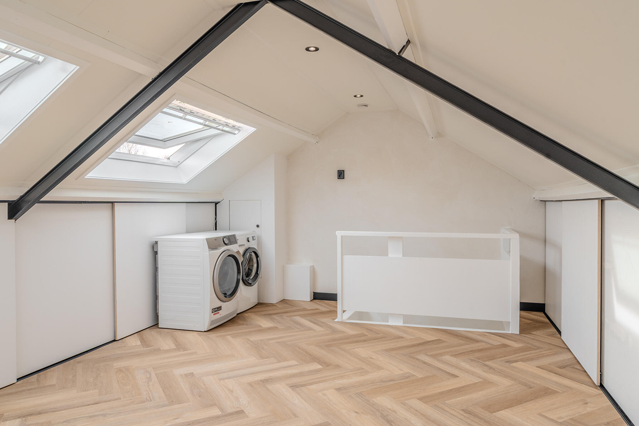 Tweede verdieping: royale vernieuwde zolderverdieping voorzien van witgoedaansluitingen, meerdere dakramen voor veel lichtinval en voldoende bergruimte achter de knieschotten, ideaal voor opslag of extra indeling naar eigen wens, bijvoorbeeld extra slaapkamers.