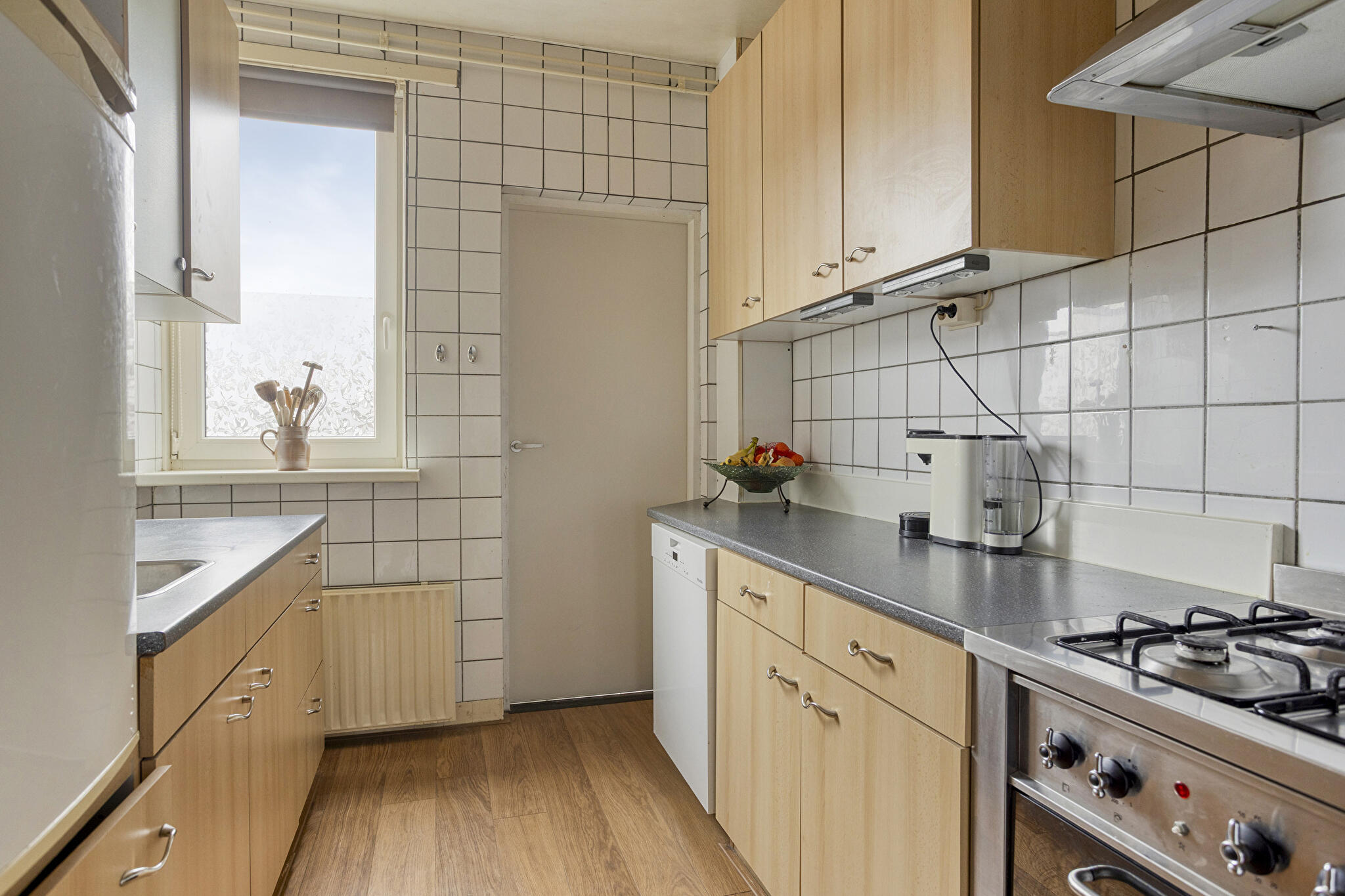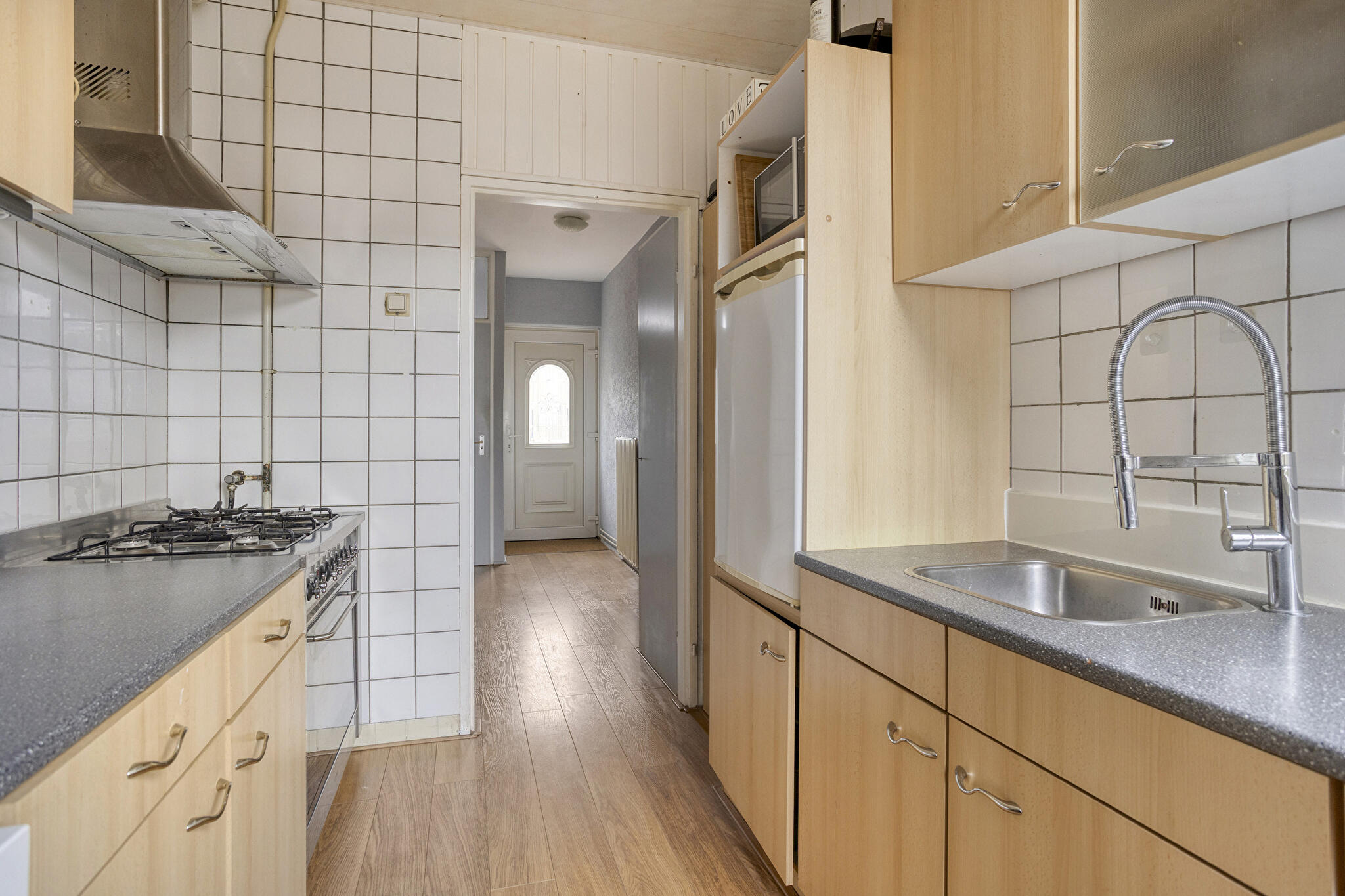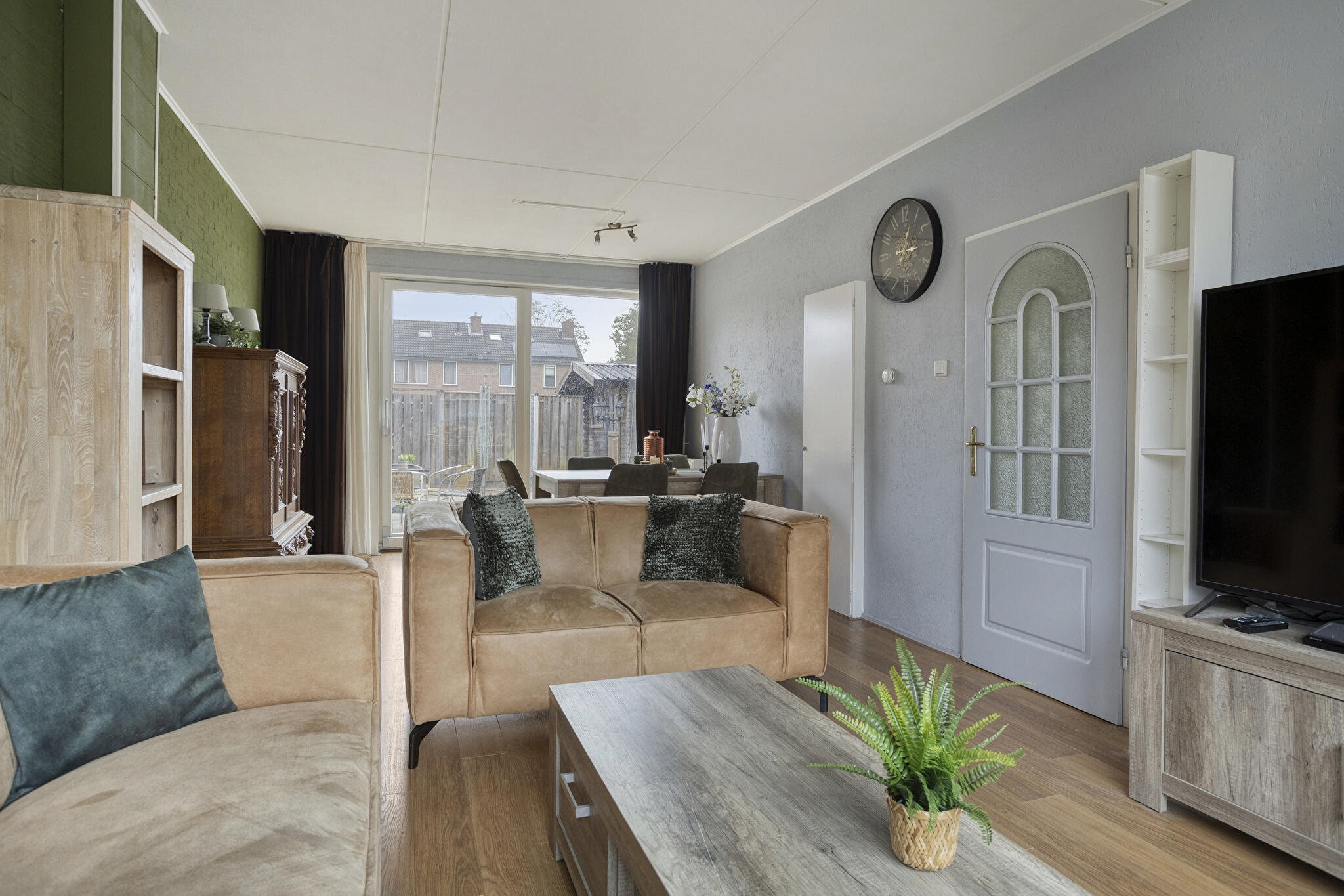 Via de entree/hal met toilet en meterkast kom je in de ruime woonkamer, voorzien van een nette vloer en veel lichtinval. De gesloten keuken biedt voldoende ruimte om te koken en grenst aan de praktische bijkeuken/berging. Vanuit de woonkamer of bijkeuken is er toegang tot de achtertuin, die zon en privacy combineert.