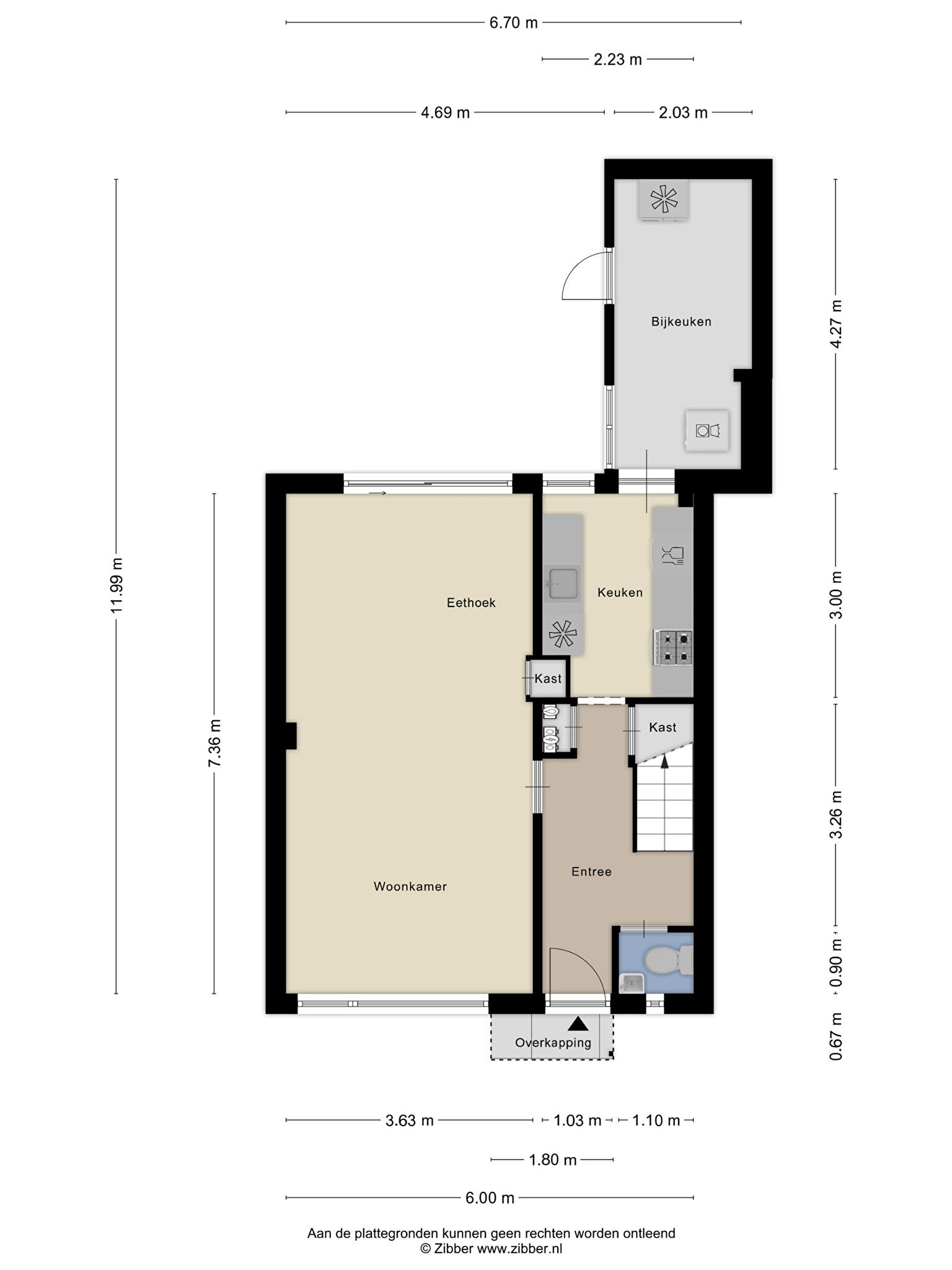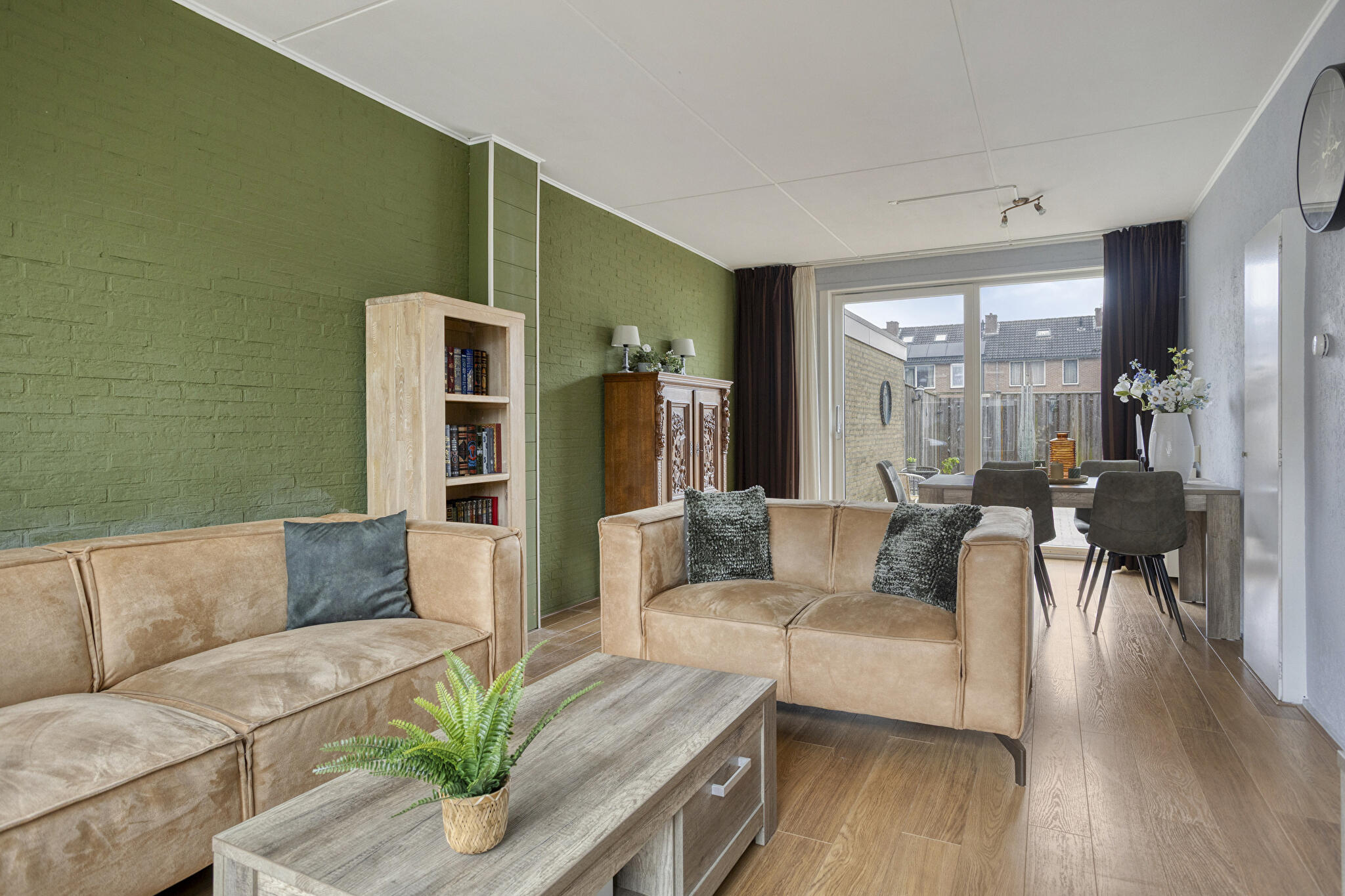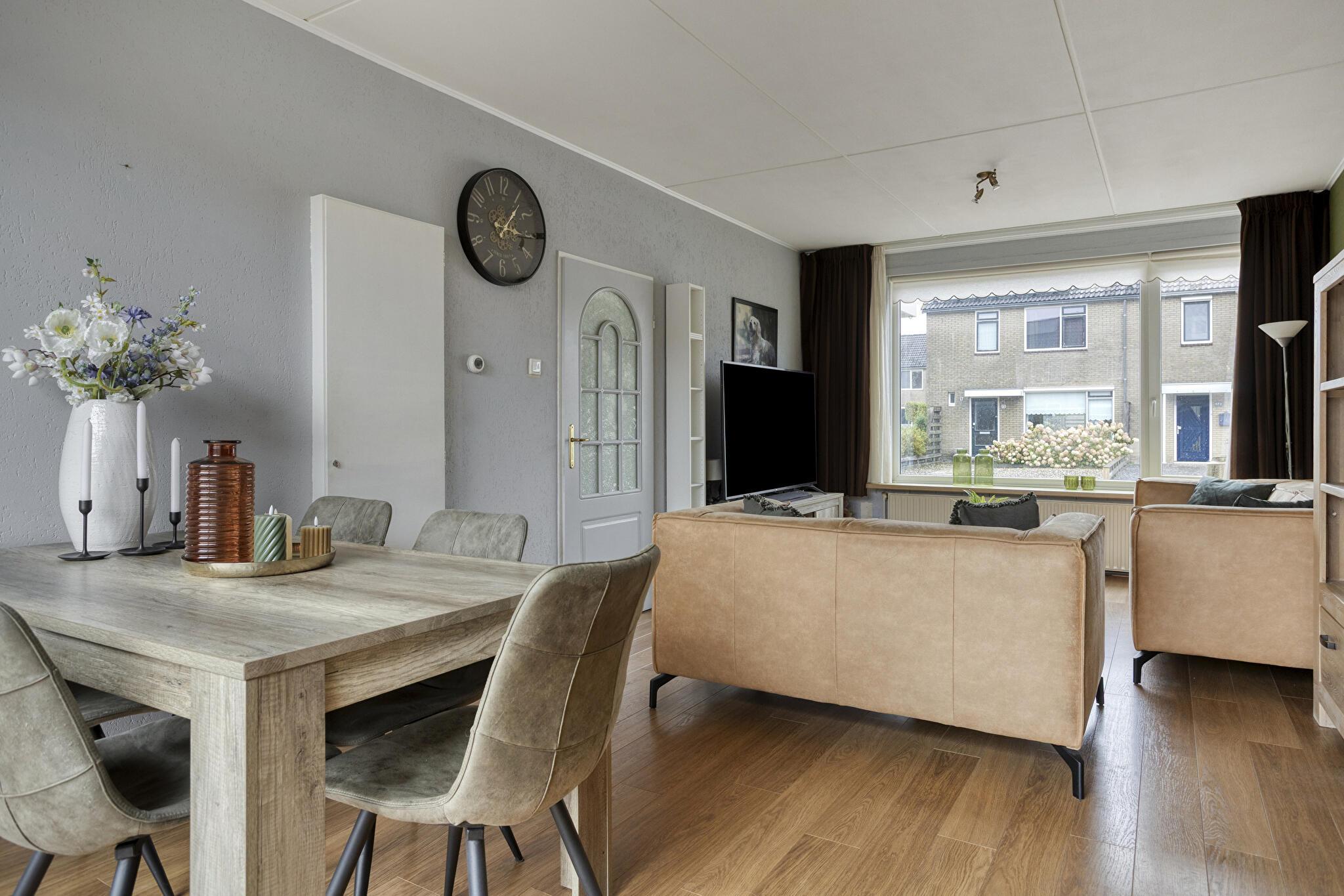 Via de entree/hal met toilet en meterkast kom je in de ruime woonkamer, voorzien van een nette vloer en veel lichtinval. De gesloten keuken biedt voldoende ruimte om te koken en grenst aan de praktische bijkeuken/berging. Vanuit de woonkamer of bijkeuken is er toegang tot de achtertuin, die zon en privacy combineert.