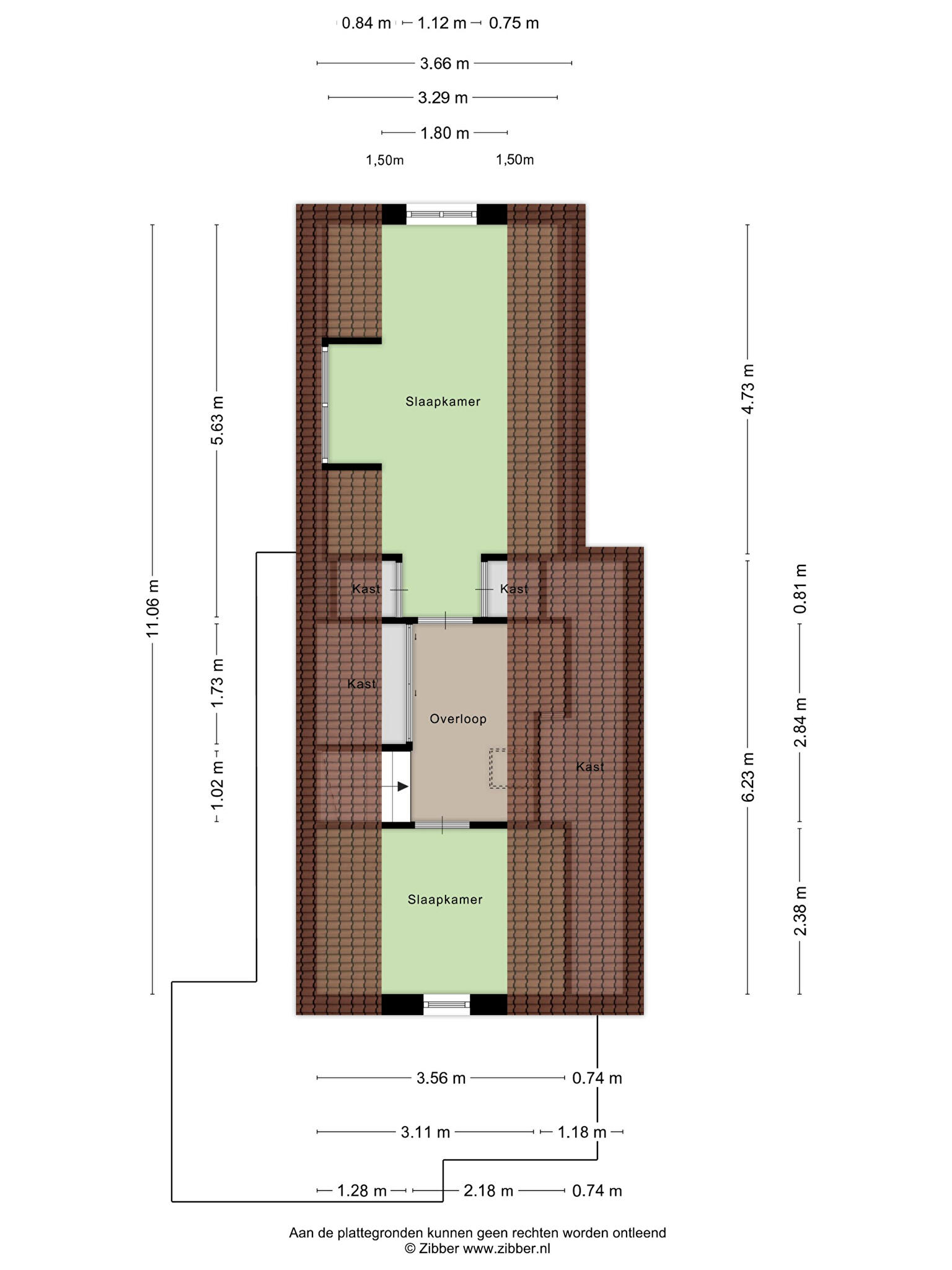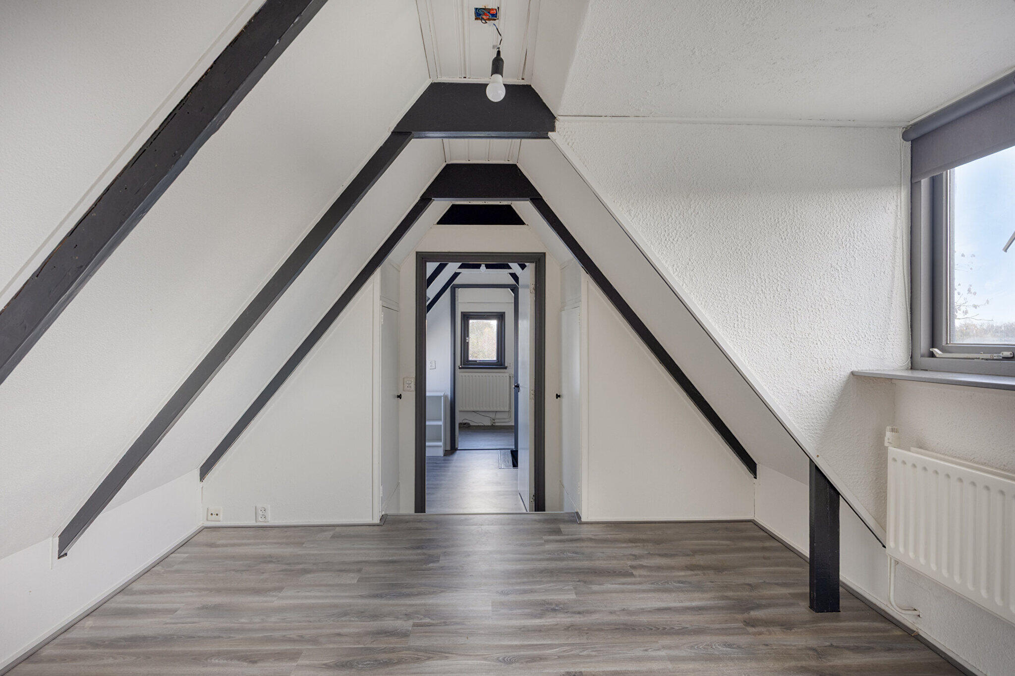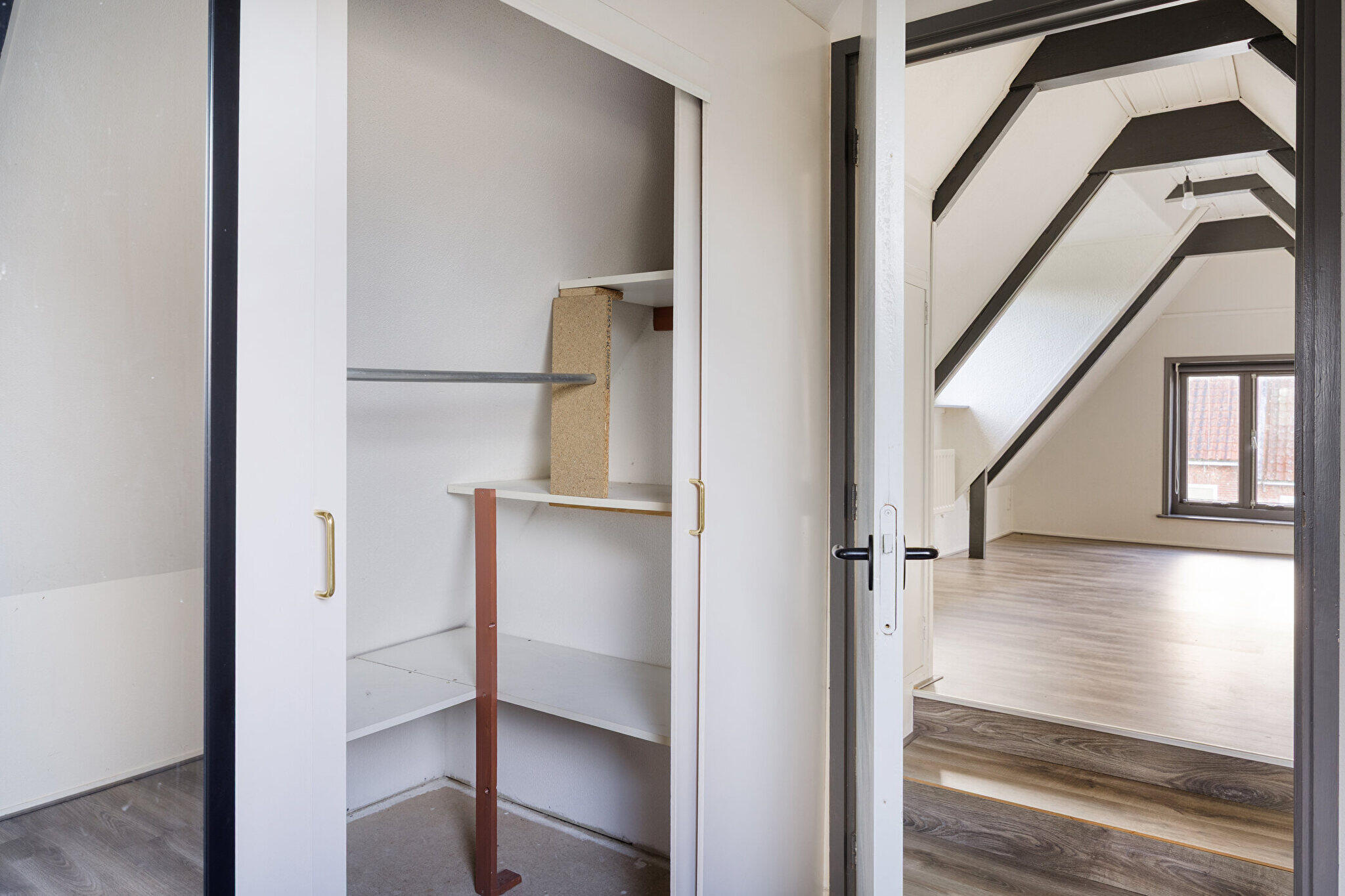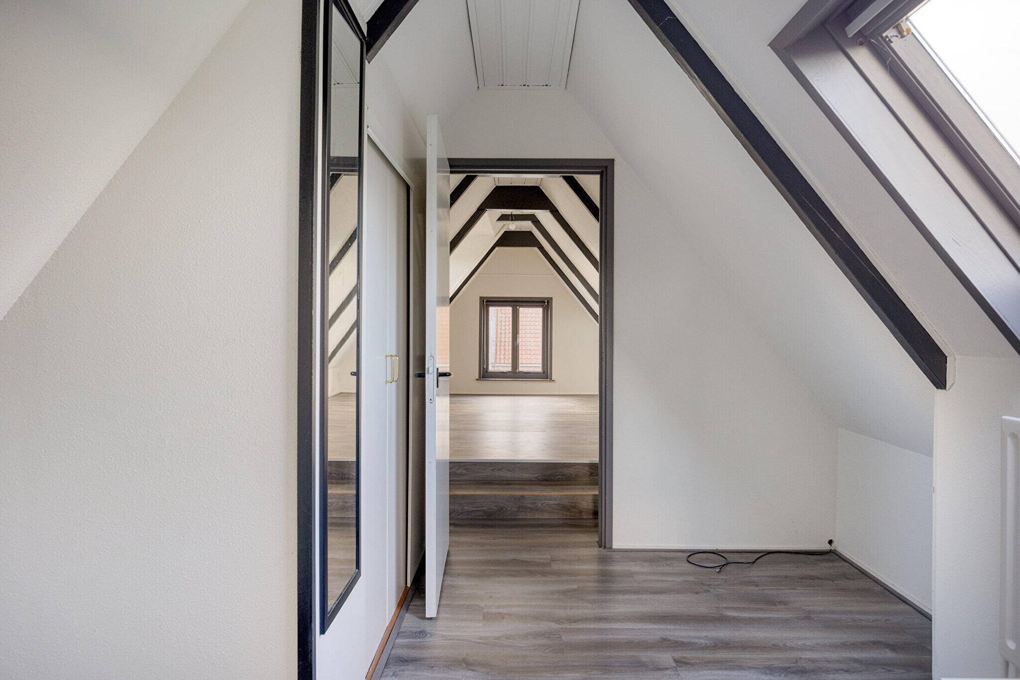 Eerste verdieping: overloop met dakraam en walk-in-closet/bergkasten, totaal 2 slaapkamers (waarvan 1 met dakkapel en 1 met vaste kasten).