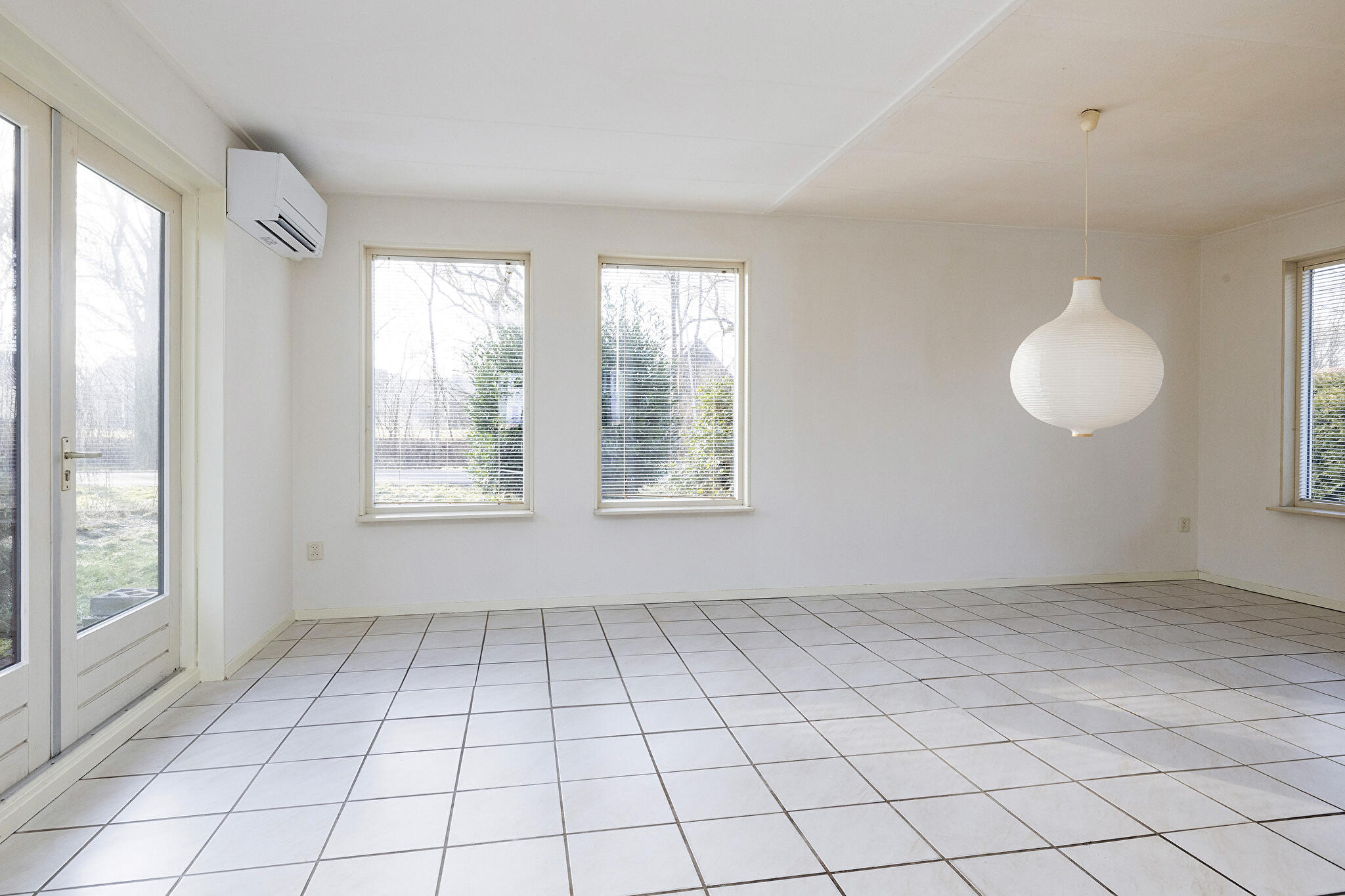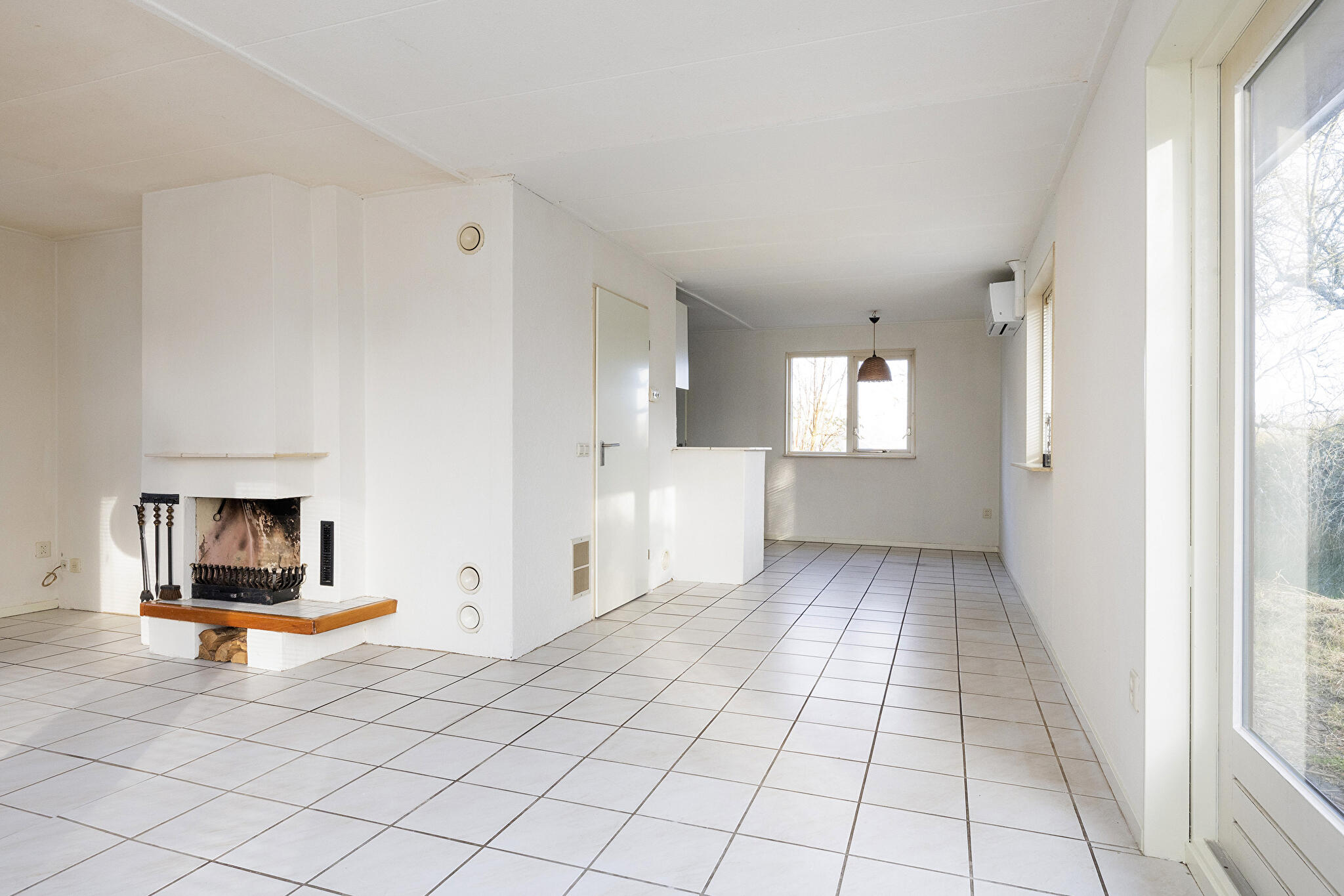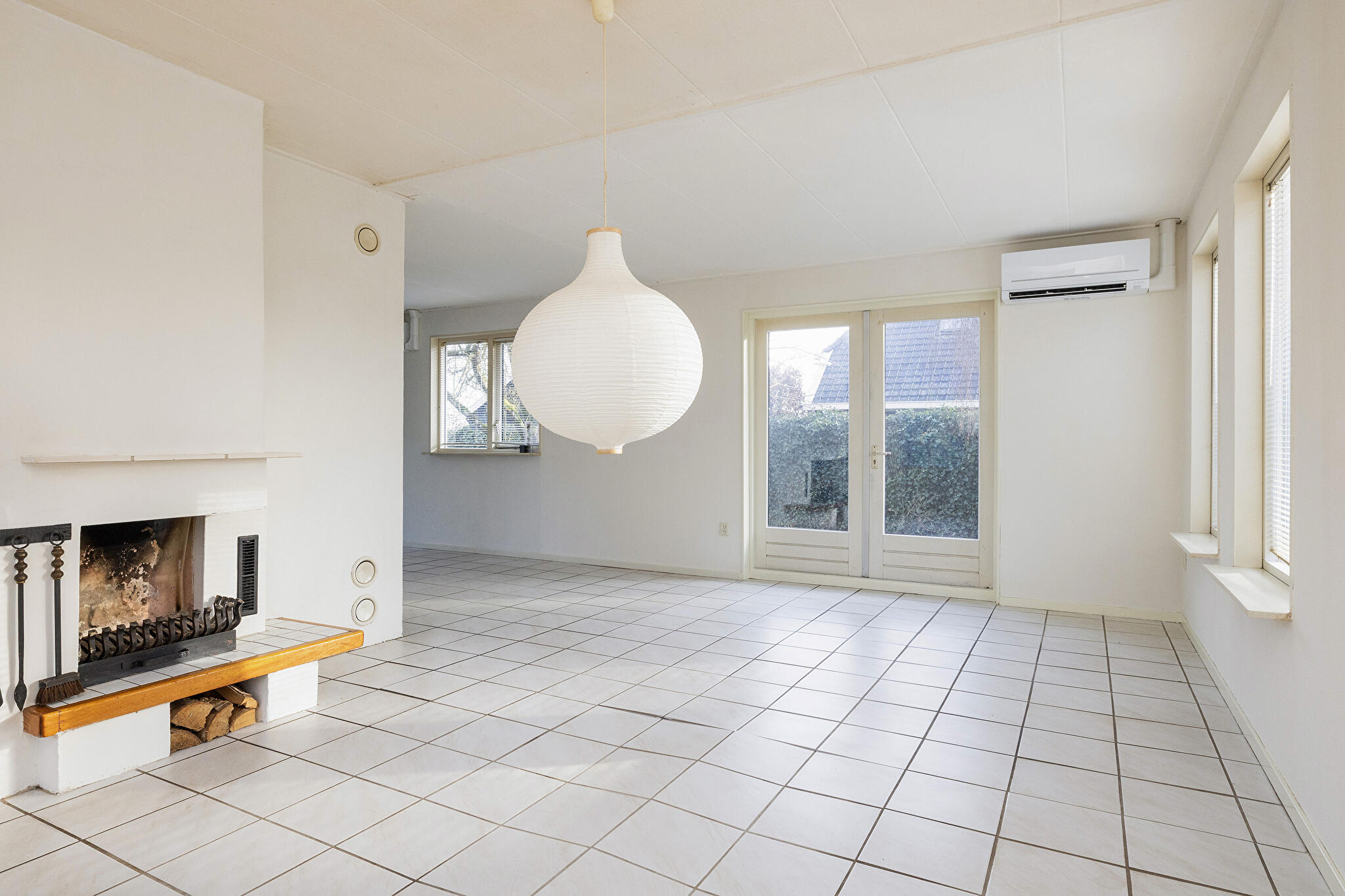 - lichte woonkamer met open haard en dubbele deuren naar de tuin;
