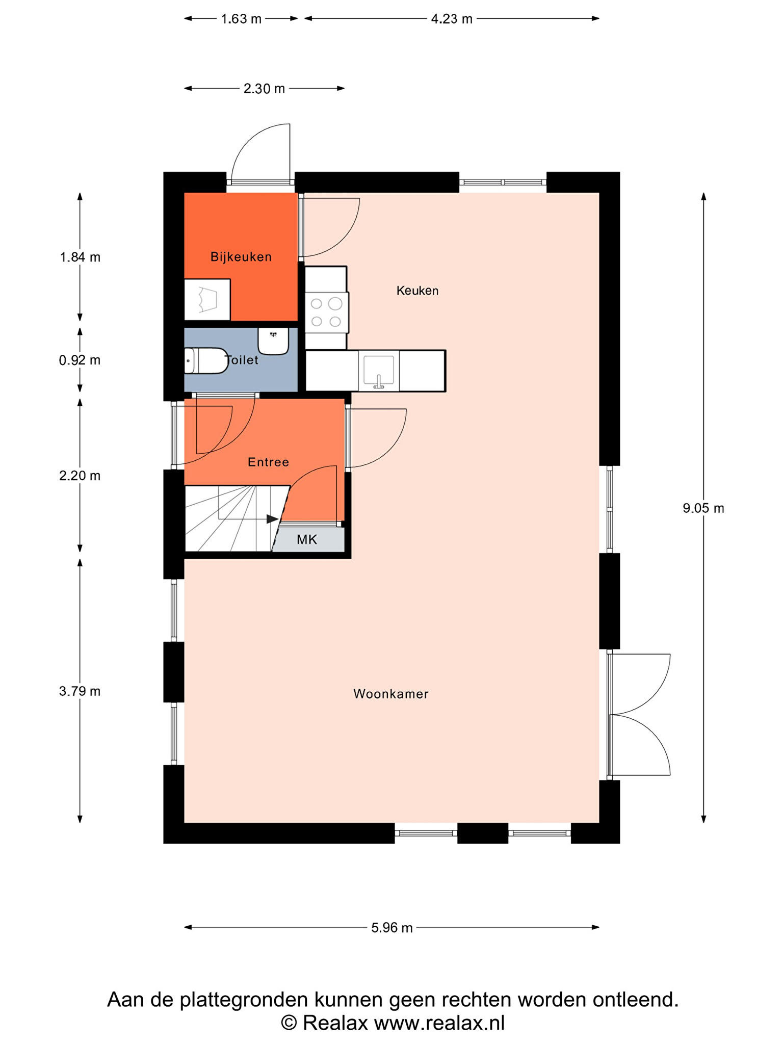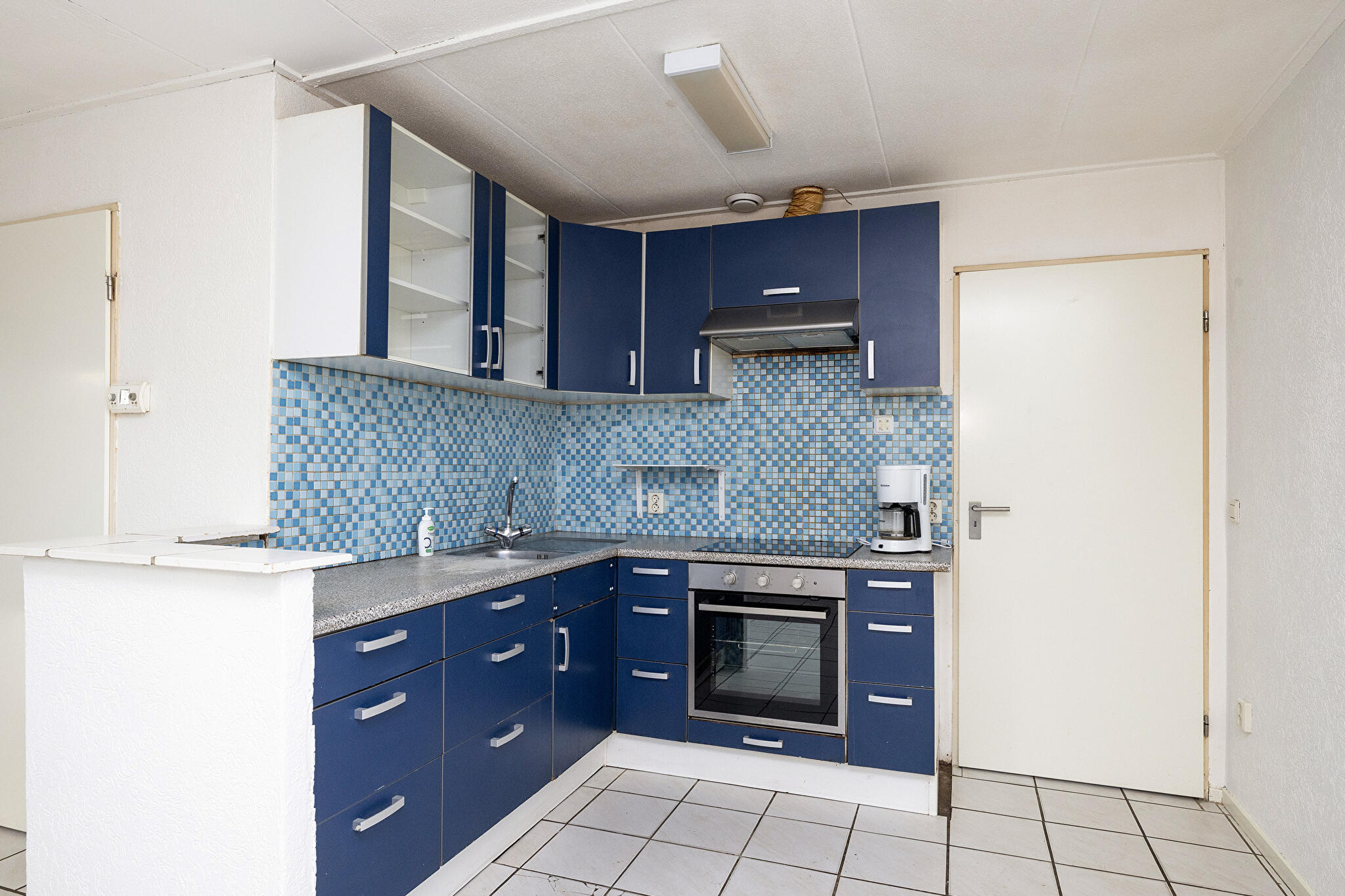 - open keuken met enkele inbouwapparatuur en doorgang naar de bijkeuken;