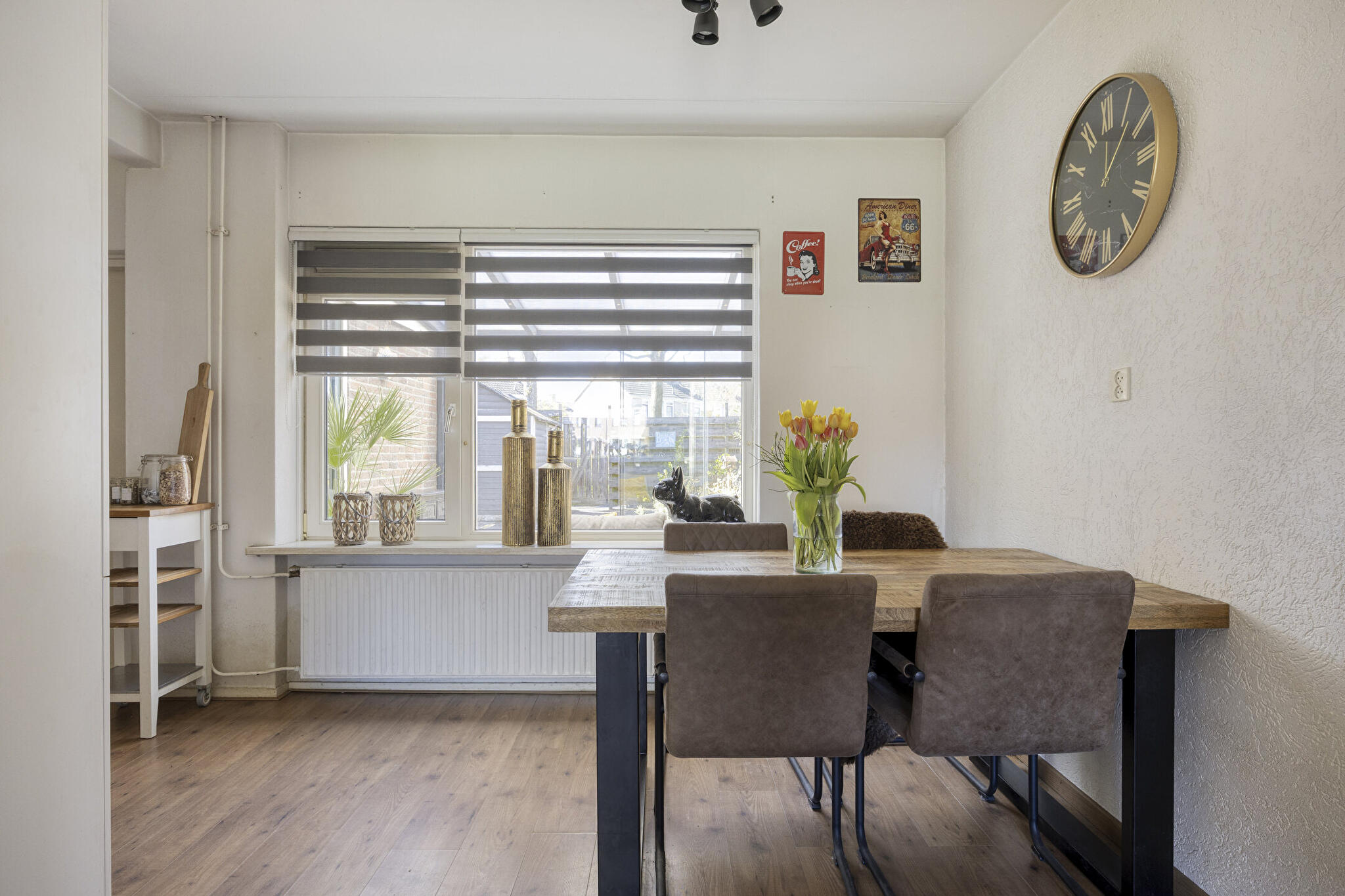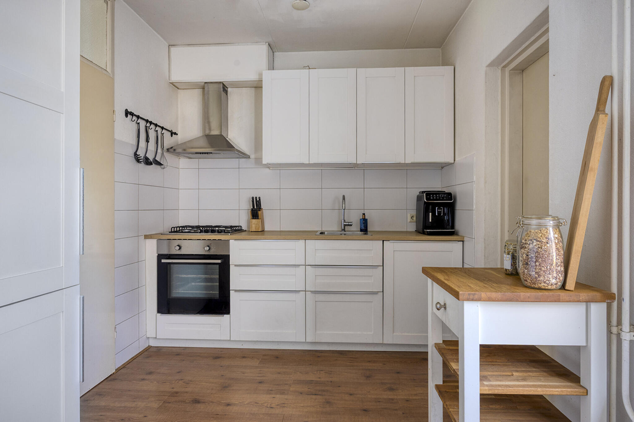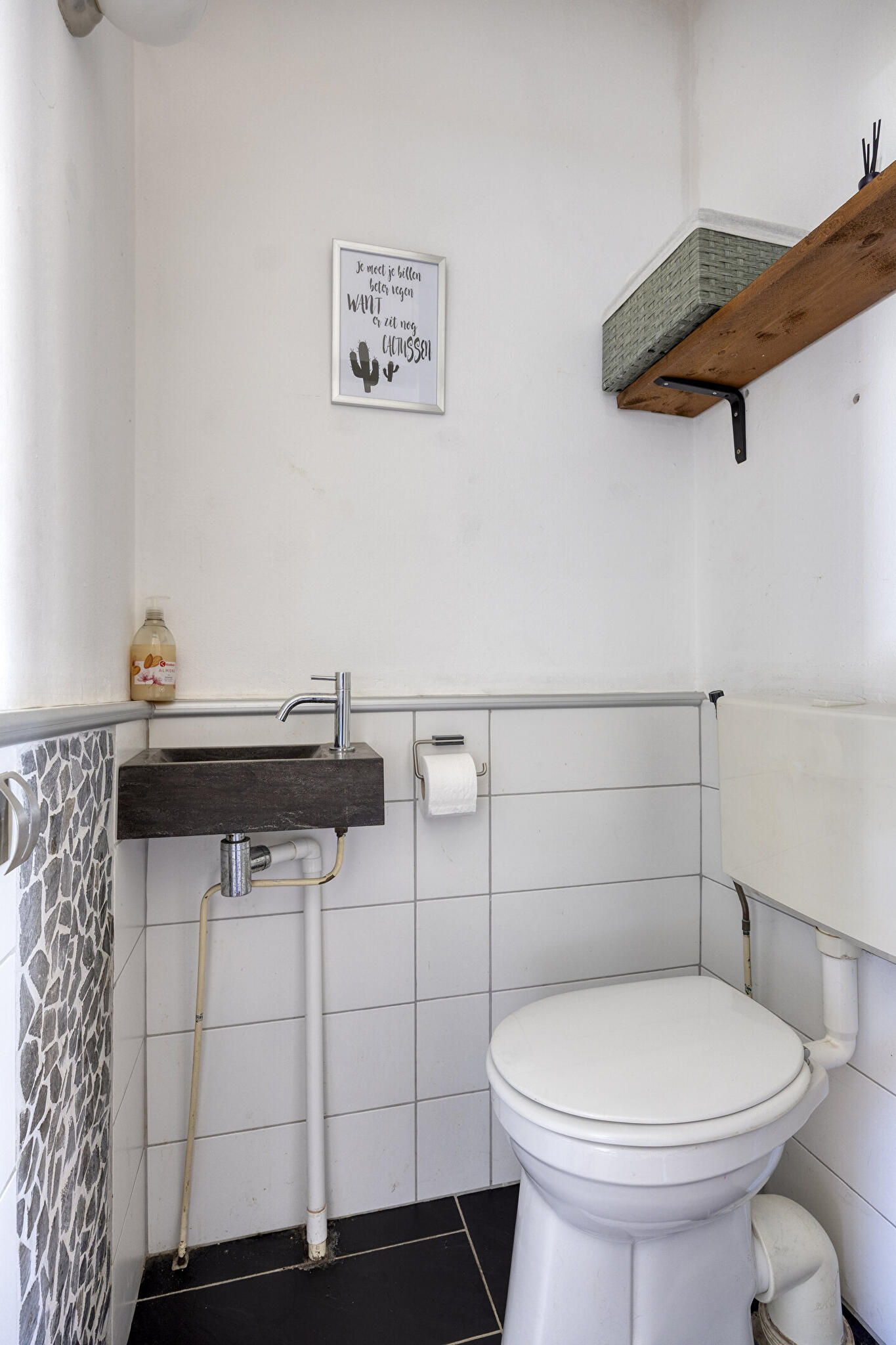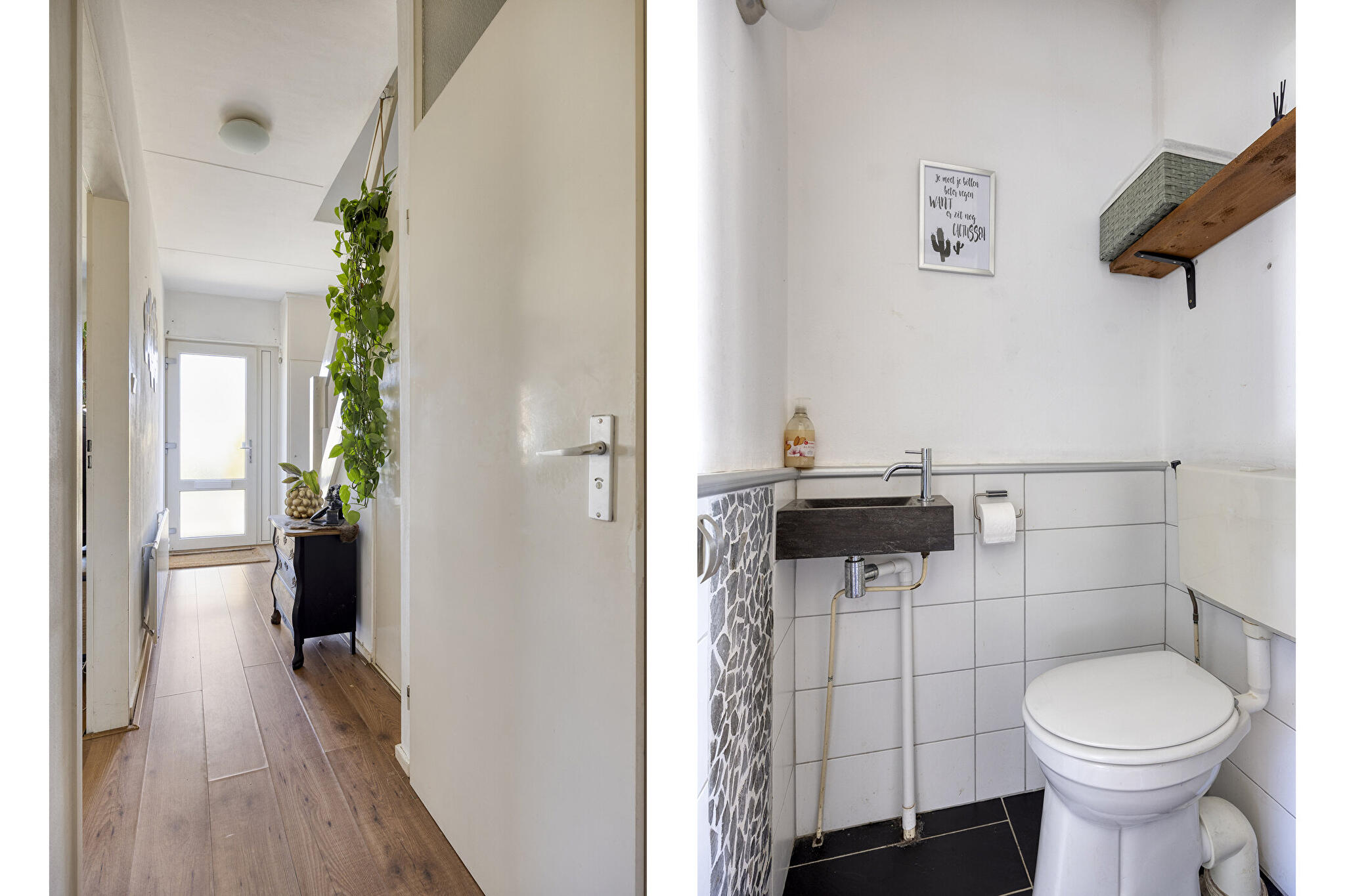 Begane grond: entree/hal, toiletruimte met fonteintje, trapopgang naar de verdieping, lichte doorzonkamer met nette laminaatvloer. De praktische keuken is voorzien van vaatwasser, oven, gasfornuis en afzuigsysteem. Vanuit de keuken loopt u de ruime berging in, ideaal voor hobby, klus of extra opslag, met directe toegang tot het terras met overkapping – perfect voor gezellige buitenmomenten.