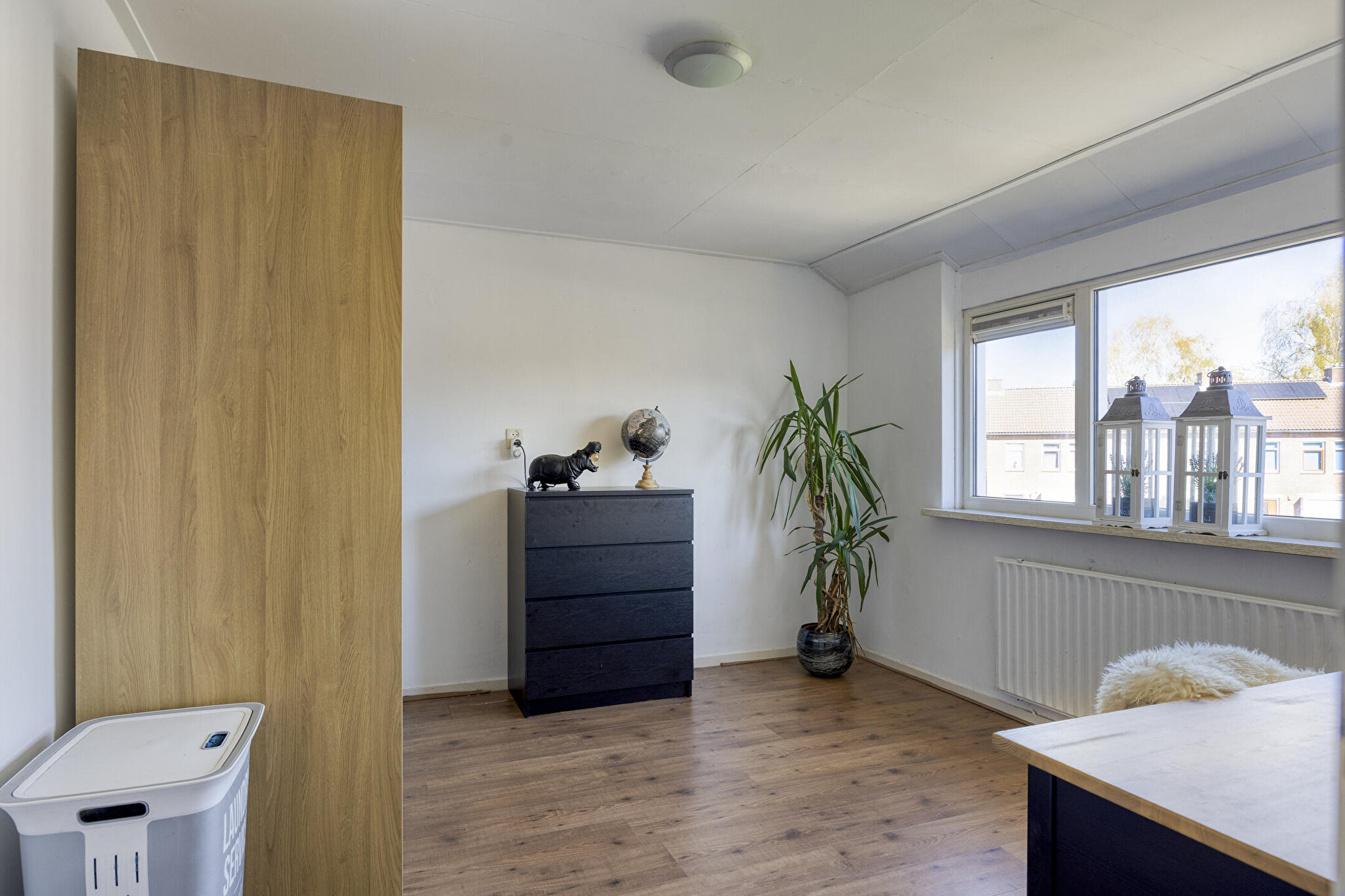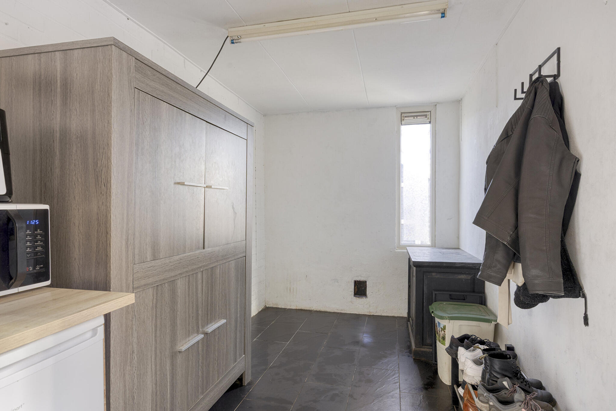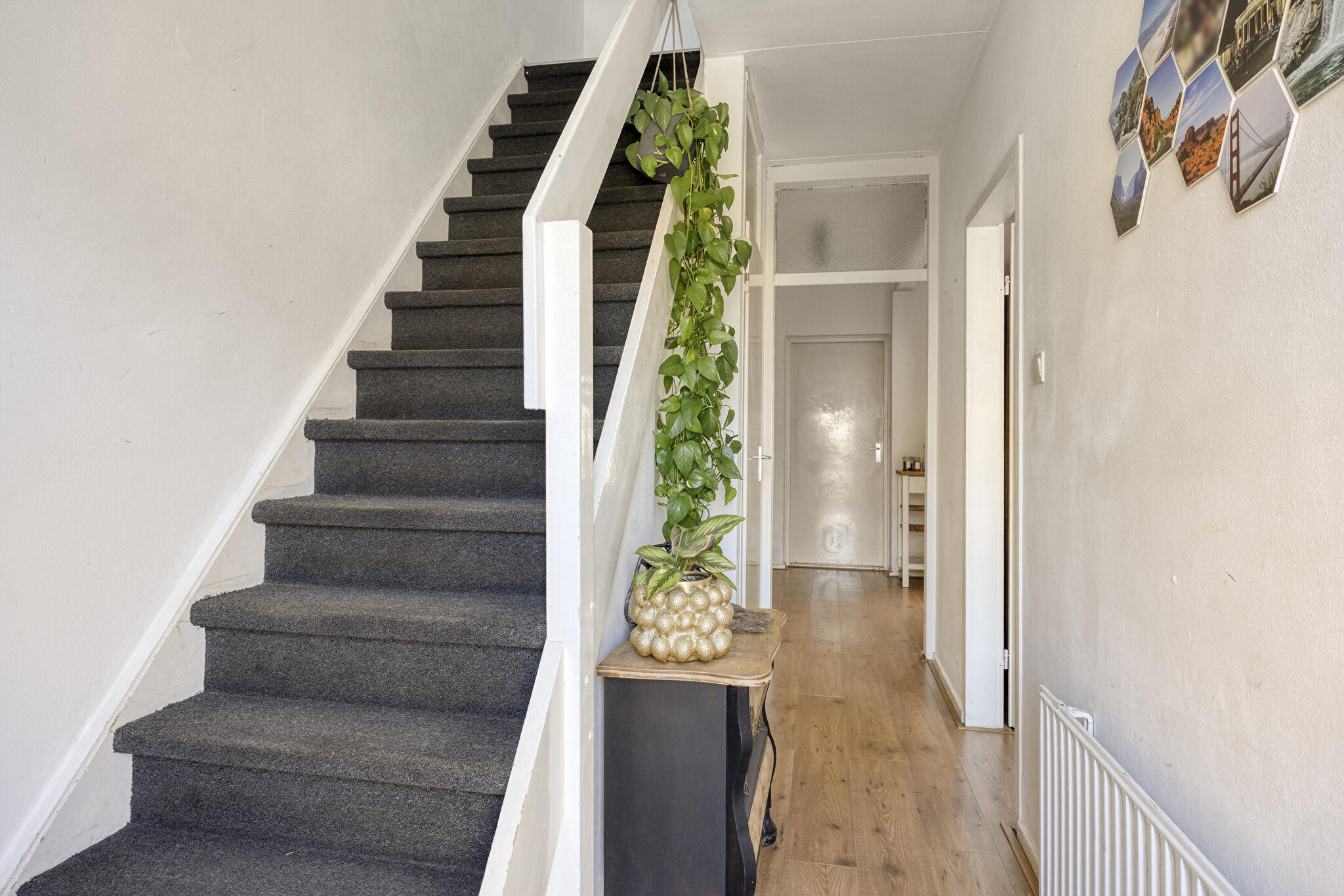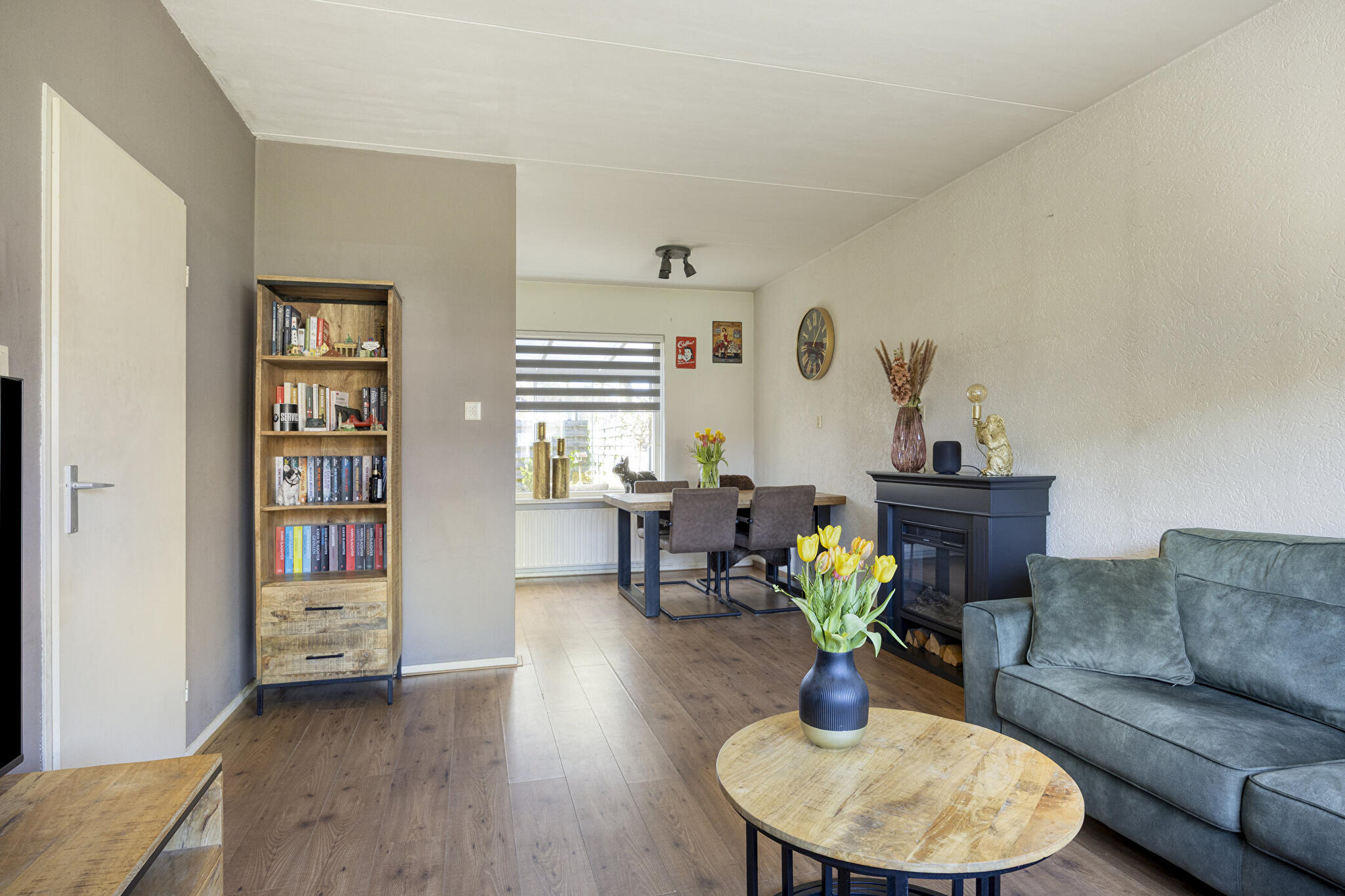 Begane grond: entree/hal, toiletruimte met fonteintje, trapopgang naar de verdieping, lichte doorzonkamer met nette laminaatvloer. De praktische keuken is voorzien van vaatwasser, oven, gasfornuis en afzuigsysteem. Vanuit de keuken loopt u de ruime berging in, ideaal voor hobby, klus of extra opslag, met directe toegang tot het terras met overkapping – perfect voor gezellige buitenmomenten.
