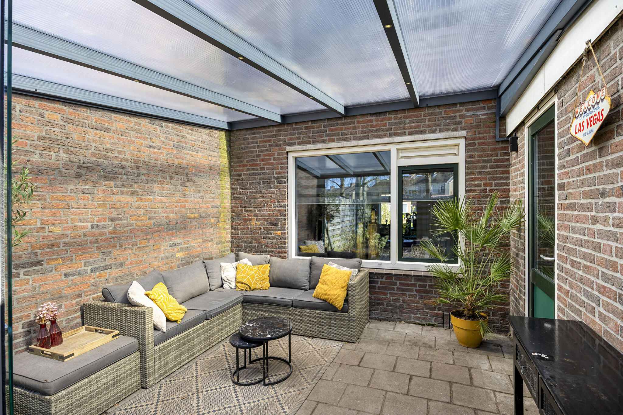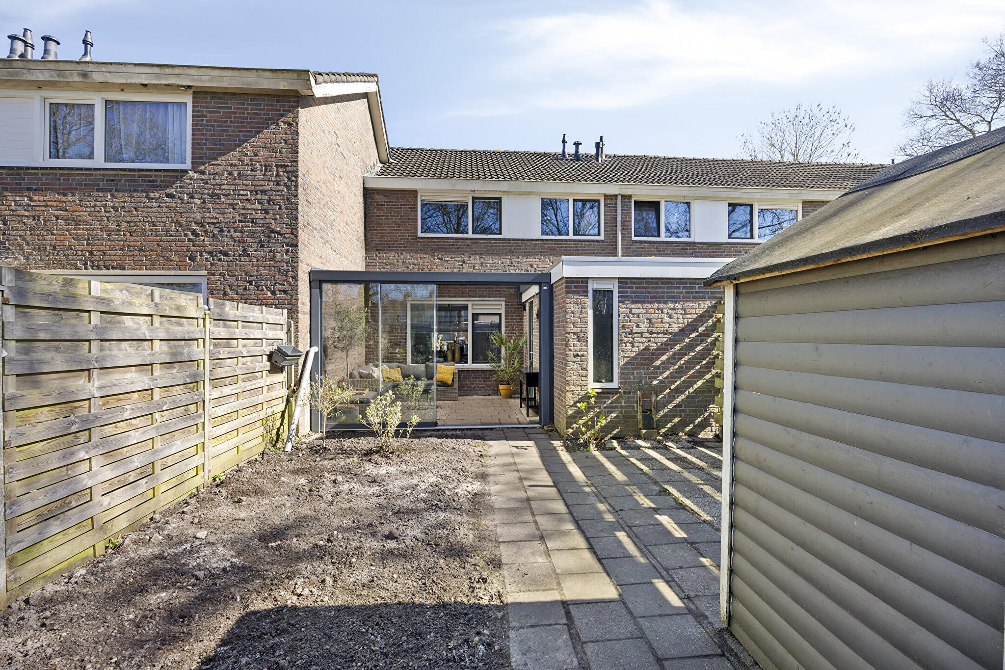 Tuin: aangebouwde volledig afsluitbare serre, een vrijstaande berging en achterom.