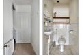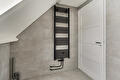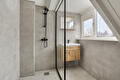 Eerste verdieping: overloop met vaste kast, 2 slaapkamers, moderne badkamer met inloopdouche, wastafel met meubel, designradiator en witgoedaansluitingen.
