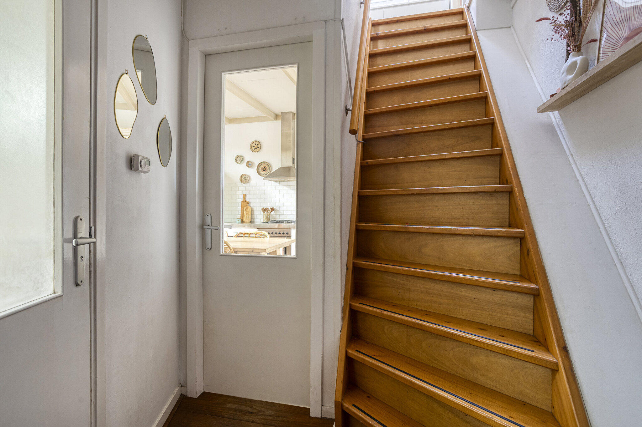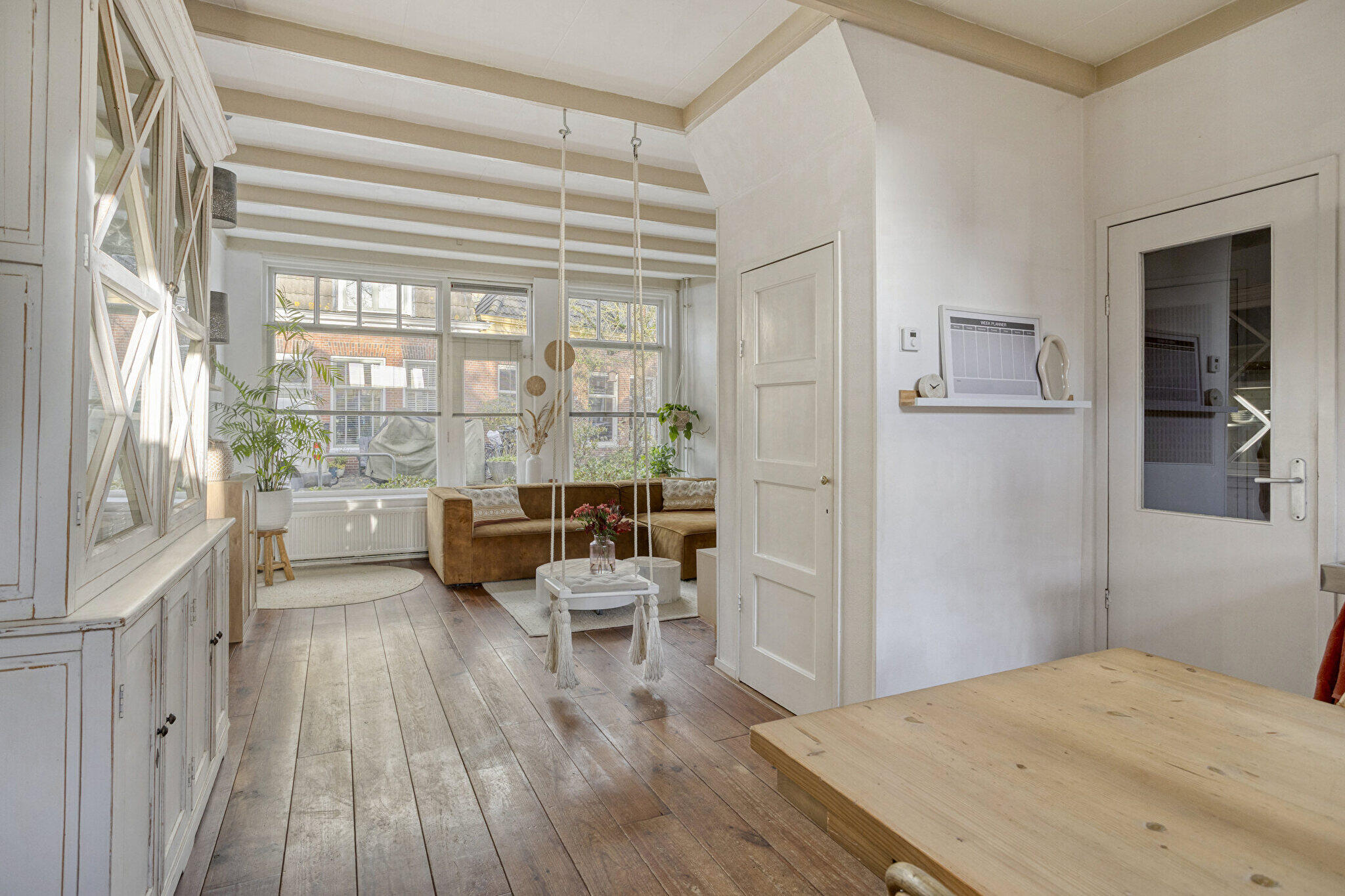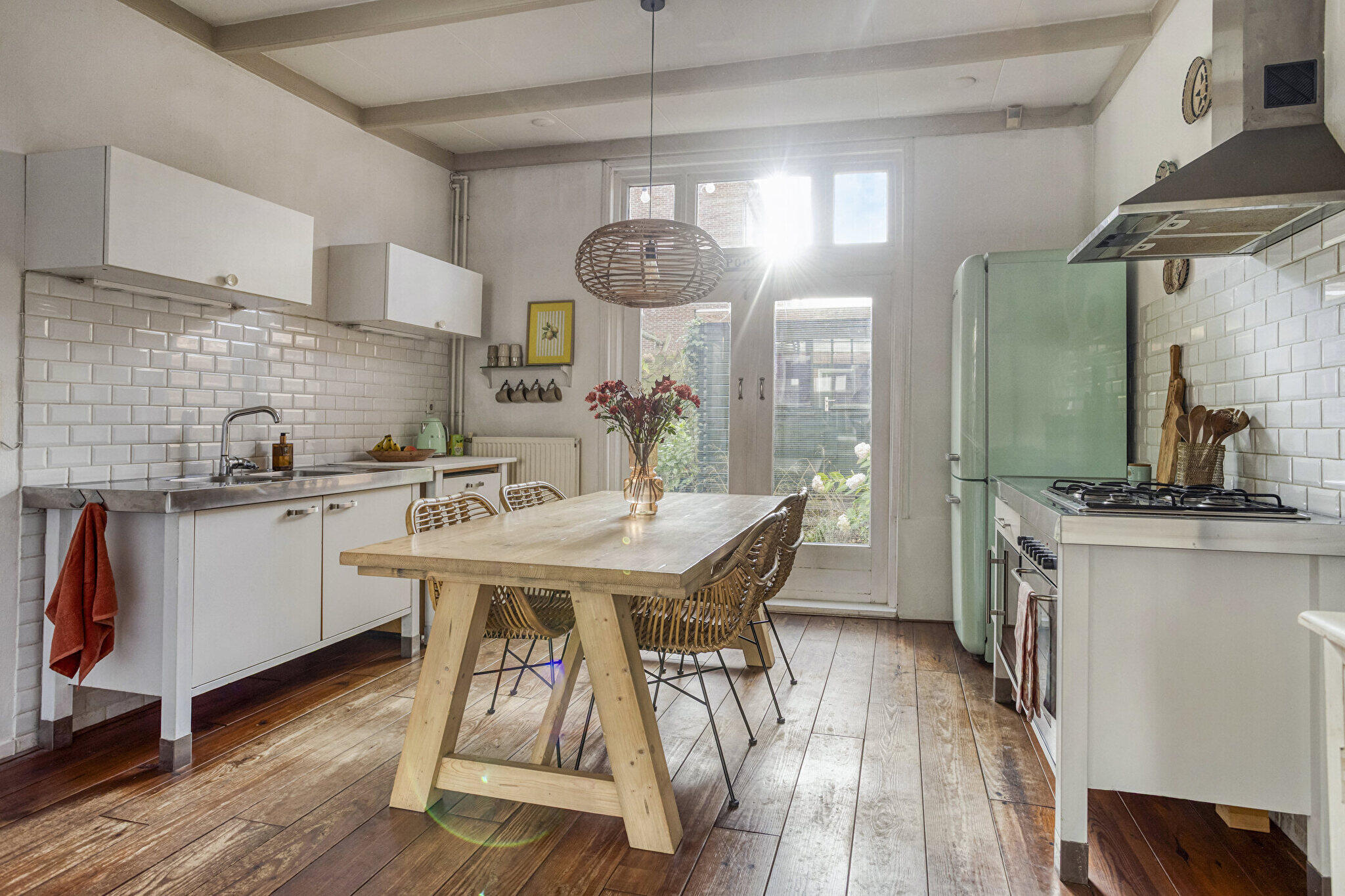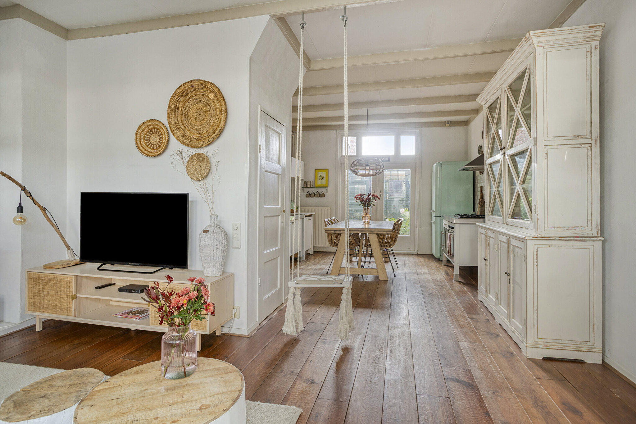 Begane grond: entree via een eigen overdekte gang naast het huis met de voordeur op de zijkant, hal met trapopgang, ruime L-vormige lichte en sfeervolle woonkamer voorzien van massief houten vloerdelen, een schouw en open verbinding met de keuken. De modern open keuken is voorzien van diverse inbouwapparatuur o.a. vaatwasser, oven, wijnkoelkast en een provisiekast is aanwezig. Vanuit de keuken via openslaande deuren toegang tot de ruime, gezellige tuin op het zuiden met achterom. Badkamer met ligbad, douchecabine, wandcloset, designradiator, wastafel met meubel en witgoedaansluiting.
