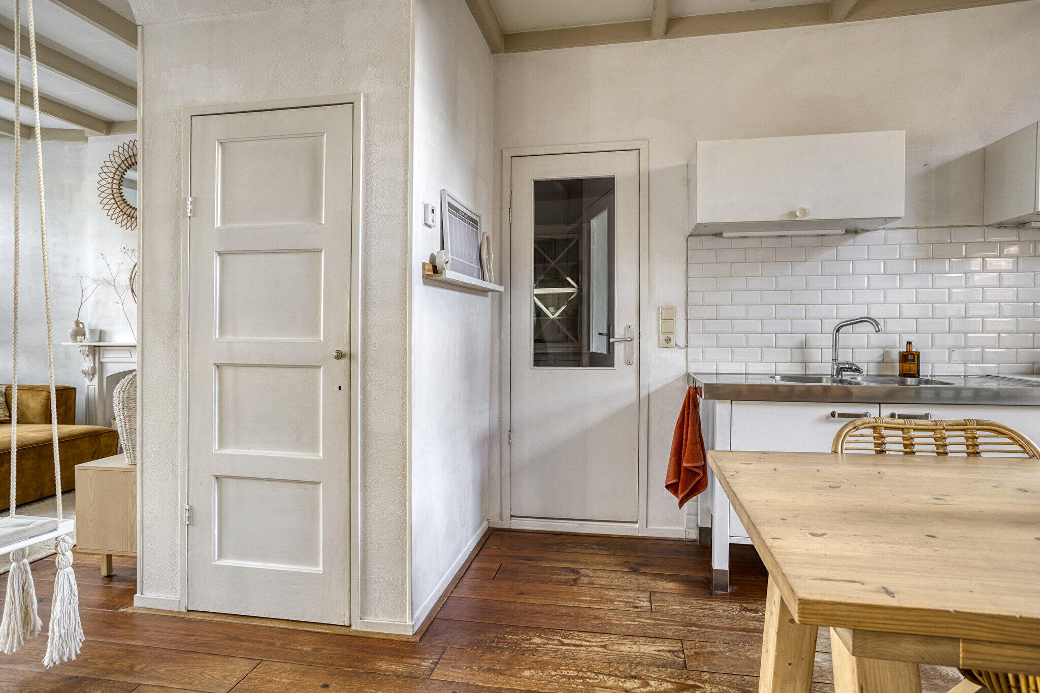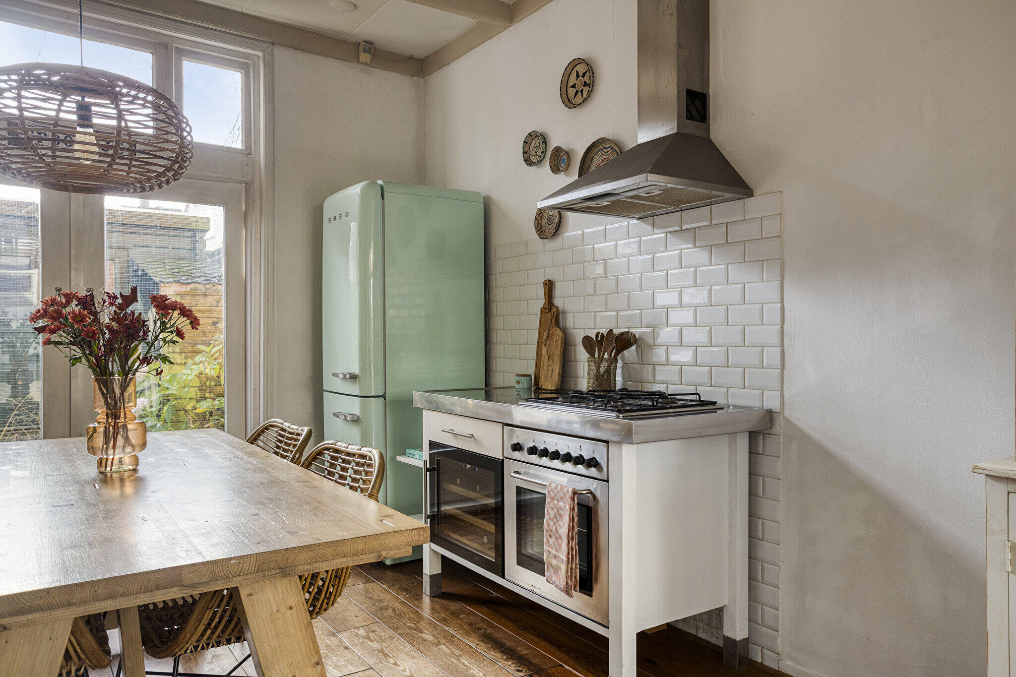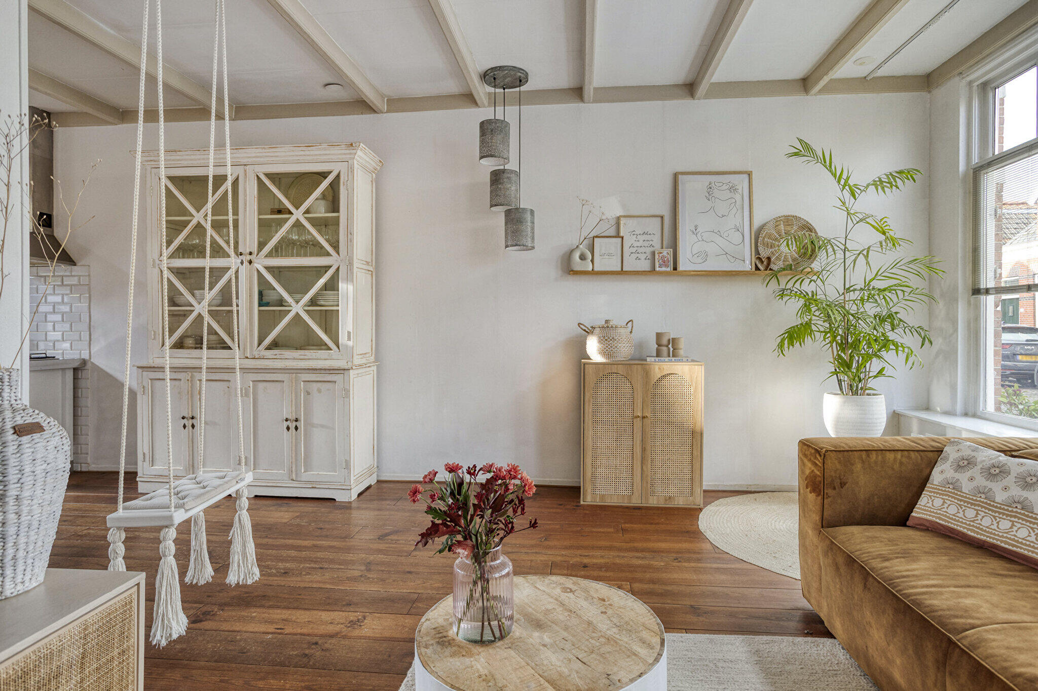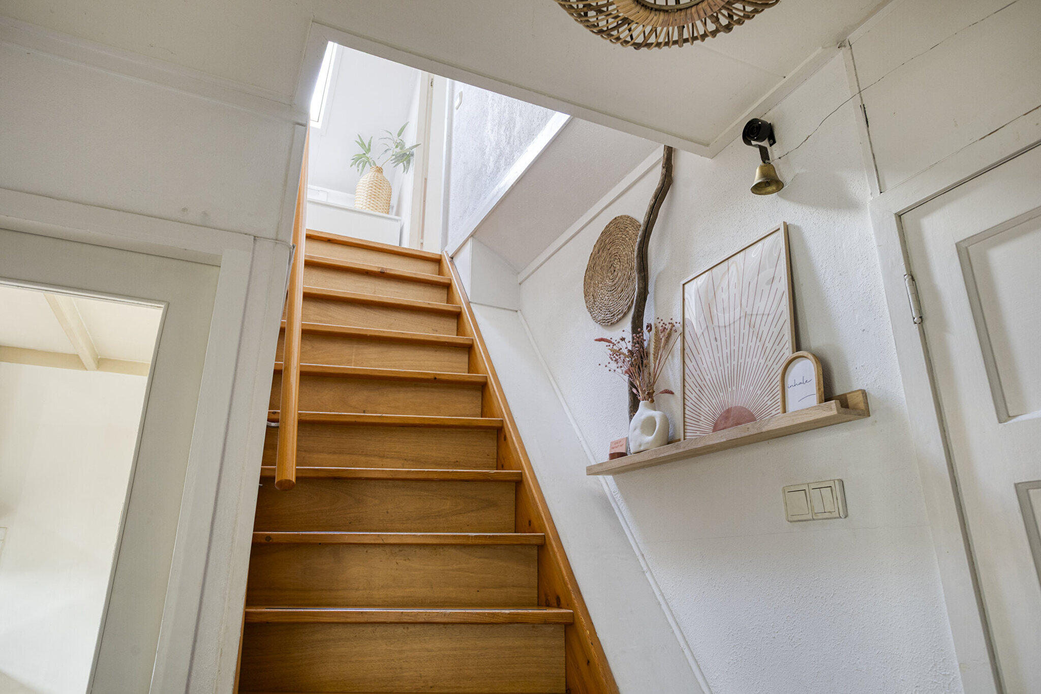 Begane grond: entree via een eigen overdekte gang naast het huis met de voordeur op de zijkant, hal met trapopgang, ruime L-vormige lichte en sfeervolle woonkamer voorzien van massief houten vloerdelen, een schouw en open verbinding met de keuken. De modern open keuken is voorzien van diverse inbouwapparatuur o.a. vaatwasser, oven, wijnkoelkast en een provisiekast is aanwezig. Vanuit de keuken via openslaande deuren toegang tot de ruime, gezellige tuin op het zuiden met achterom. Badkamer met ligbad, douchecabine, wandcloset, designradiator, wastafel met meubel en witgoedaansluiting.