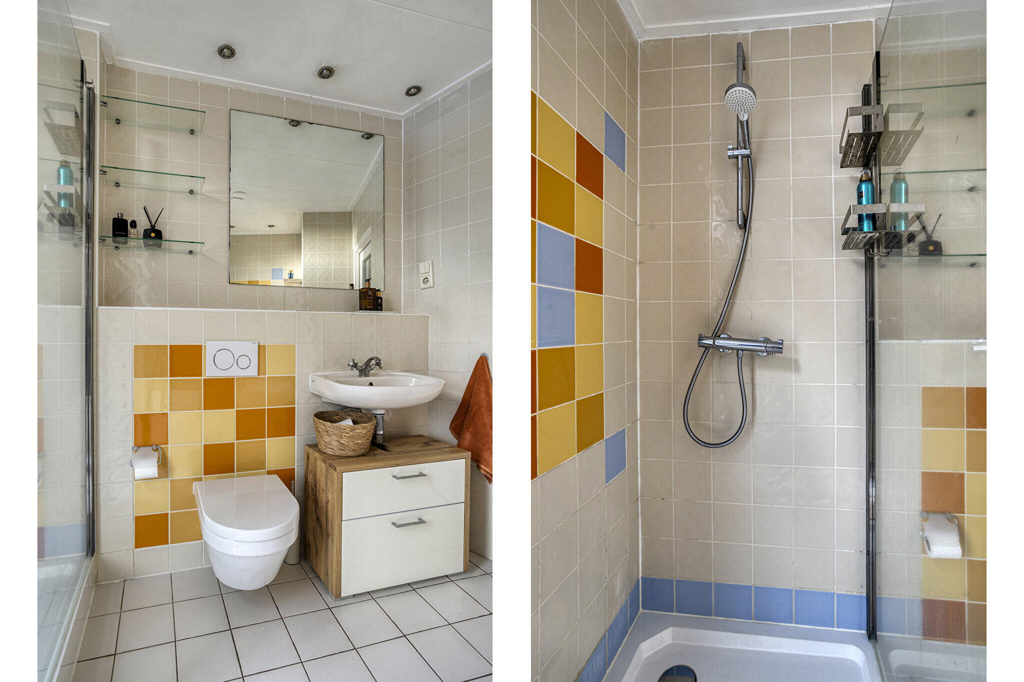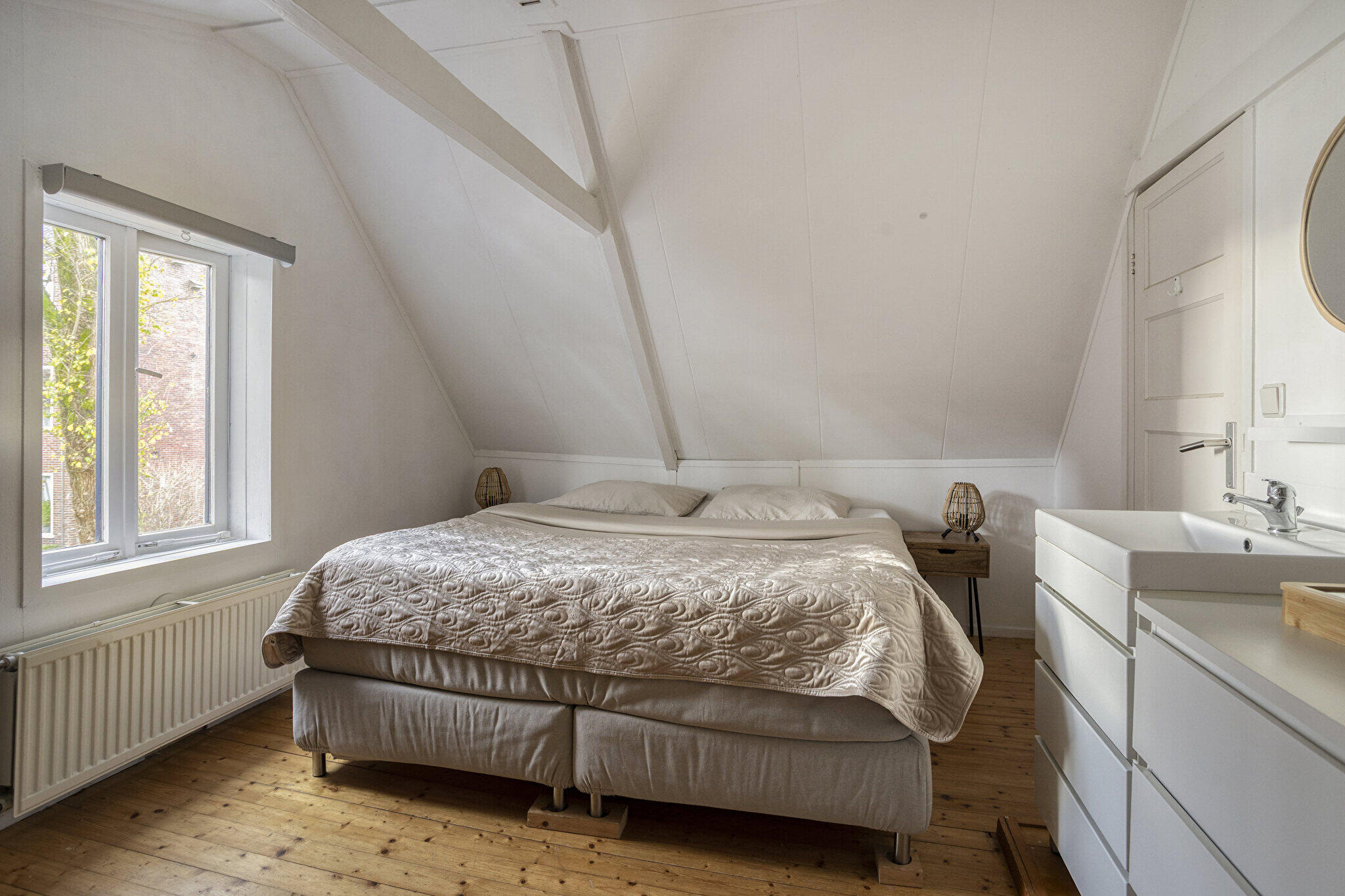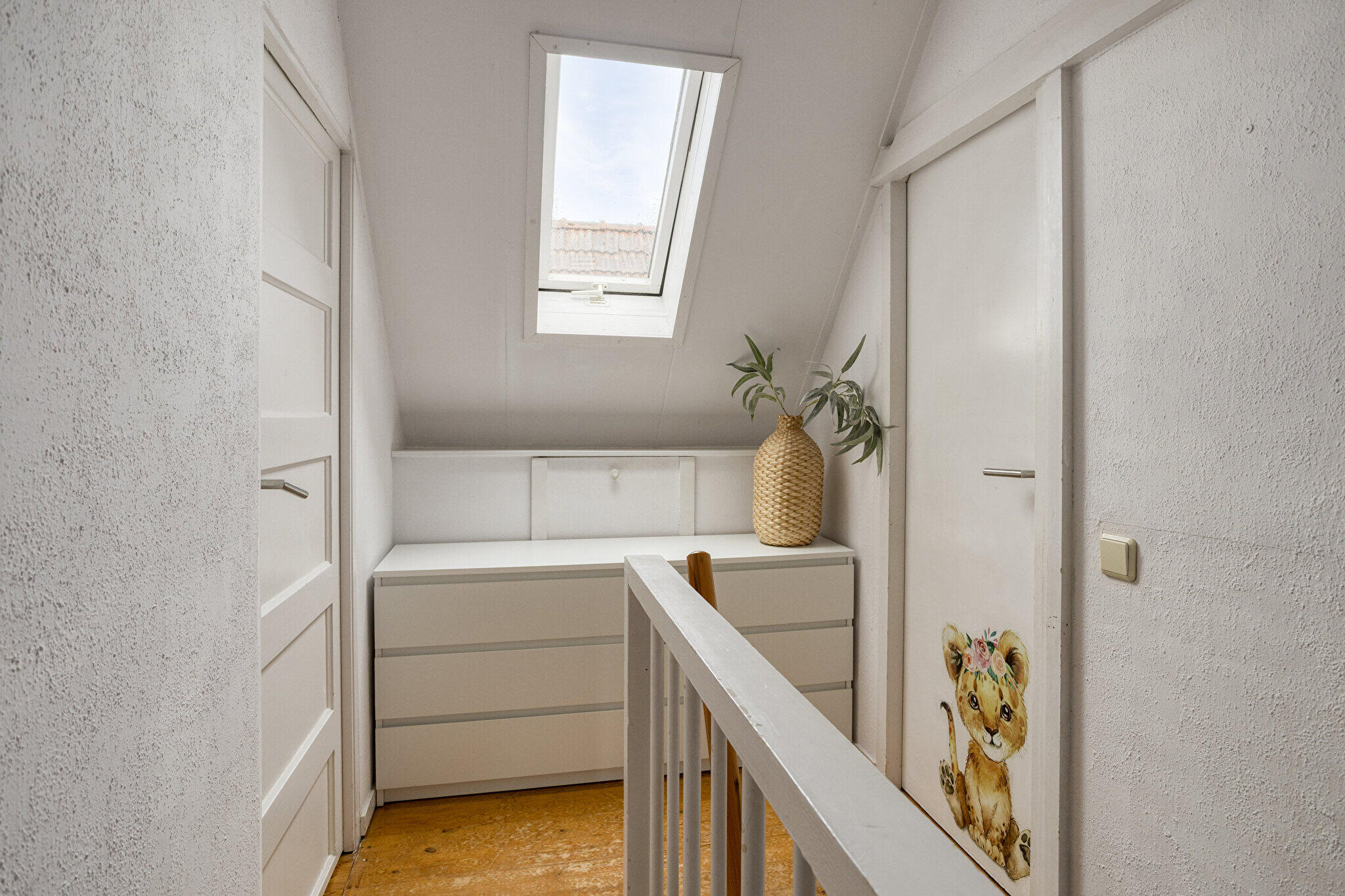 Eerste verdieping: overloop met dakraam en bergruimte, totaal 2 ruime slaapkamers met veel opbergmogelijkheden achter de knieschotten en waarvan één slaapkamer is voorzien van een wastafel met meubel.