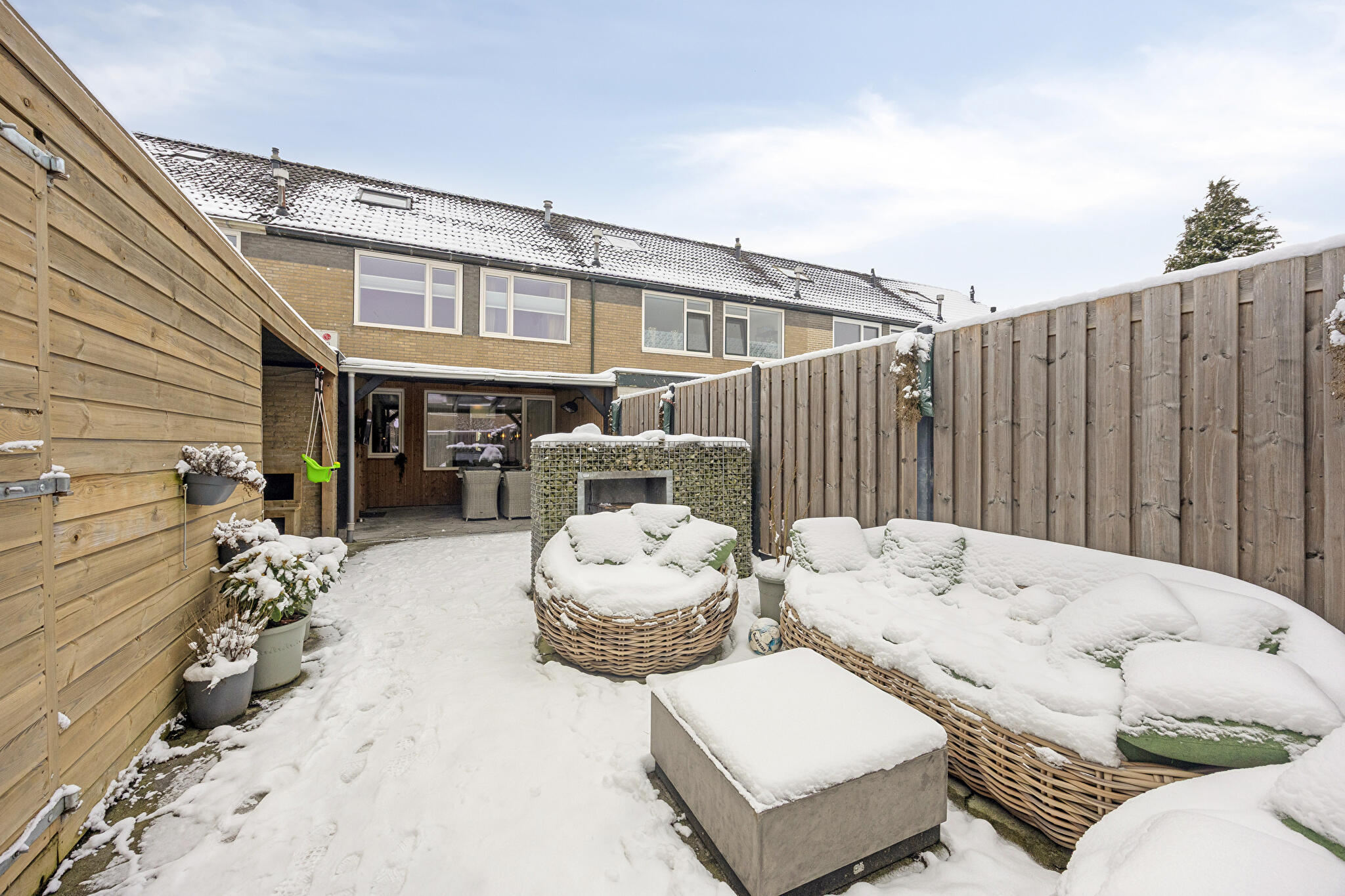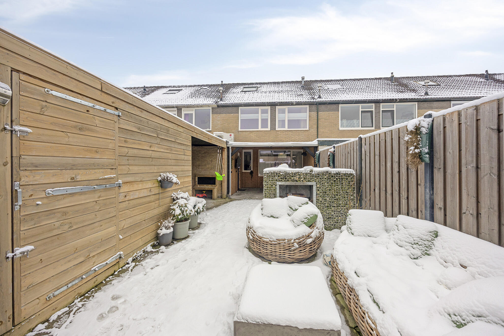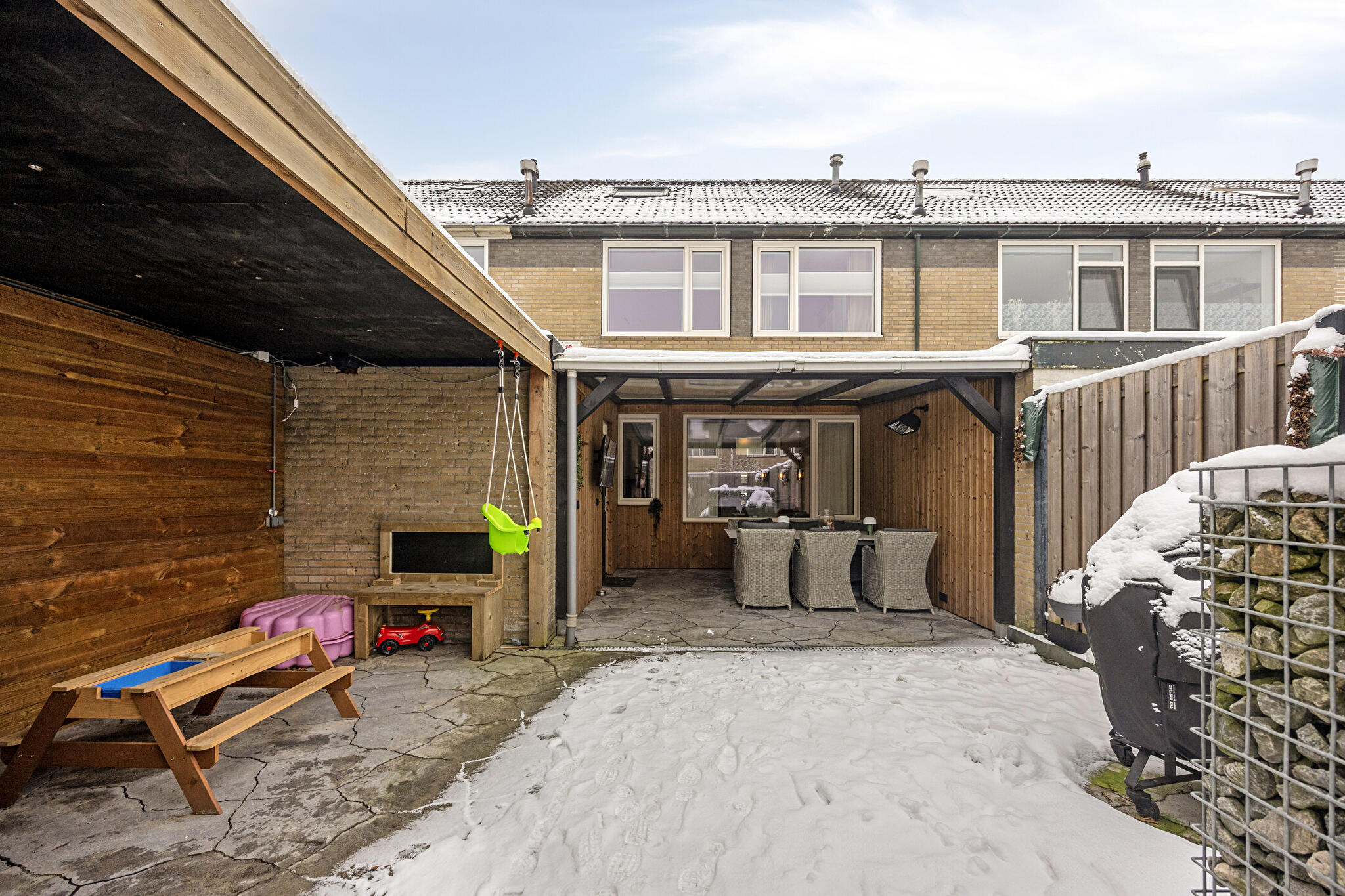 In rustige en kindvriendelijke woonwijk gelegen, ruime tussenwoning met vrijstaande houten berging en onderhoudsvriendelijke voor- en achtertuin. De woning beschikt over een fraaie overkapping direct achter de woning met heater, alsook een overkapping achter de bijkeuken (thans in gebruik als speelruimte).