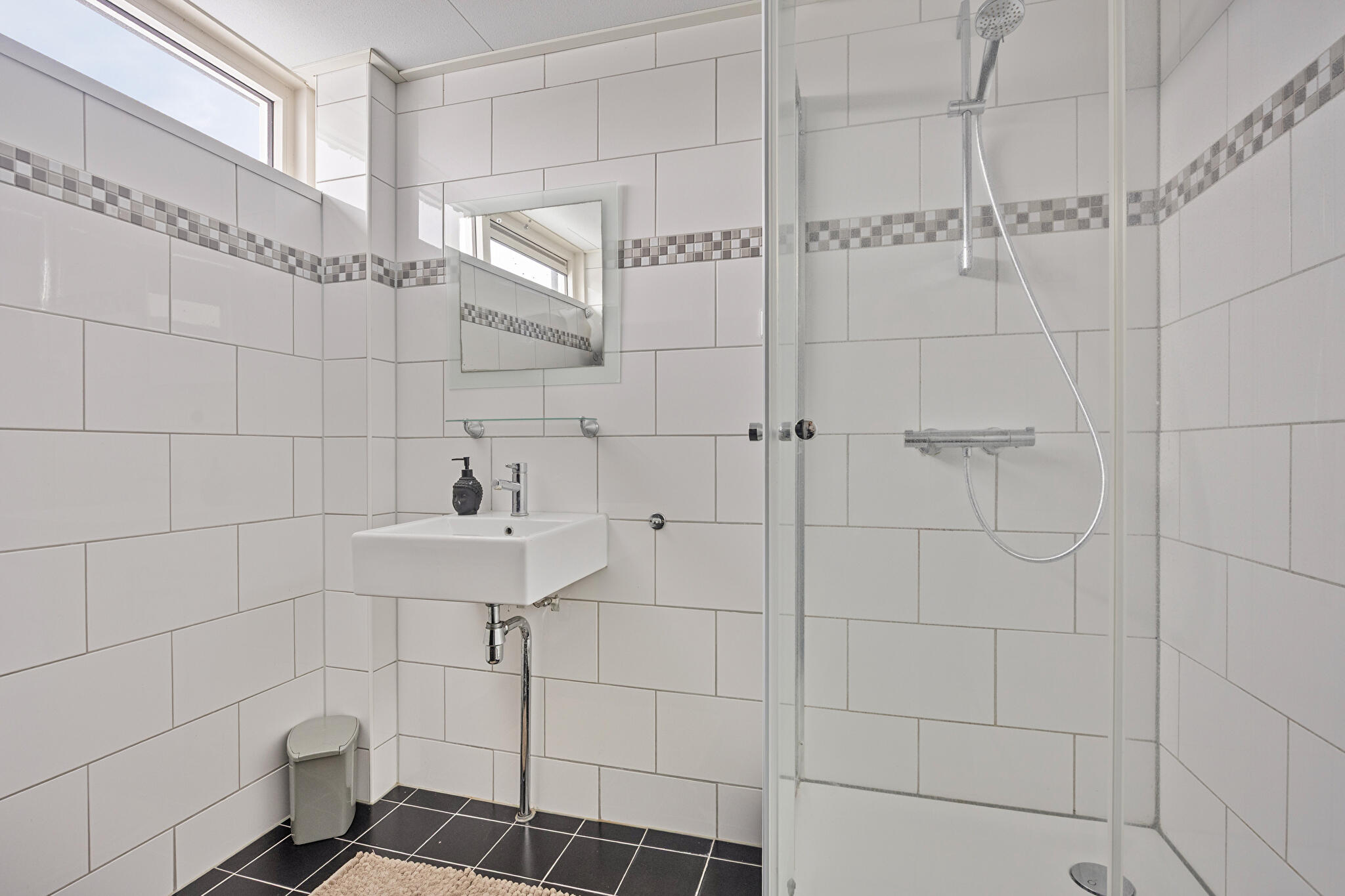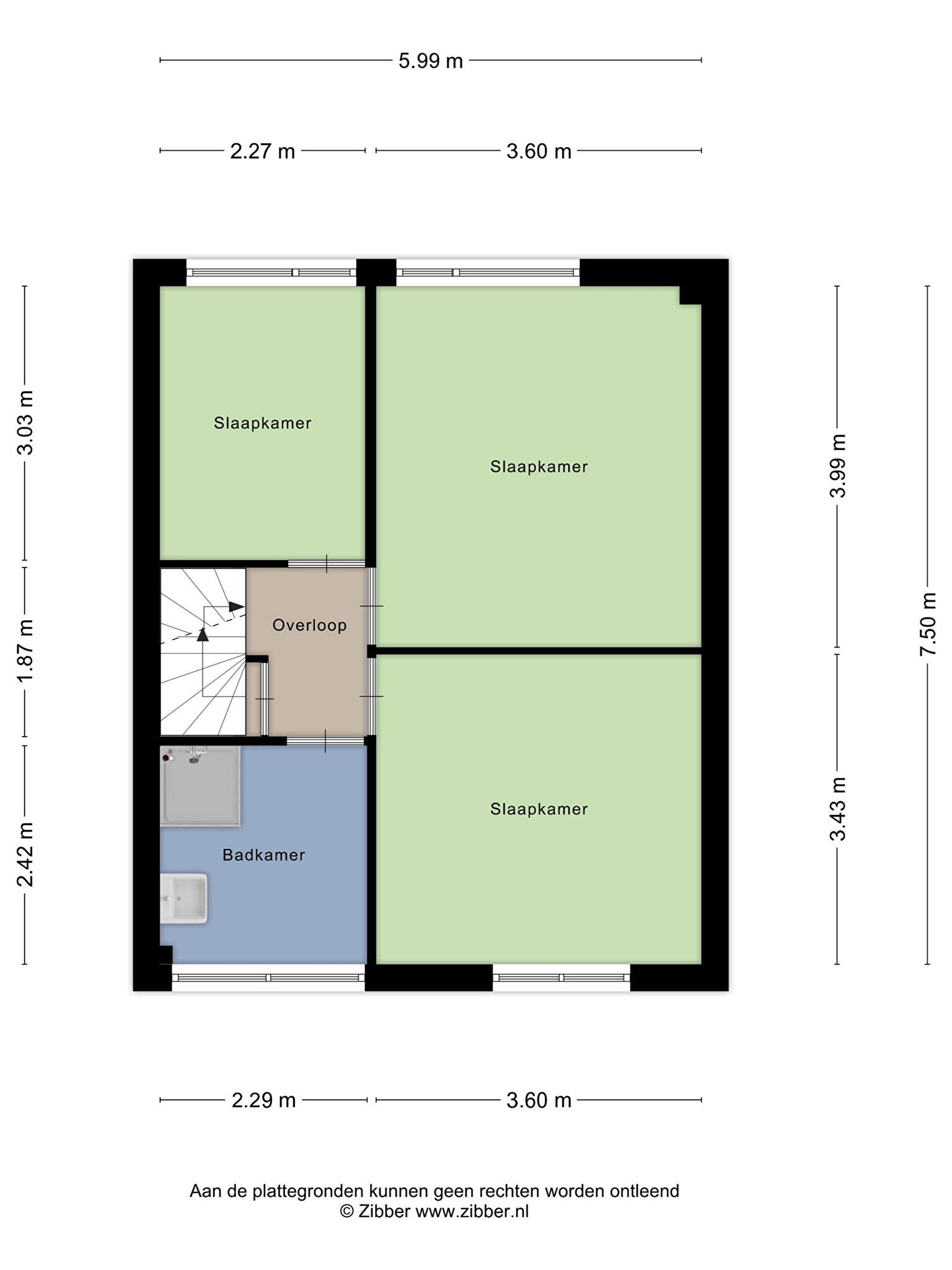 Eerste verdieping: overloop, totaal 3 slaapkamers, badkamer met douchecabine en vaste wastafel.