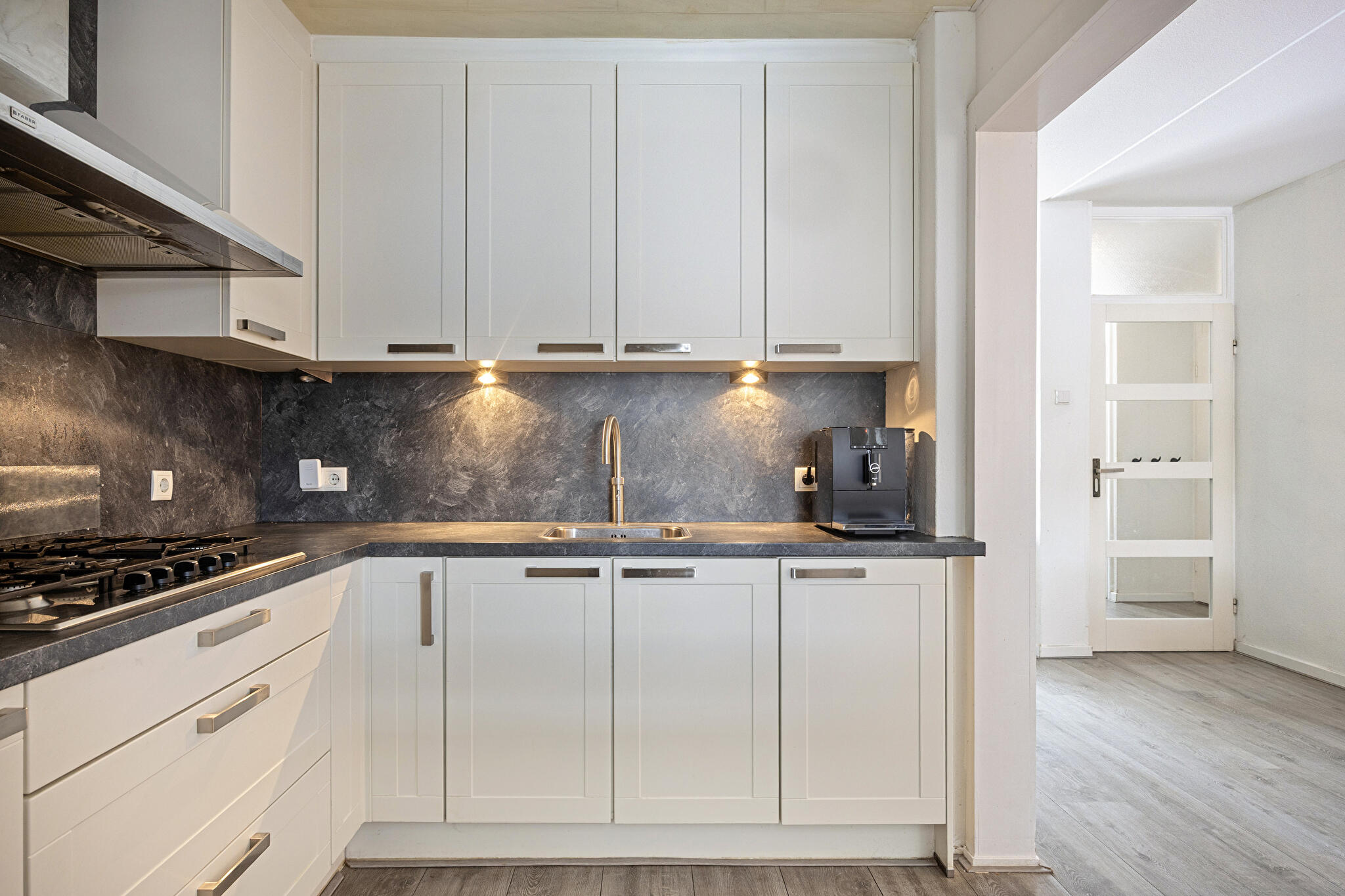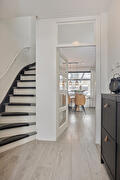 Begane grond: entree/hal met toiletruimte en fonteintje, woon-/eetkamer met trapkast/provisieruimte, open keuken met hoekopgestelde keukeninrichting voorzien van diverse inbouwapparatuur, vanuit de keuken toegang tot de royale bijkeuken met technische ruimte en tuindeur naar de sfeervolle overkapping.