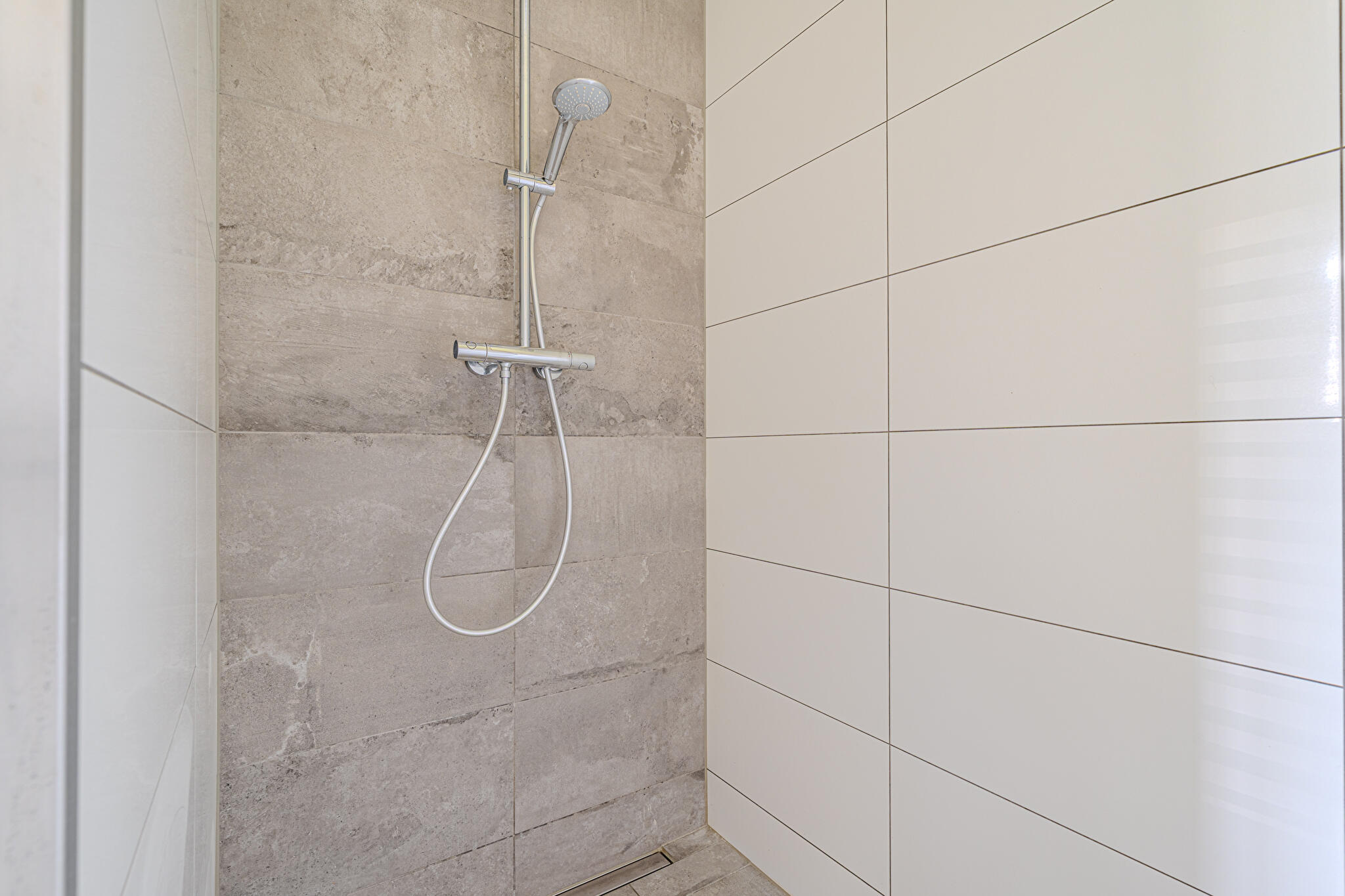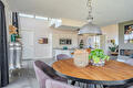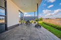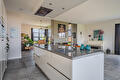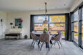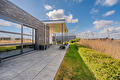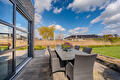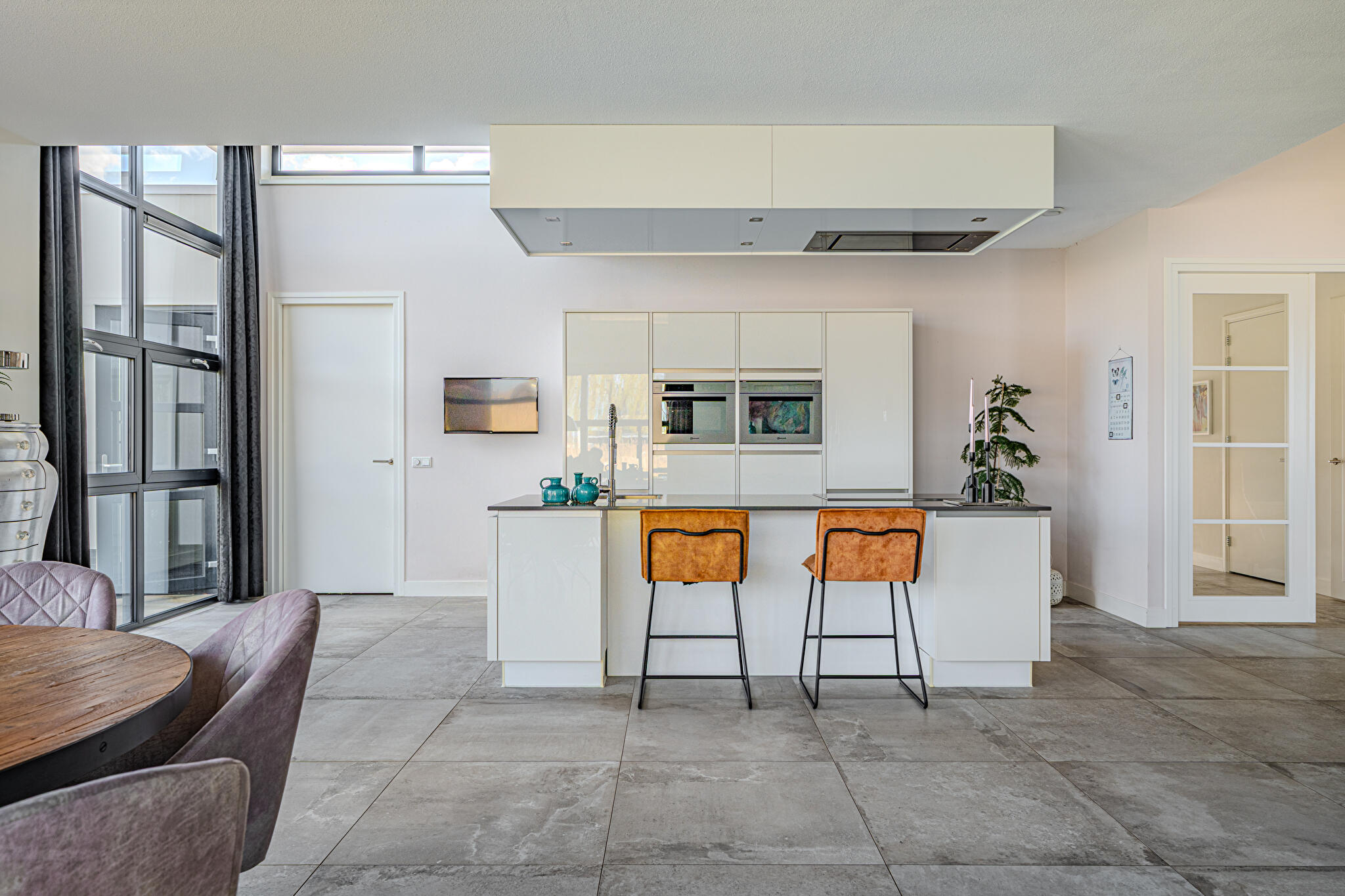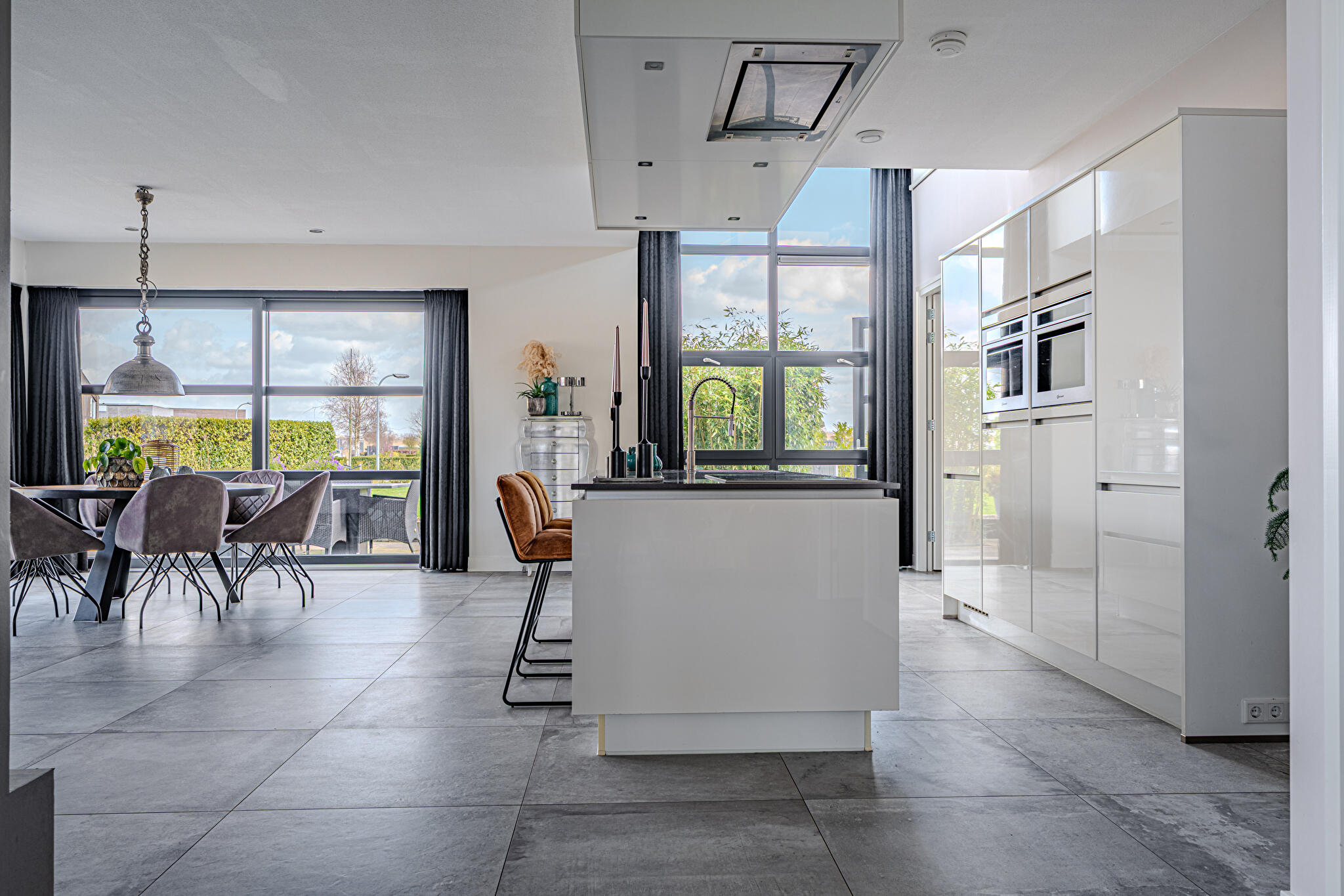 De moderne leefkeuken vormt het hart van het huis en staat dankzij de twee grote schuifpuien in directe verbinding met buiten, waardoor op zonnige dagen het terras onder de overkapping naadloos wordt betrokken bij de leefruimte. Door de open opzet en de royale maatvoering is dit een plek waar dagelijks leven en gastvrijheid moeiteloos samenkomen.