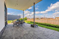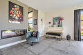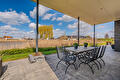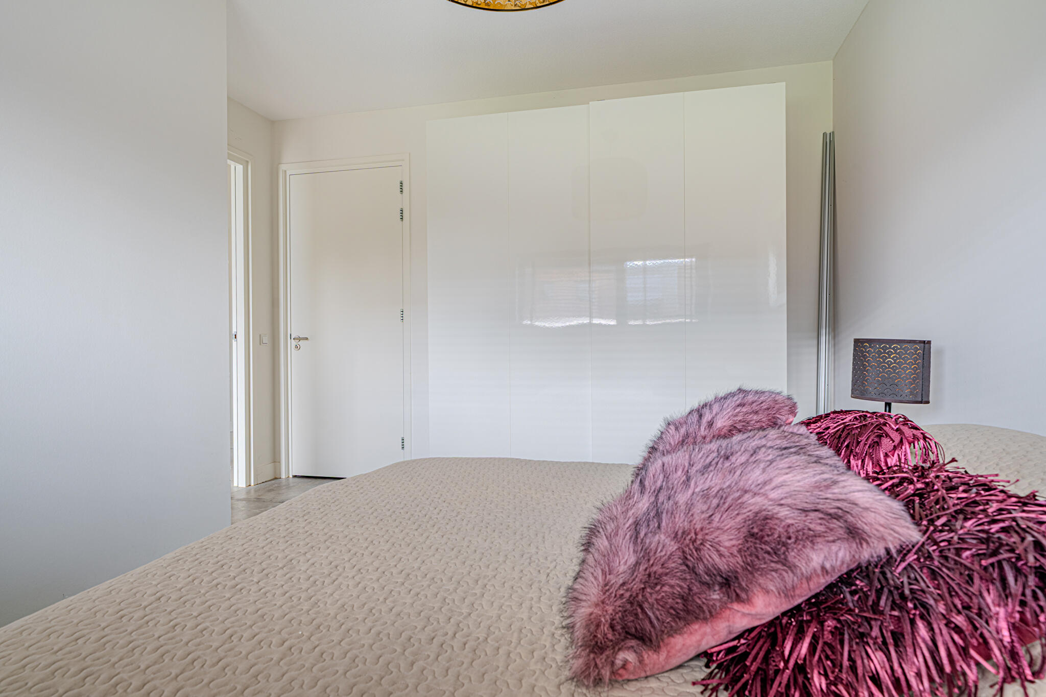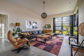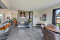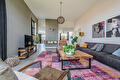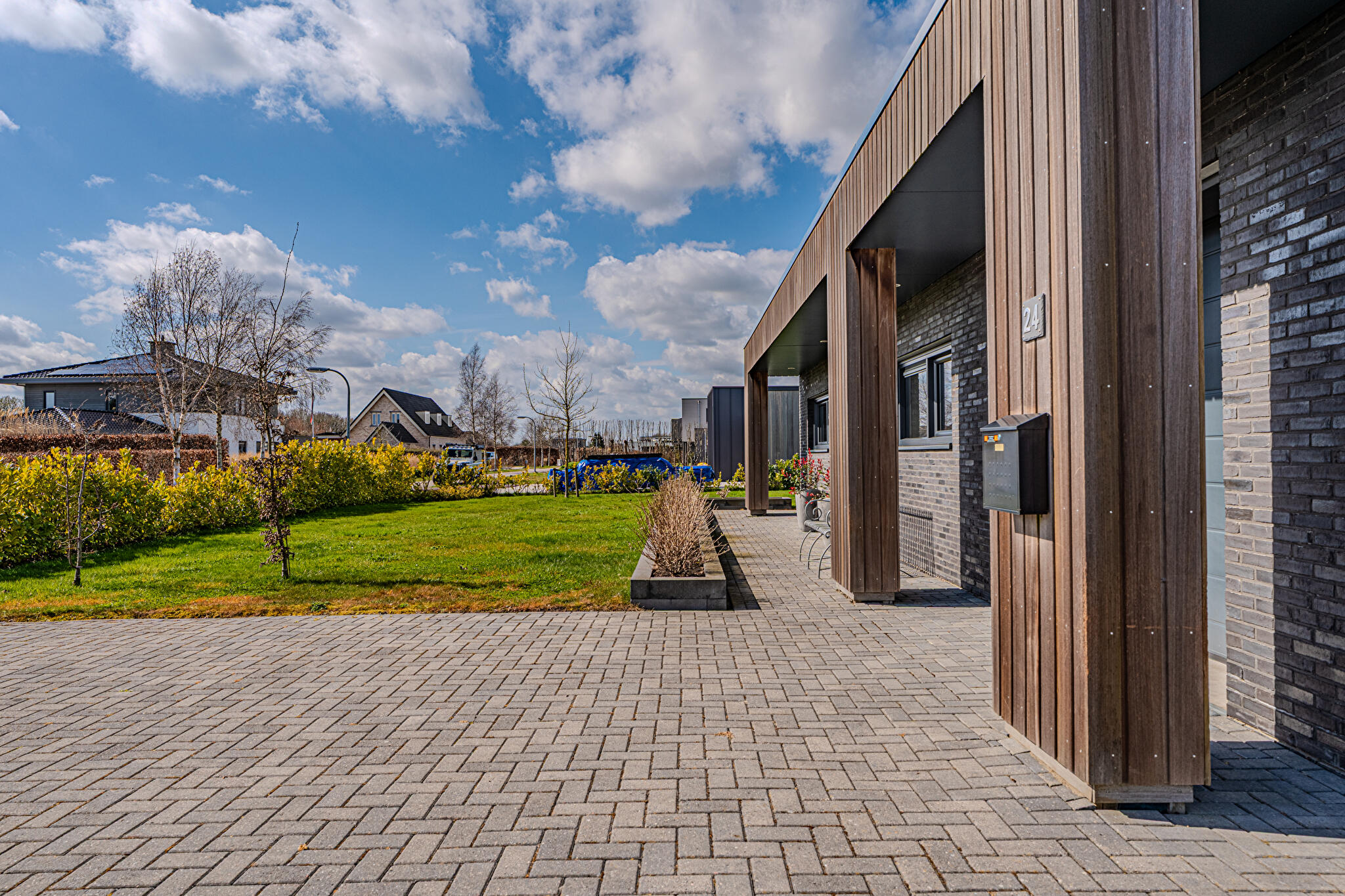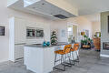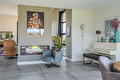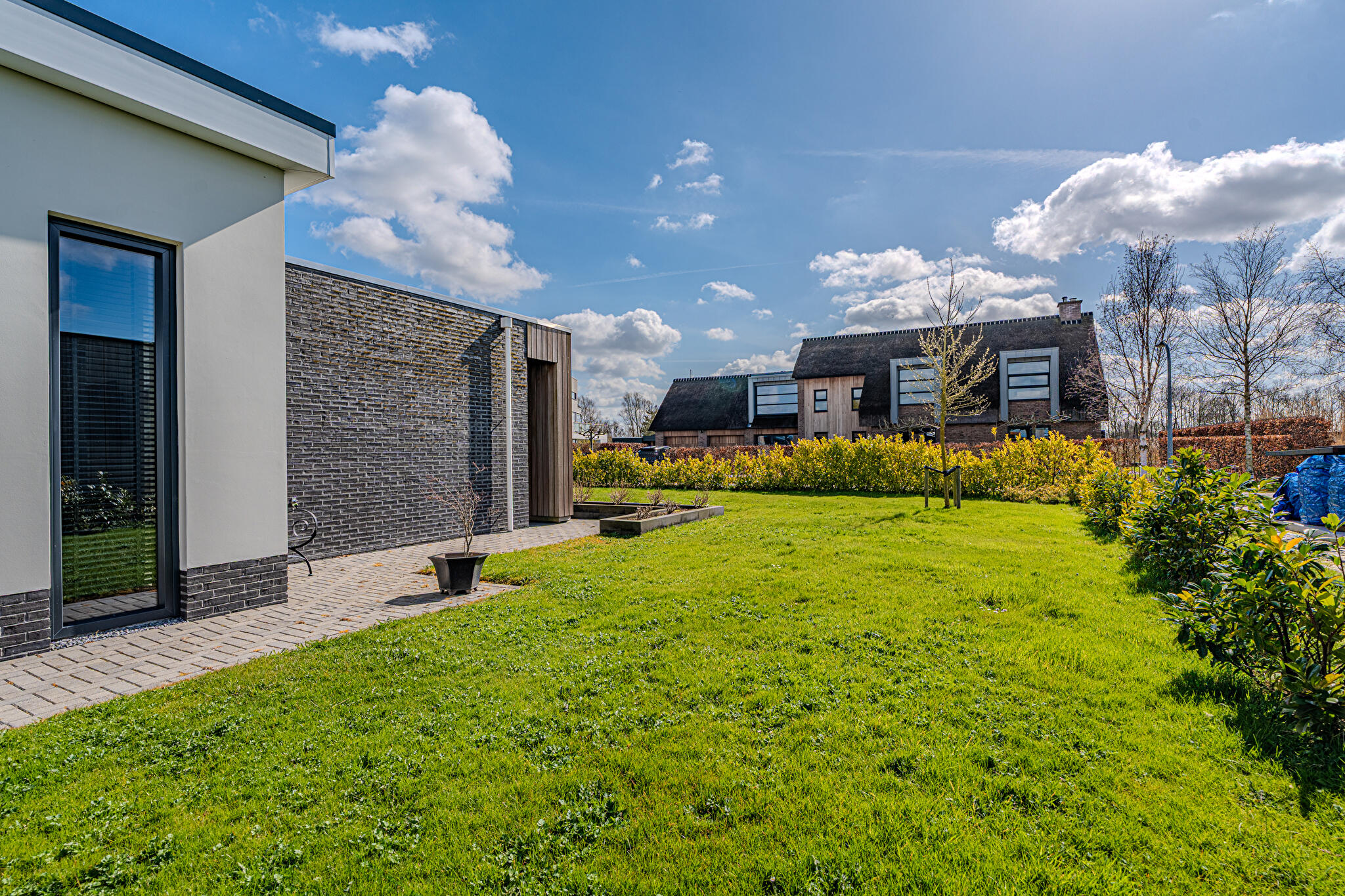 De moderne leefkeuken vormt het hart van het huis en staat dankzij de twee grote schuifpuien in directe verbinding met buiten, waardoor op zonnige dagen het terras onder de overkapping naadloos wordt betrokken bij de leefruimte. Door de open opzet en de royale maatvoering is dit een plek waar dagelijks leven en gastvrijheid moeiteloos samenkomen.