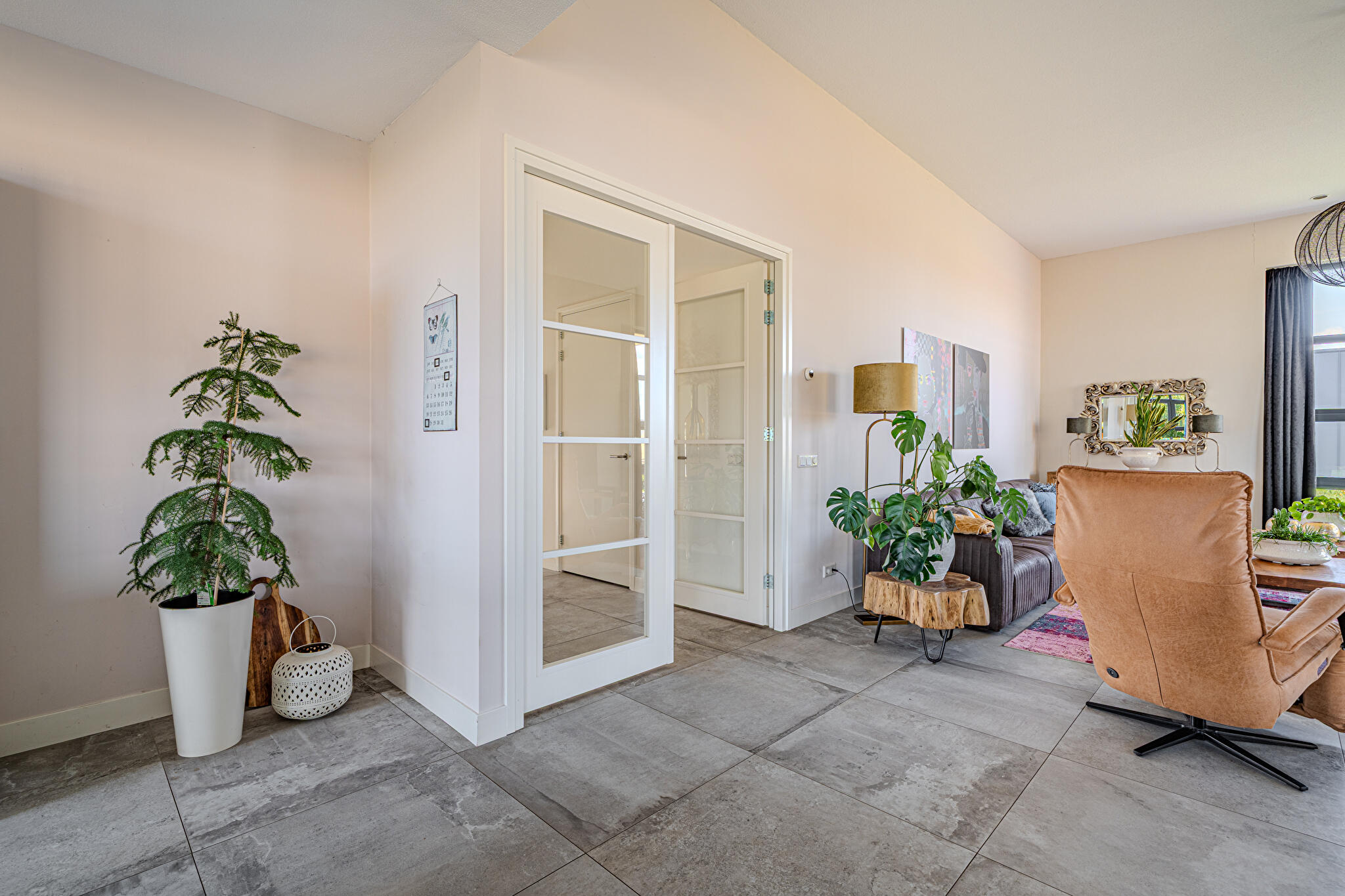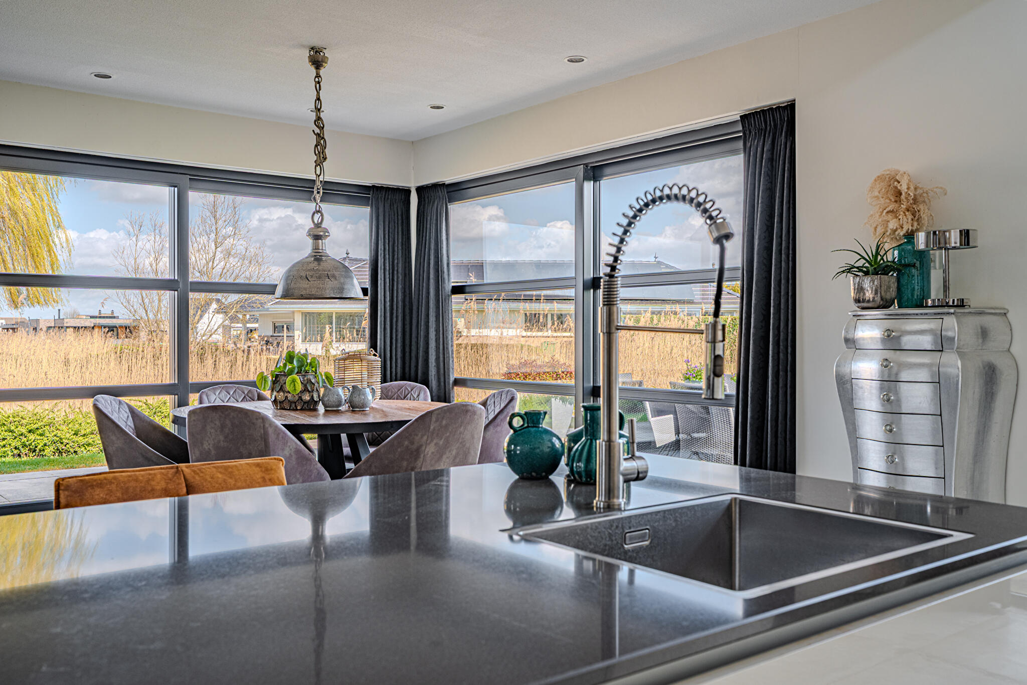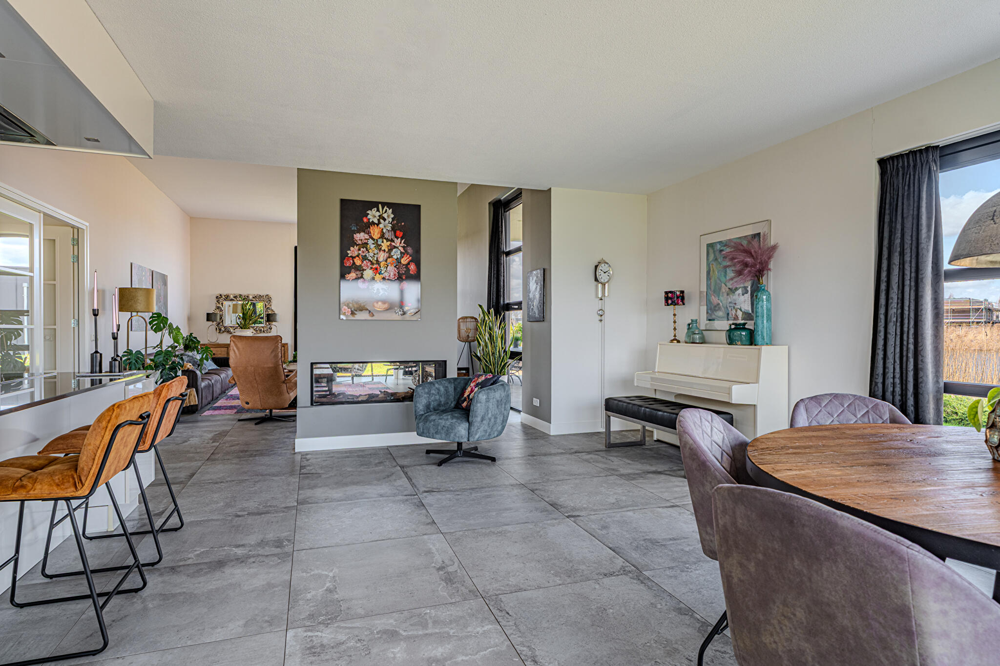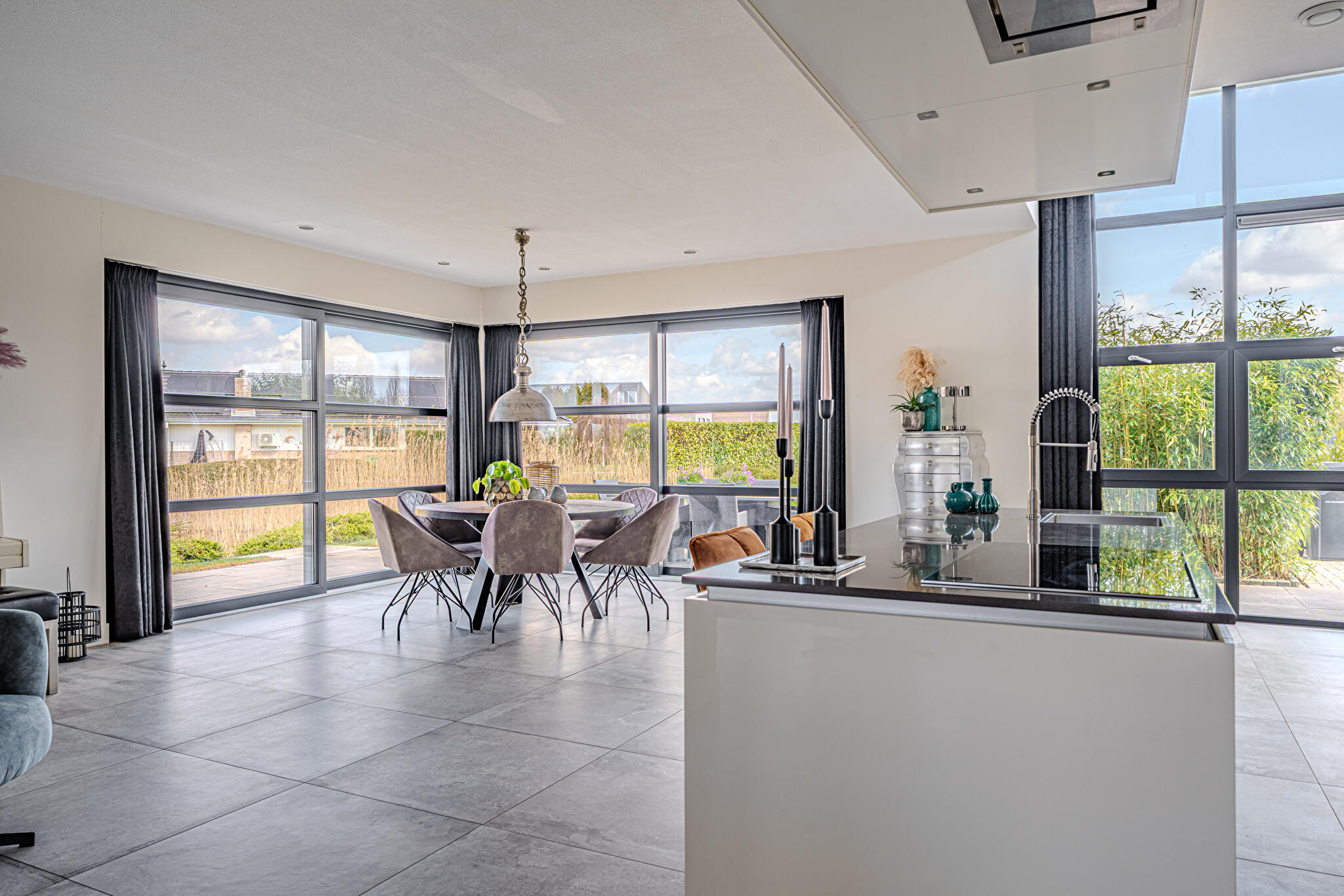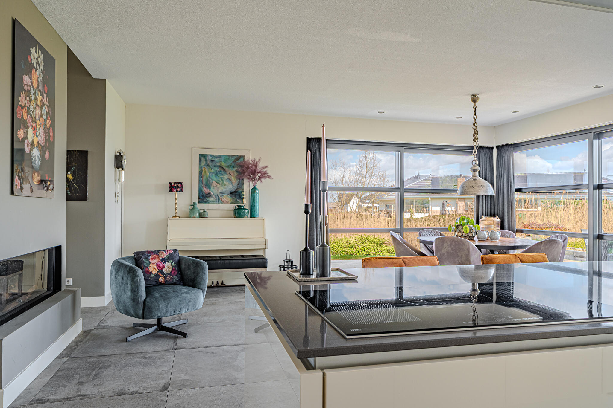 Overdekt entree, ruime hal en een moderne toiletruimte met wandcloset en fonteintje. De royale woonkamer valt op door grote raampartijen, die zorgen voor een overvloed aan natuurlijk licht en een prachtig uitzicht op de tuin en het Oldambtmeer. De open leefruimte creëert een fijne balans tussen wonen, koken en ontspannen.