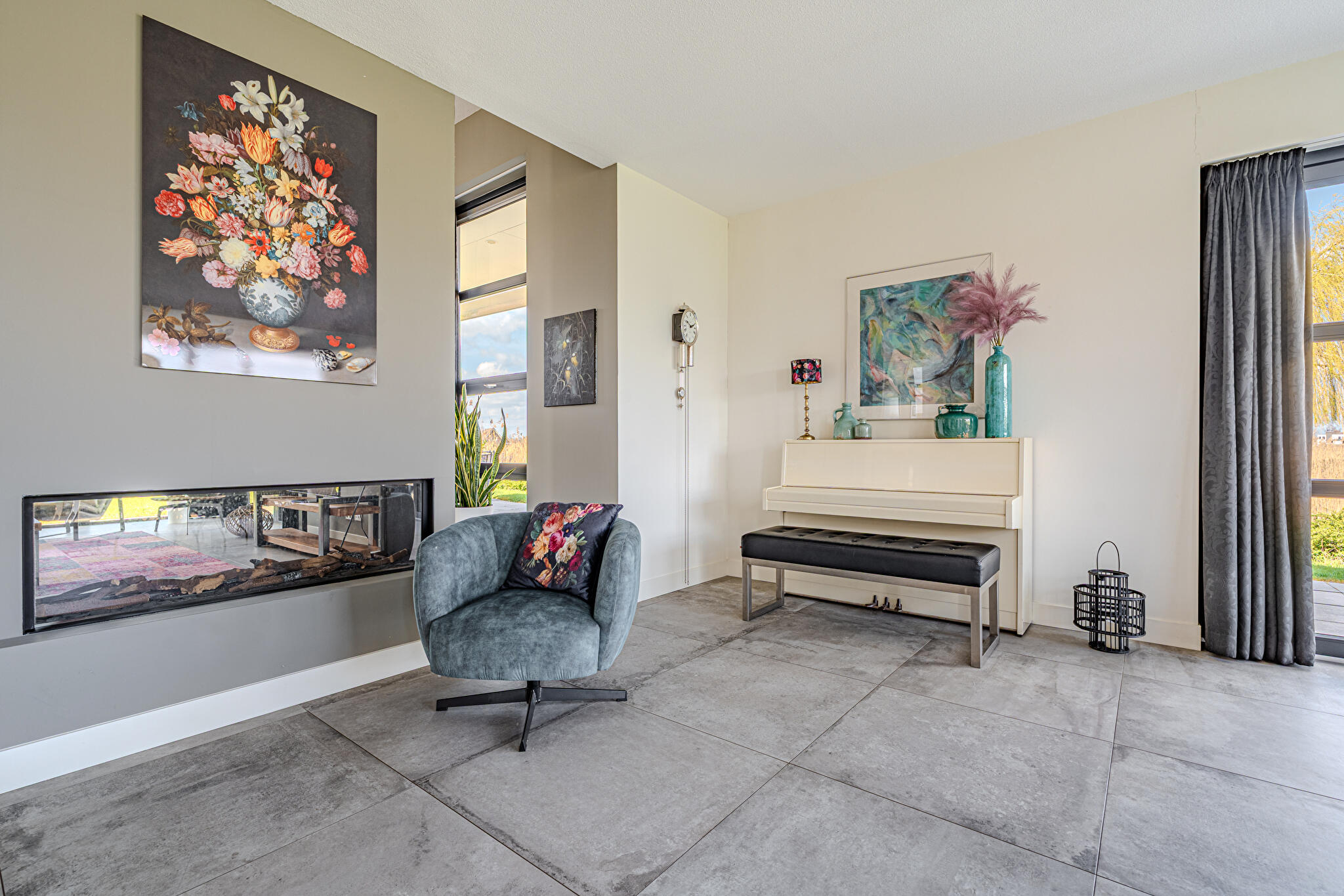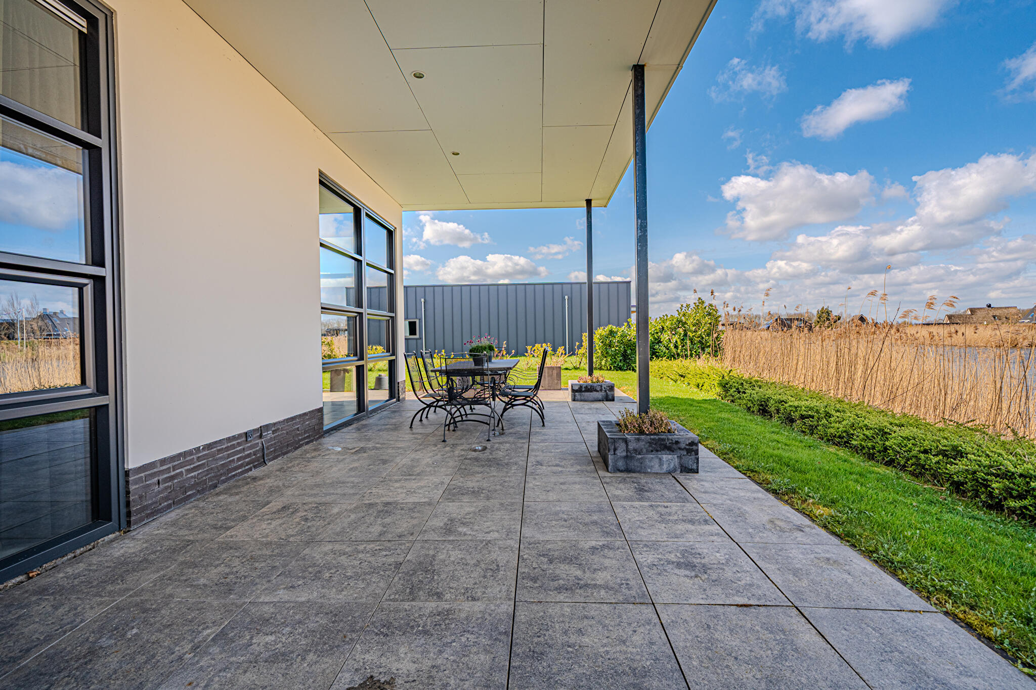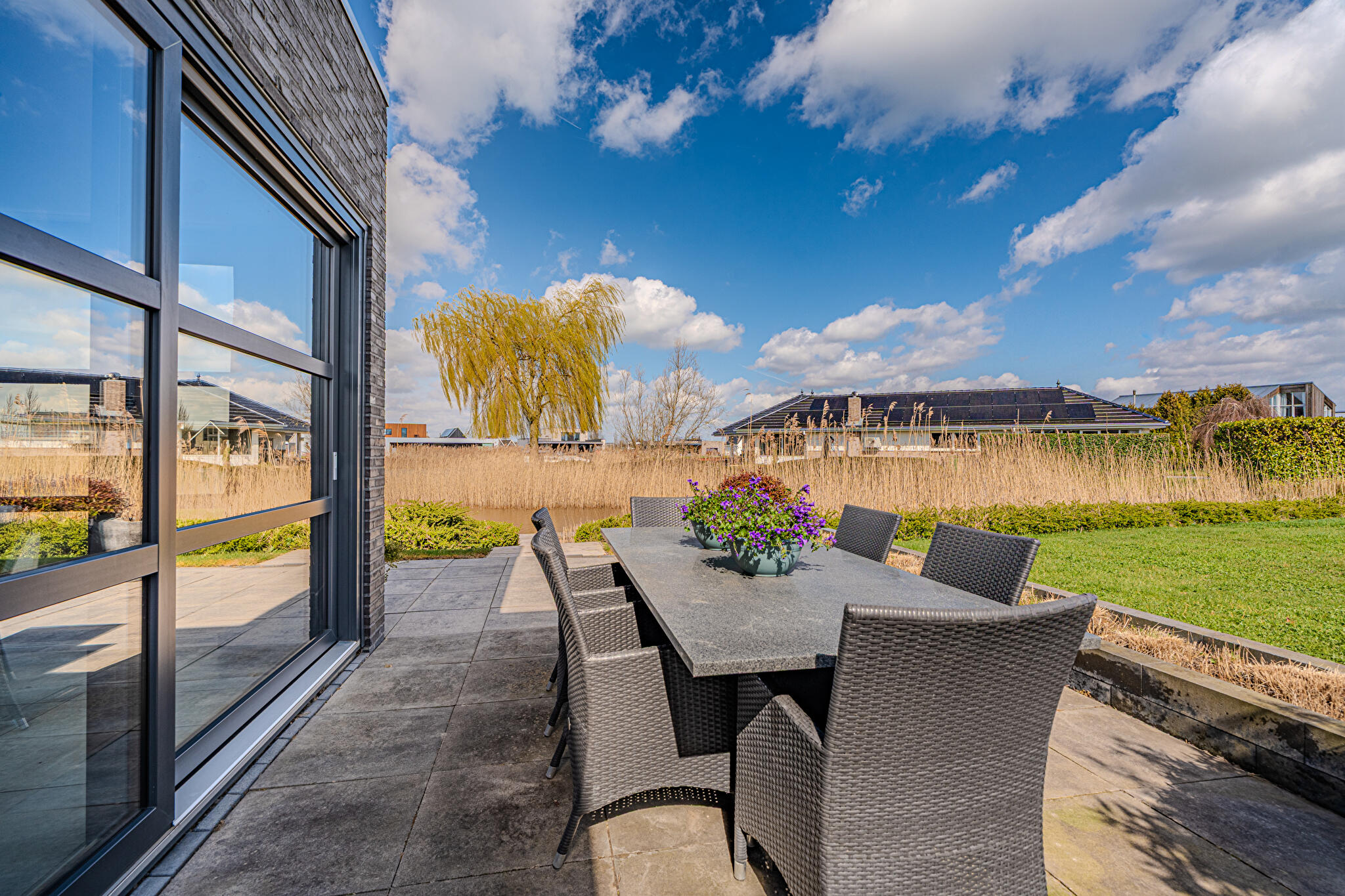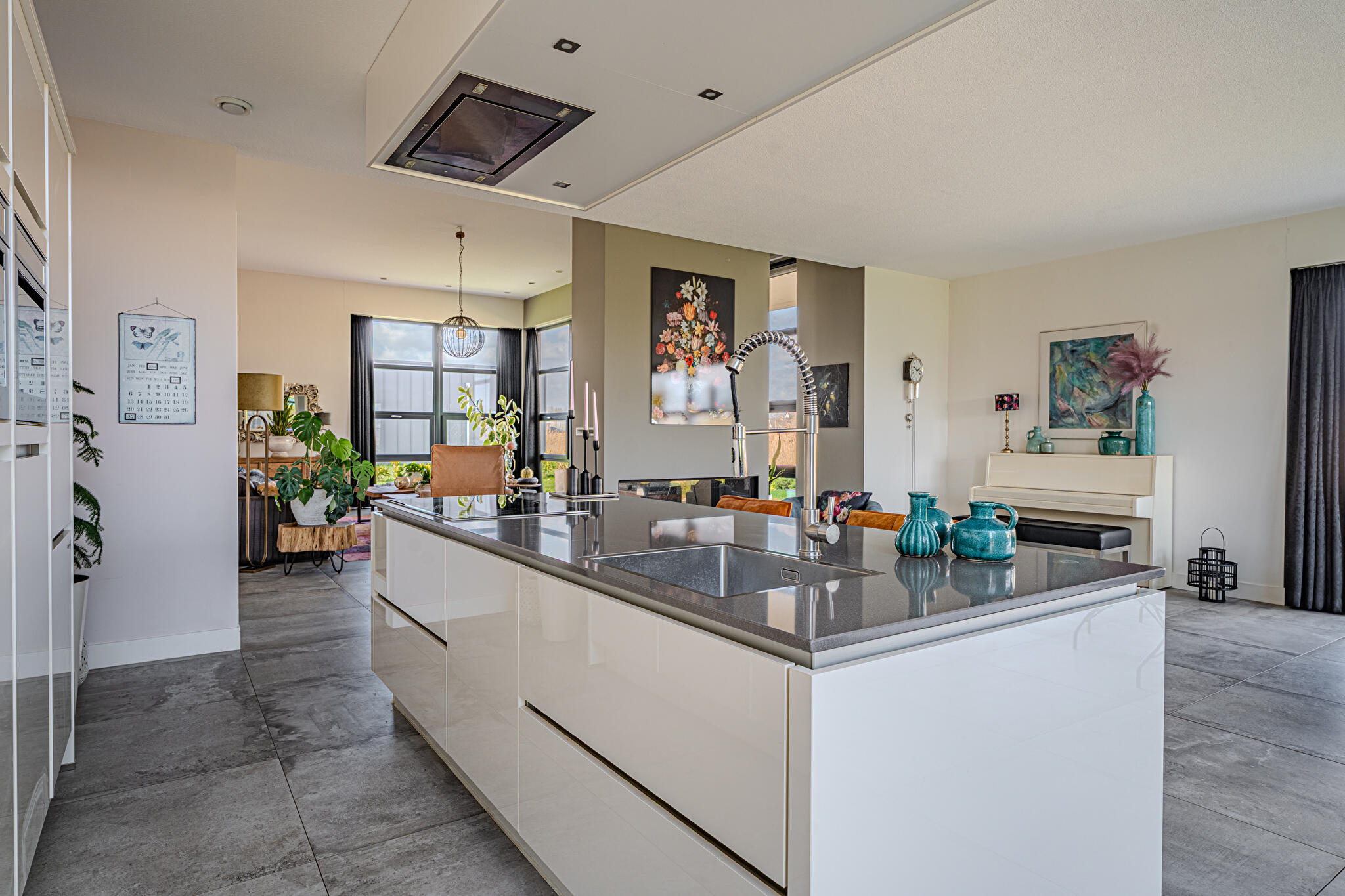 Overdekt entree, ruime hal en een moderne toiletruimte met wandcloset en fonteintje. De royale woonkamer valt op door grote raampartijen, die zorgen voor een overvloed aan natuurlijk licht en een prachtig uitzicht op de tuin en het Oldambtmeer. De open leefruimte creëert een fijne balans tussen wonen, koken en ontspannen.