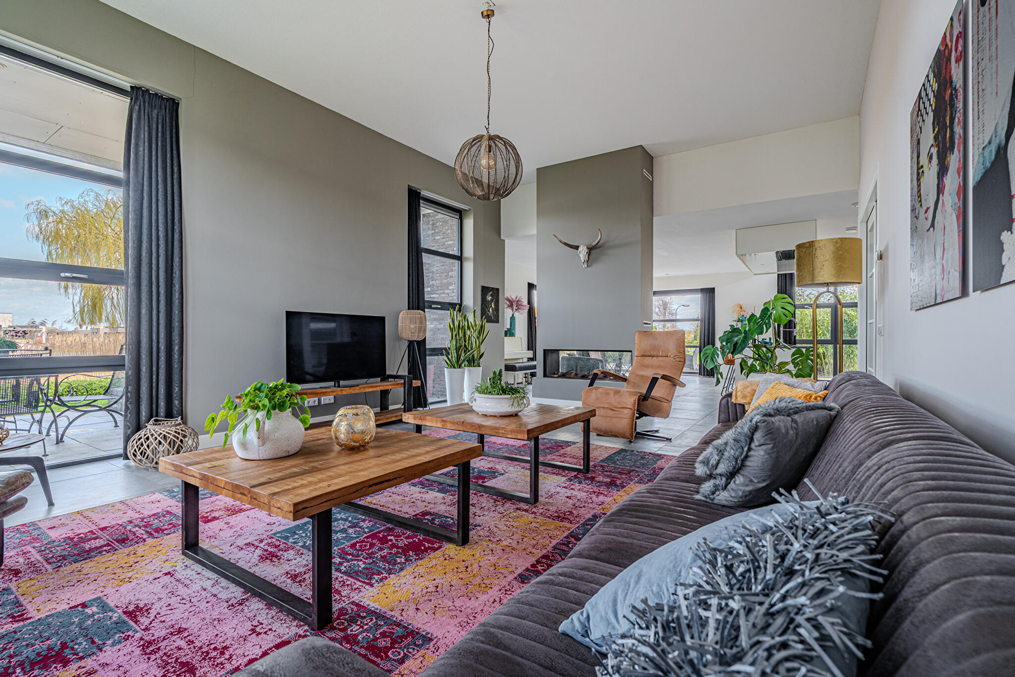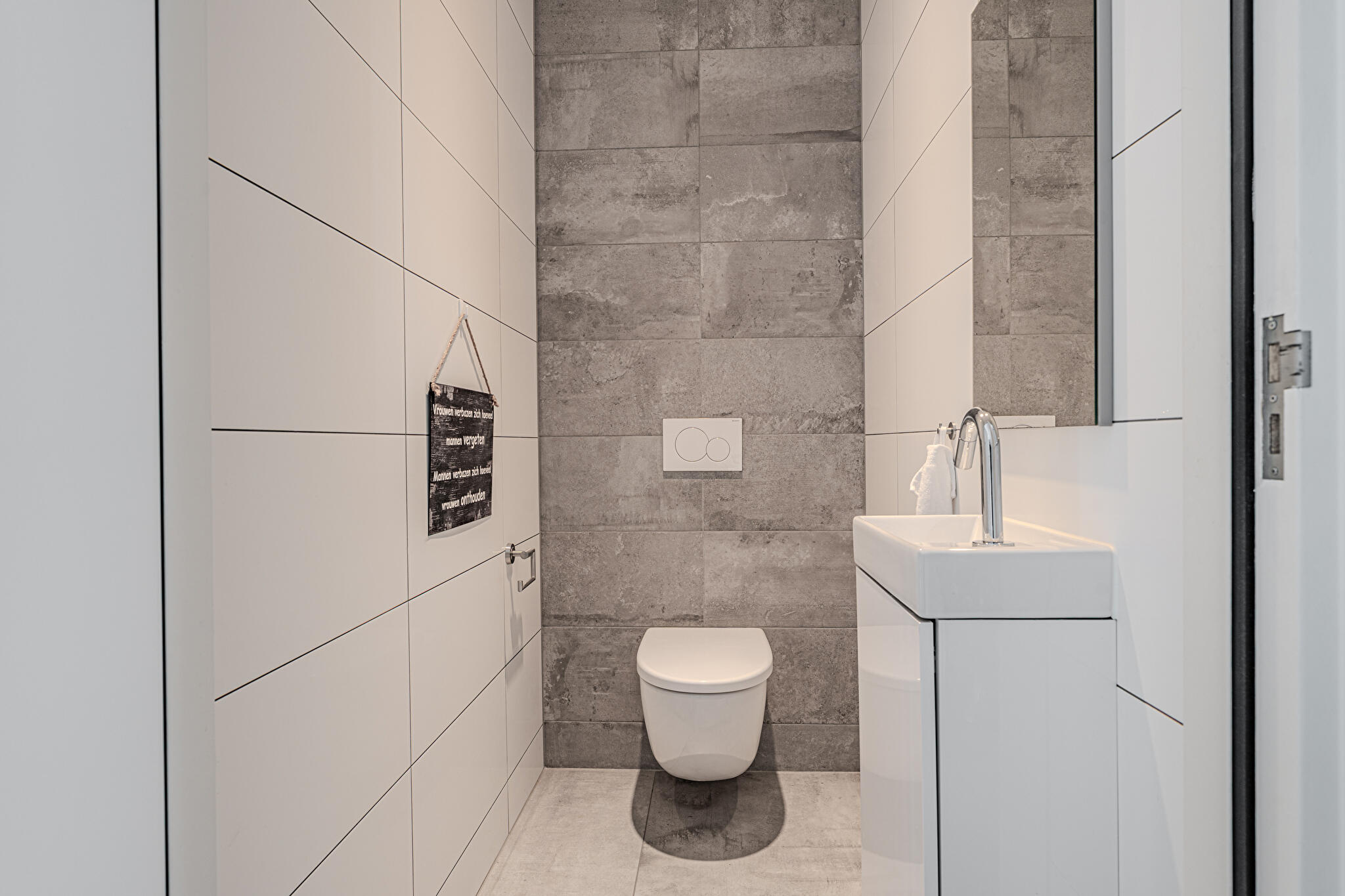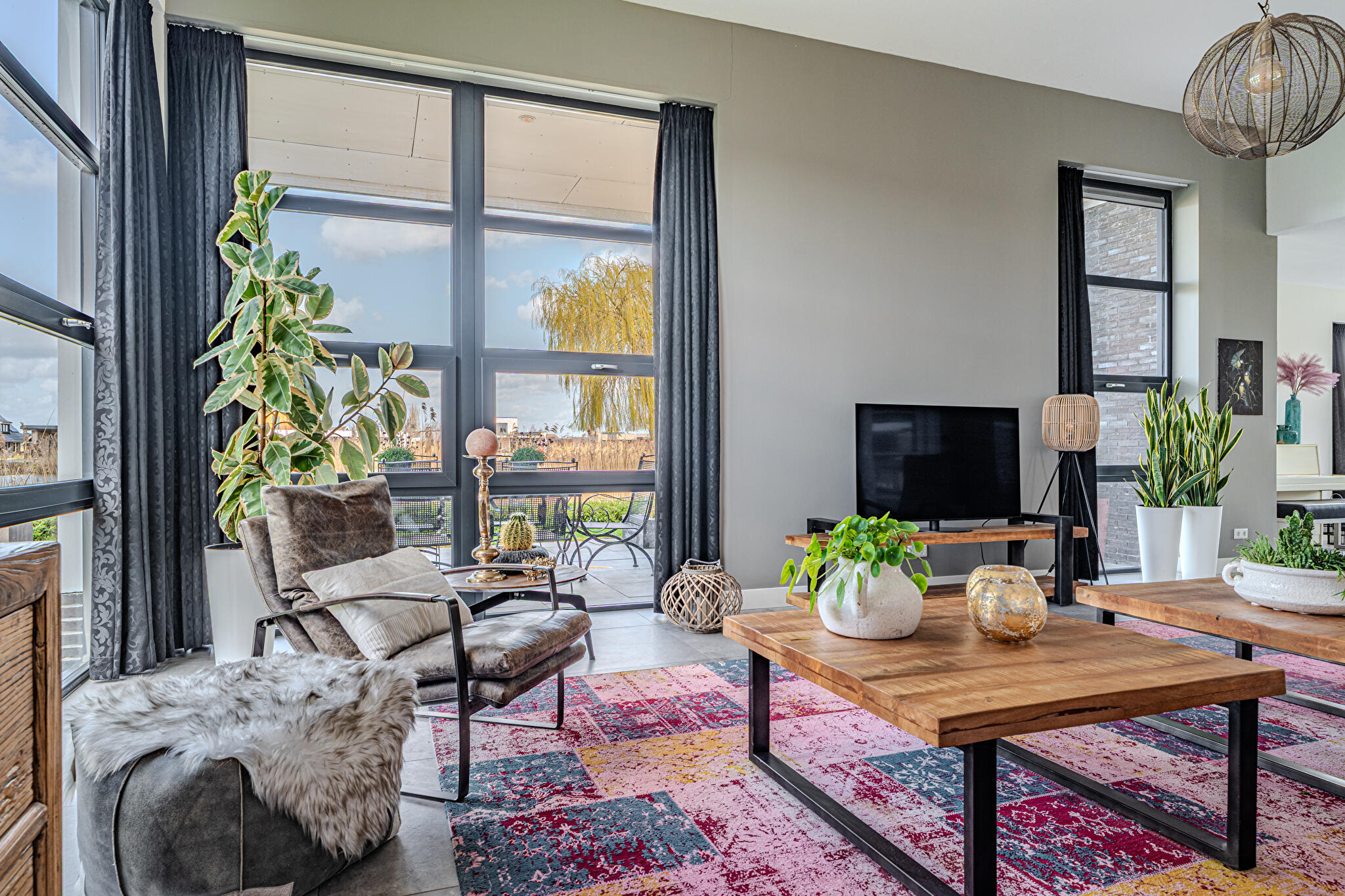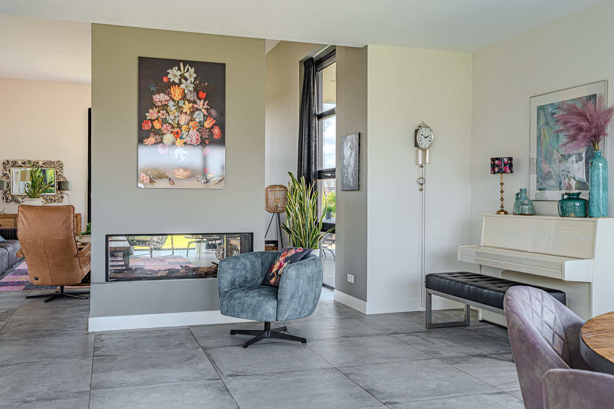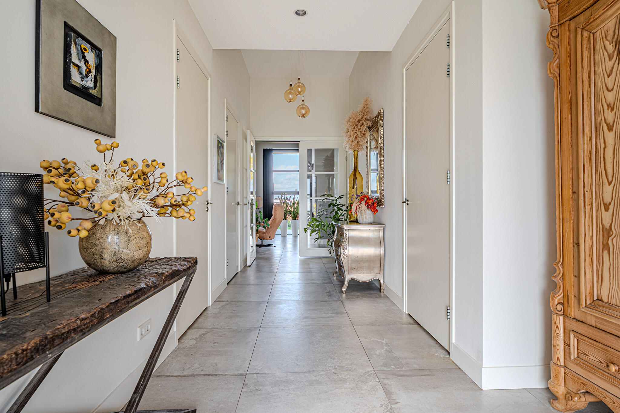 Overdekt entree, ruime hal en een moderne toiletruimte met wandcloset en fonteintje. De royale woonkamer valt op door grote raampartijen, die zorgen voor een overvloed aan natuurlijk licht en een prachtig uitzicht op de tuin en het Oldambtmeer. De open leefruimte creëert een fijne balans tussen wonen, koken en ontspannen.