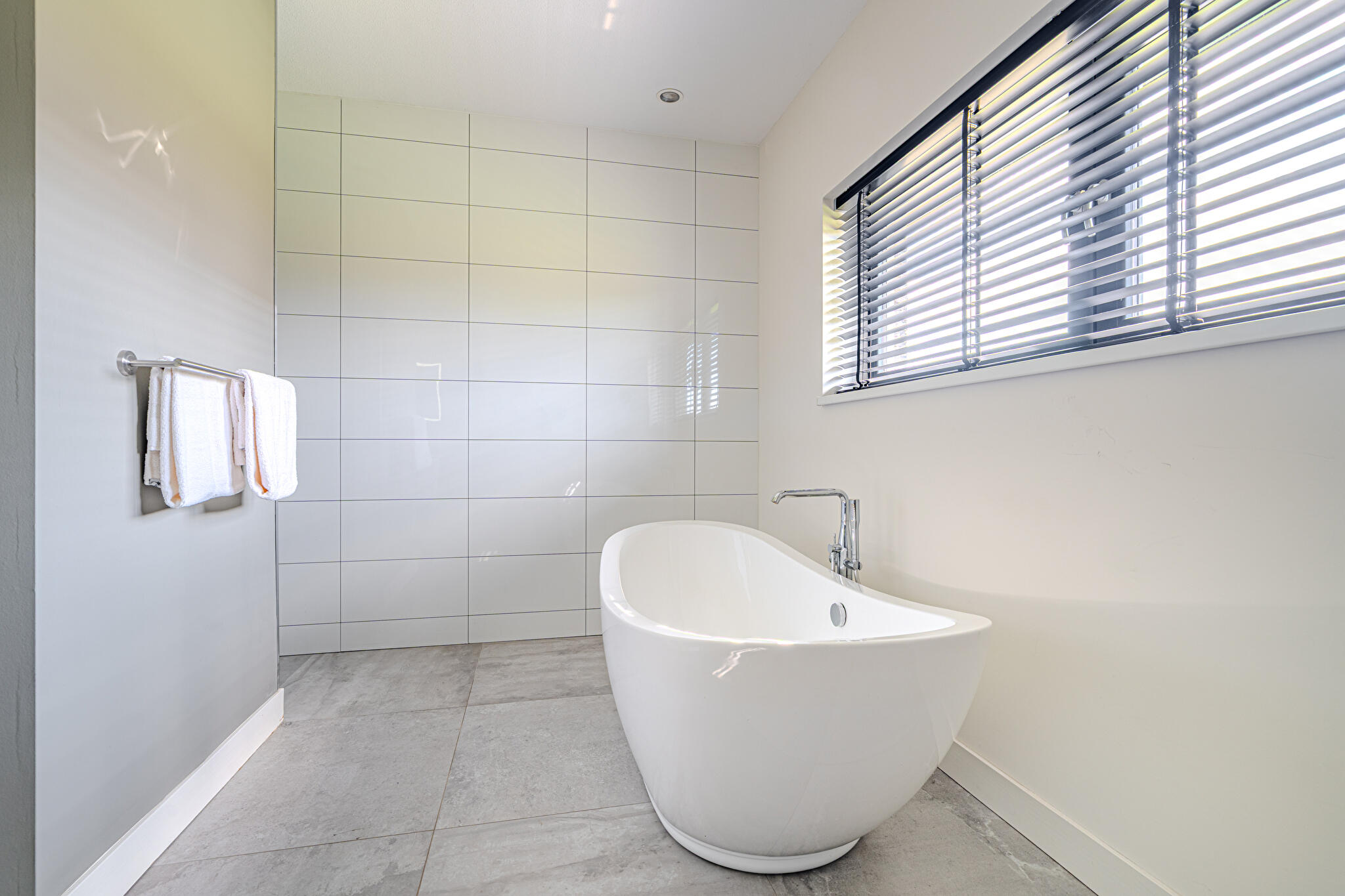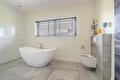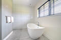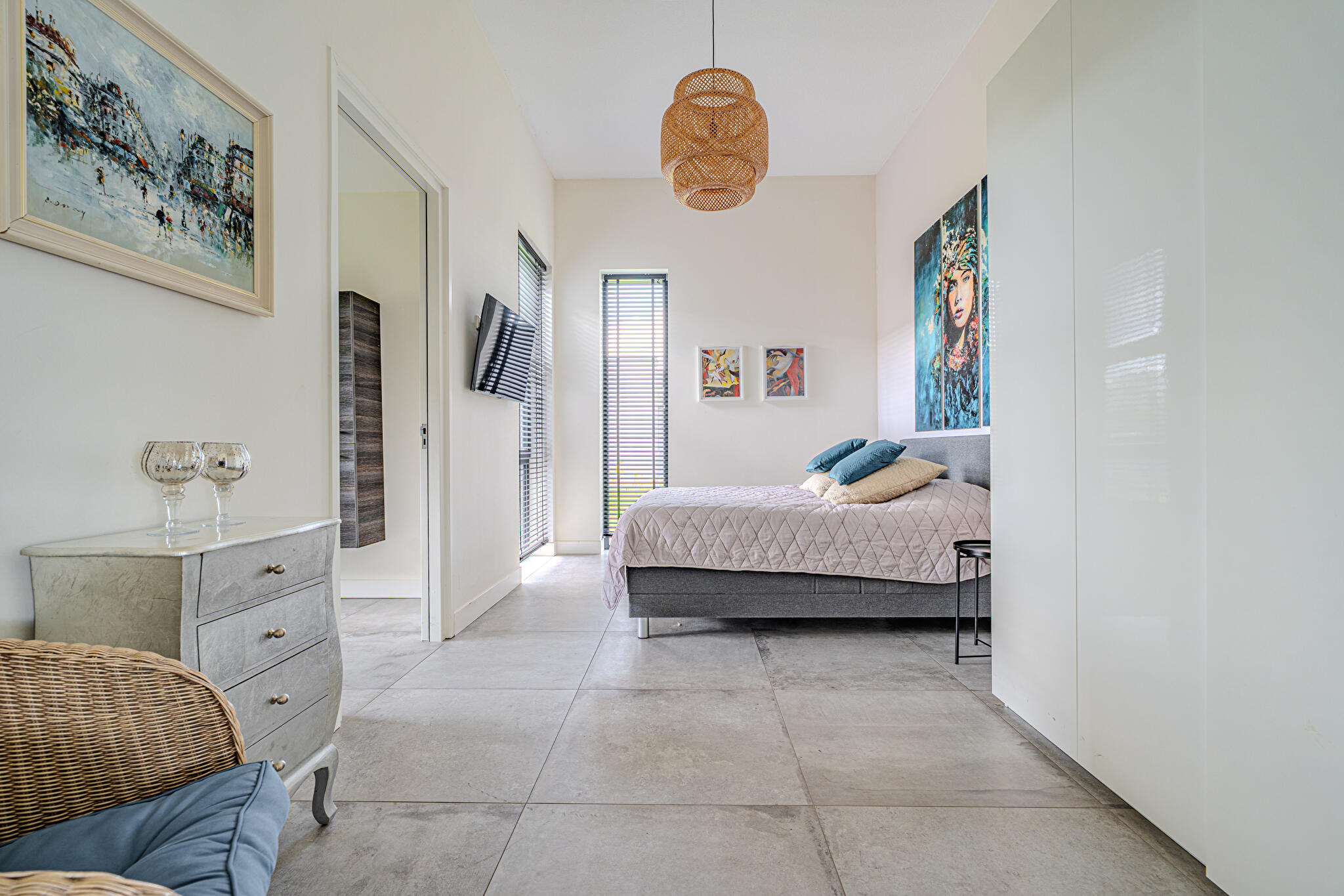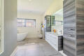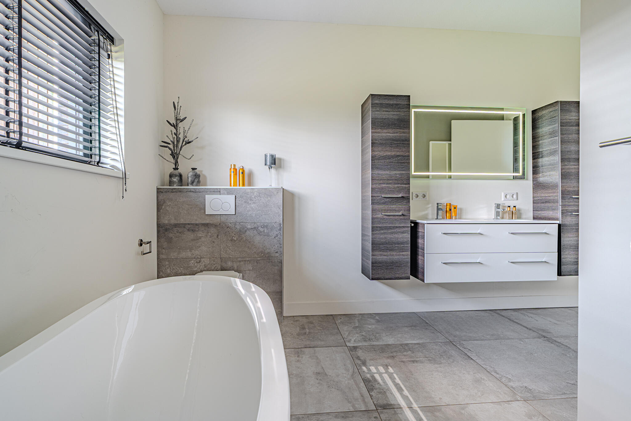De bungalow beschikt over twee ruime slaapkamers, elk direct toegang tot een eigen badkamer. Eén badkamer is luxe uitgevoerd met een vrijstaand ligbad, inloopdouche, dubbele wastafel met meubel en wandcloset. De tweede badkamer is voorzien van een inloopdouche en een wastafel met meubel. Daarnaast is een praktische bijkeuken voorzien van witgoedaansluiting en een inpandige garage met direct toegang tot de woning, bijkeuken en tuin.