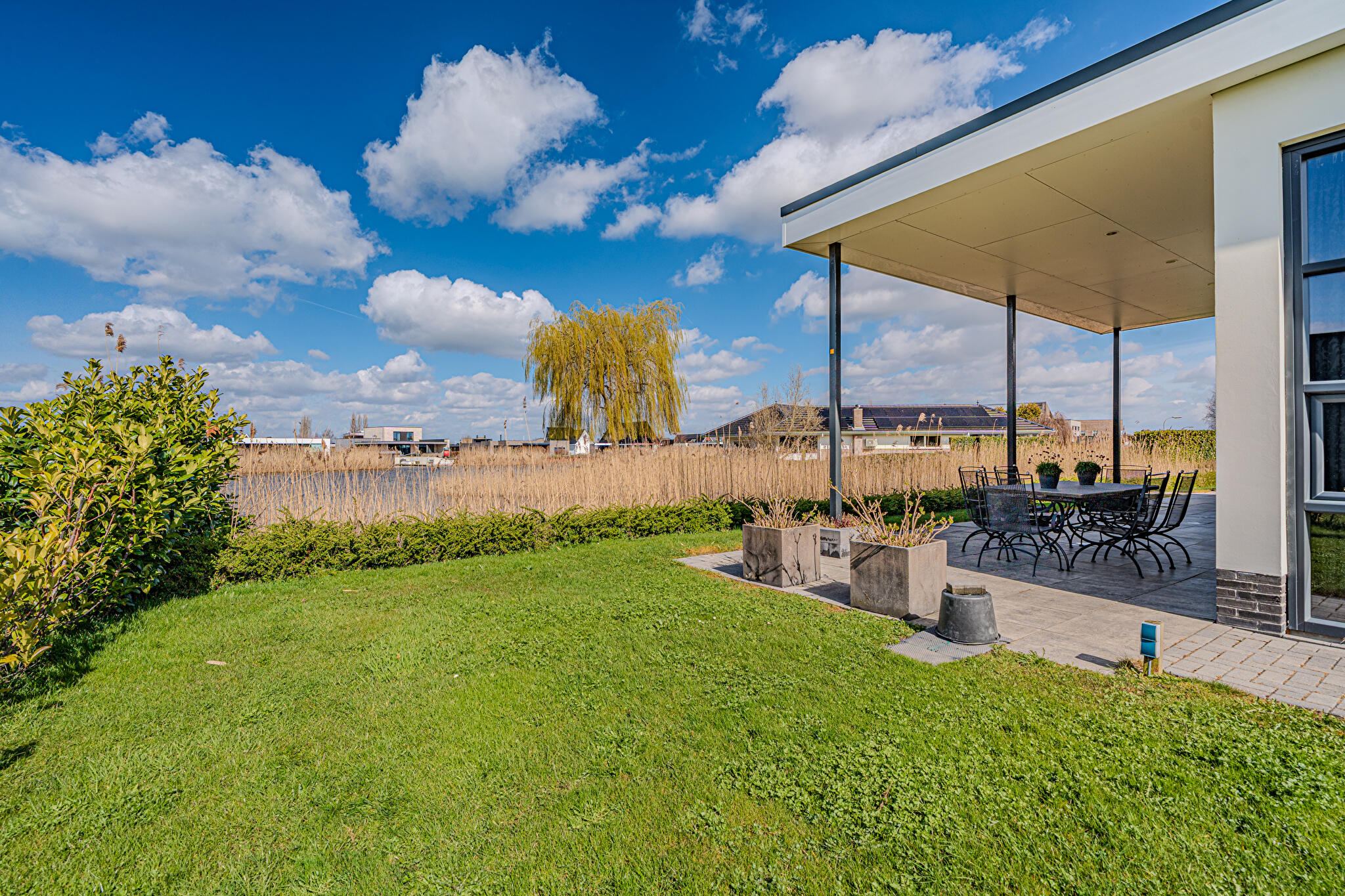 Een royale tuin met volop privacy en mogelijkheden. Geniet in alle rust van lange zomeravonden op het terras of onder de overkapping. De ruime kavel geeft het gevoel van vrijheid en exclusiviteit, met een eigen aanlegsteiger zodat u een ideale plek heeft om te zwemmen of het aanmeren van uw eigen bootje. Een woning wat u het ultieme vakantiegevoel geeft.