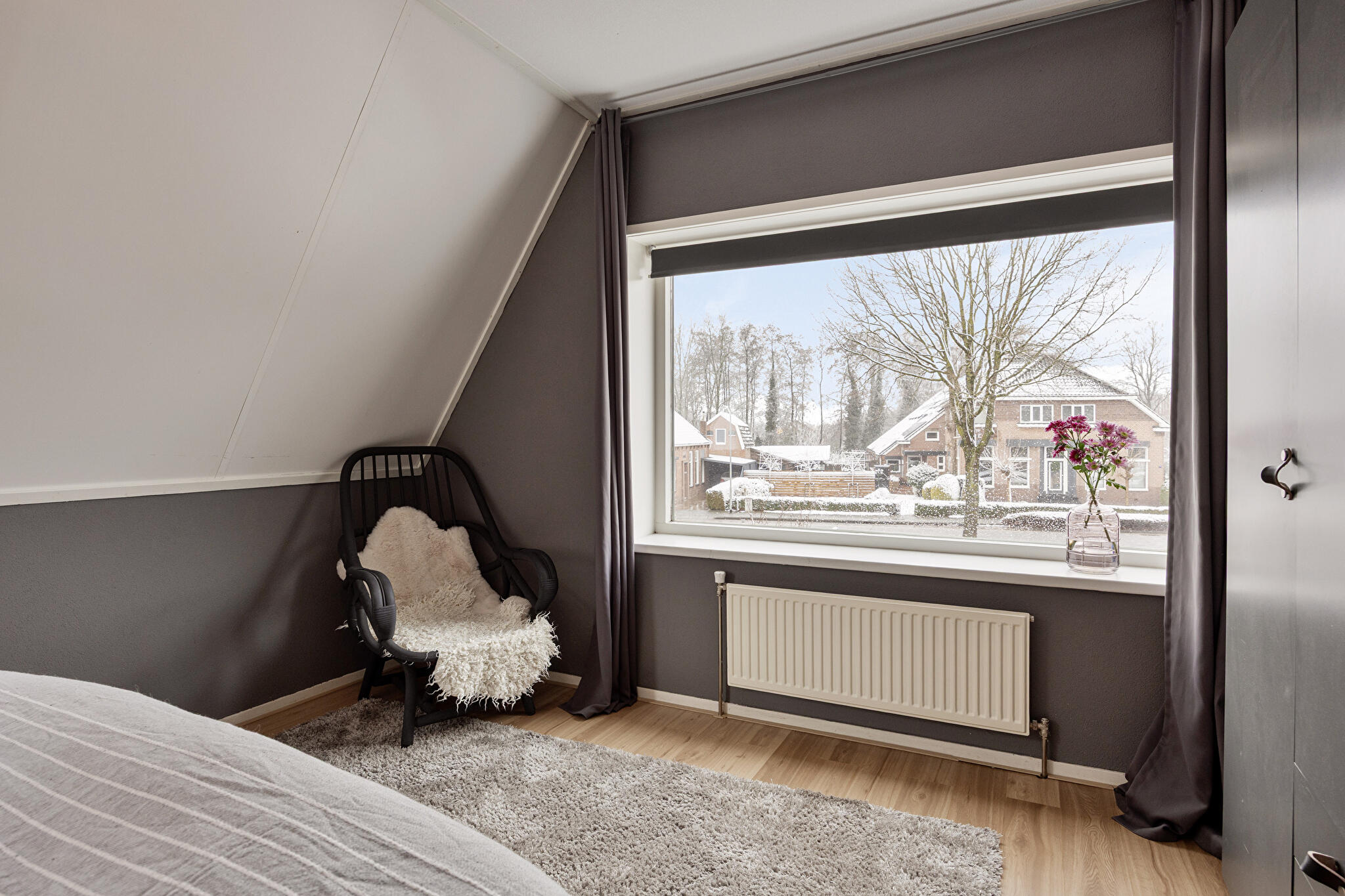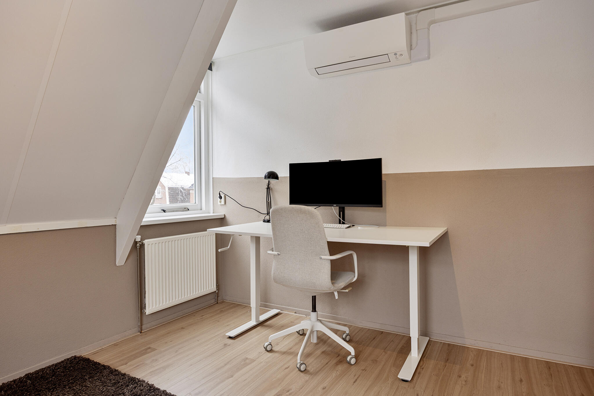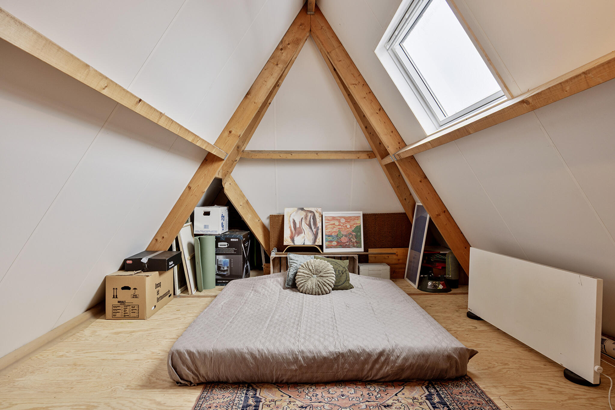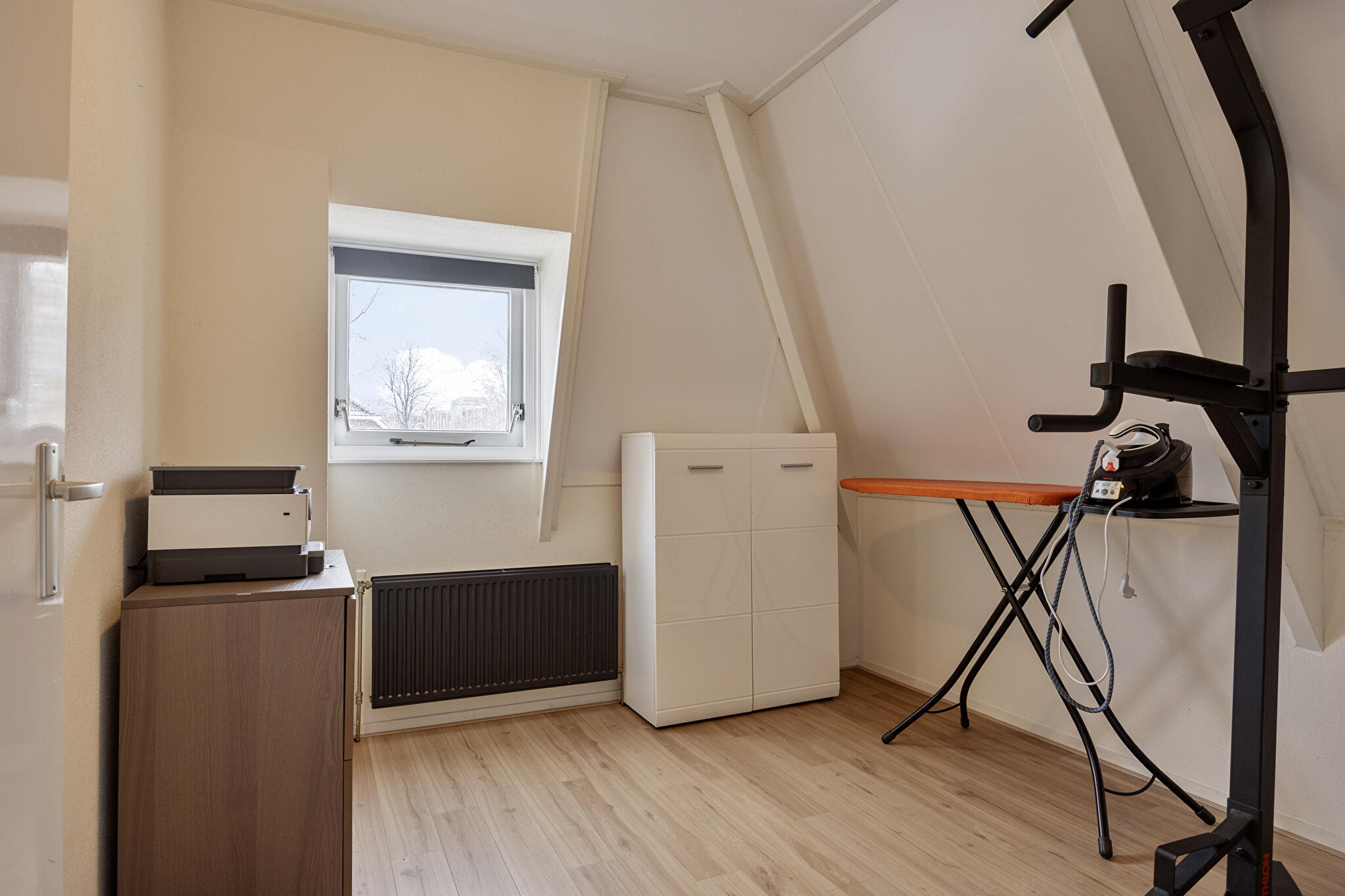 Tweede verdieping: via een vaste trap bereikbaar, met een volledig elektrisch bedienbaar dakraam en volop mogelijkheden voor een vierde slaapkamer, kantoor of hobbyruimte.