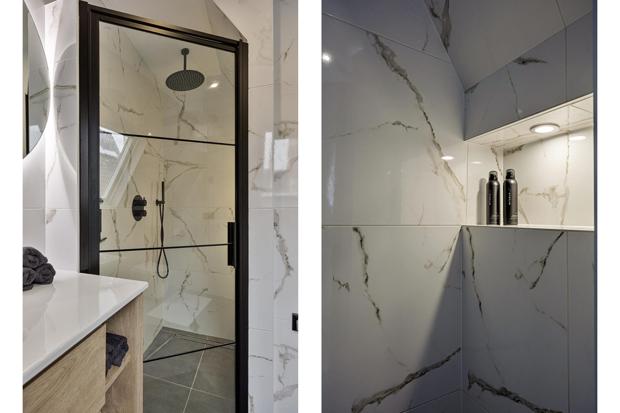 Eerste verdieping: overloop, totaal 3 slaapkamers waarvan 2 met dakkapel, 2e badkamer voorzien van inloopdouche, wandcloset, wastafel met meubel en infraroodpaneel.