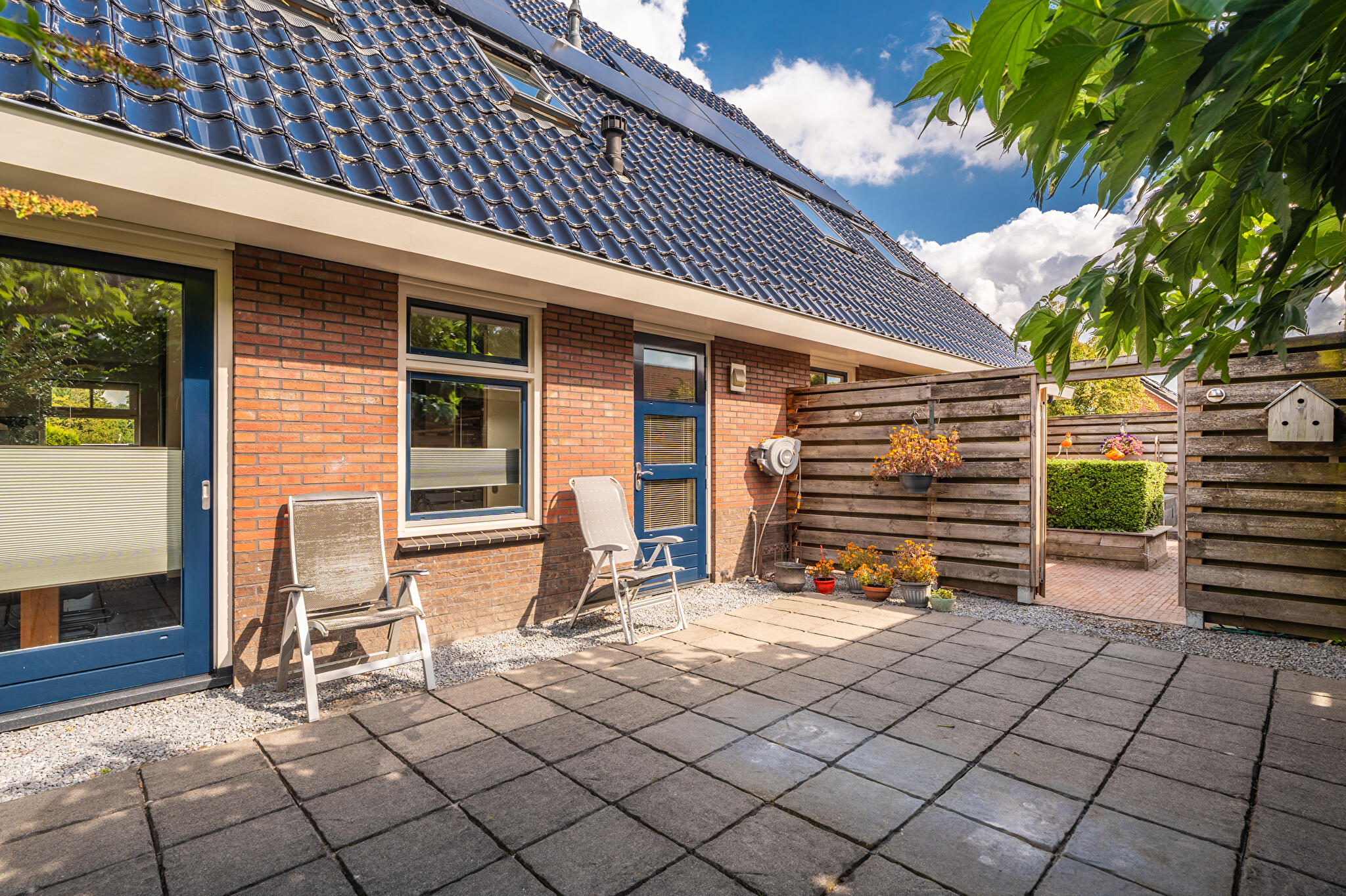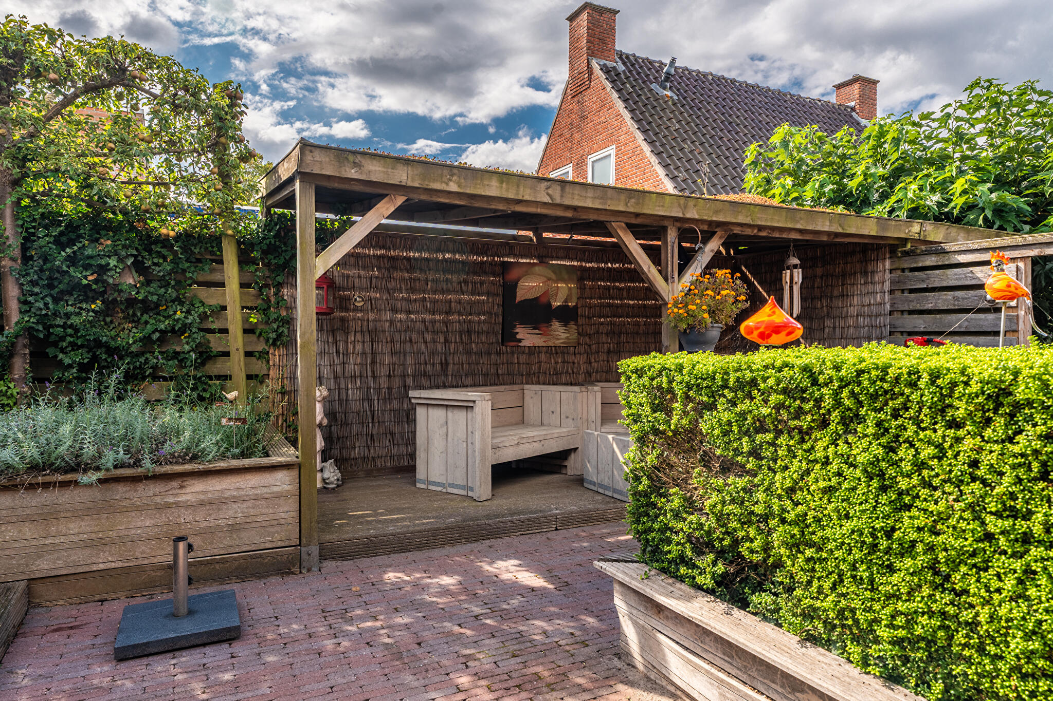 Fraaie tuin rondom, voorzien van een houten overkapping, kas en praktische schuur. Een heerlijke plek om te genieten van rust, ruimte en het buitenleven.