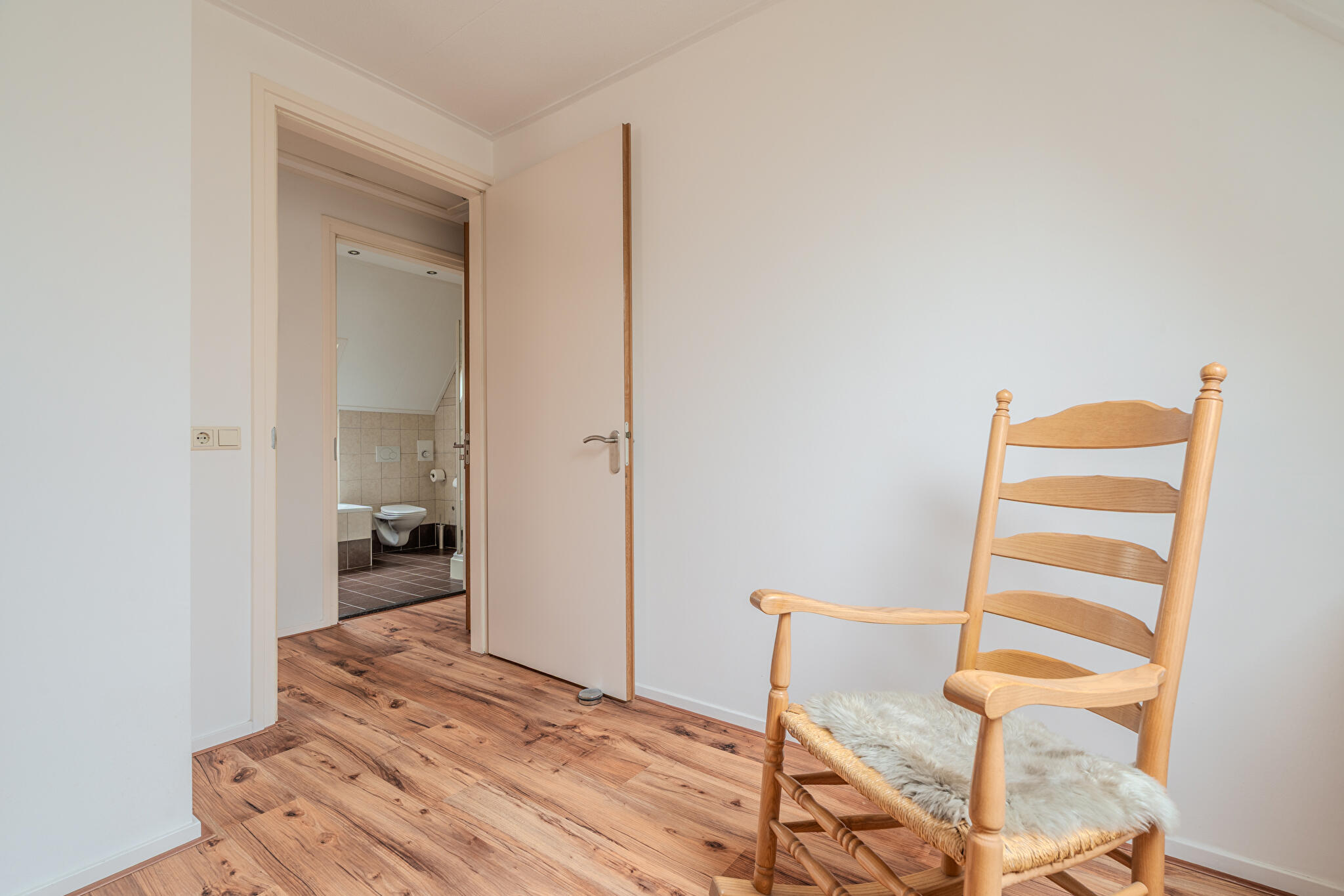 Overloop, vier ruime slaapkamers, waaronder een indrukwekkende slaapkamer van maar liefst 48 m² boven de praktijkruimte – een echte eyecatcher. De badkamer is uitgerust met vloerverwarming, ligbad, douche, wandcloset en vaste wastafel.