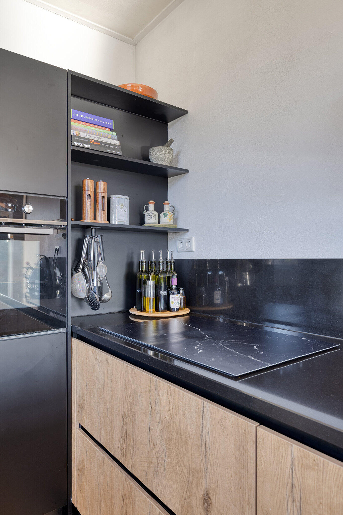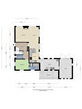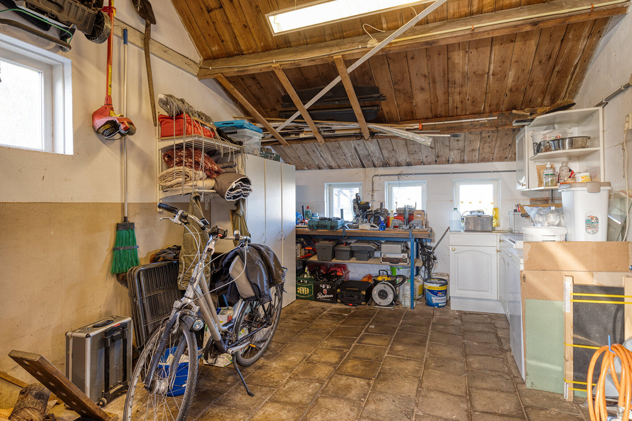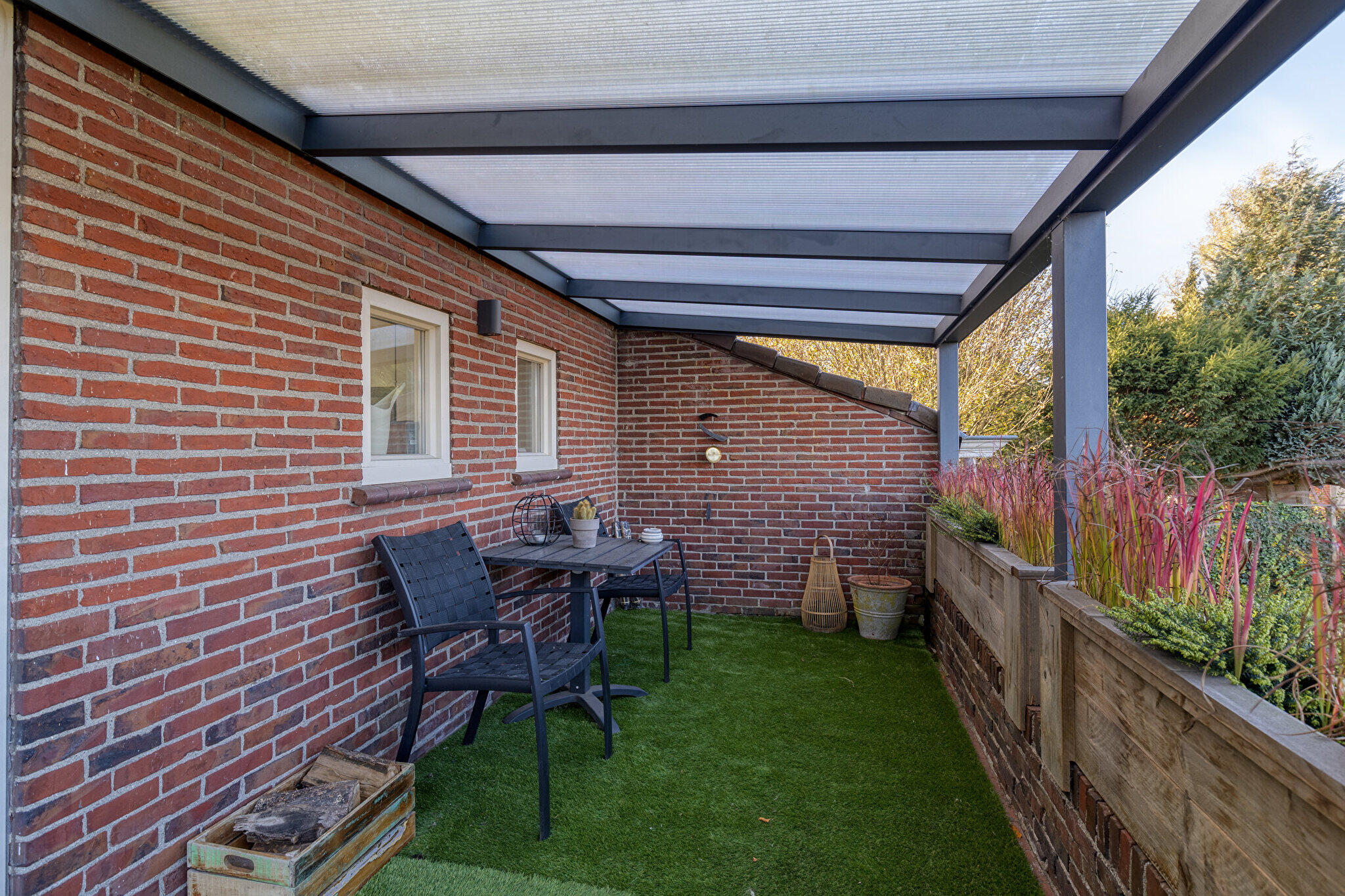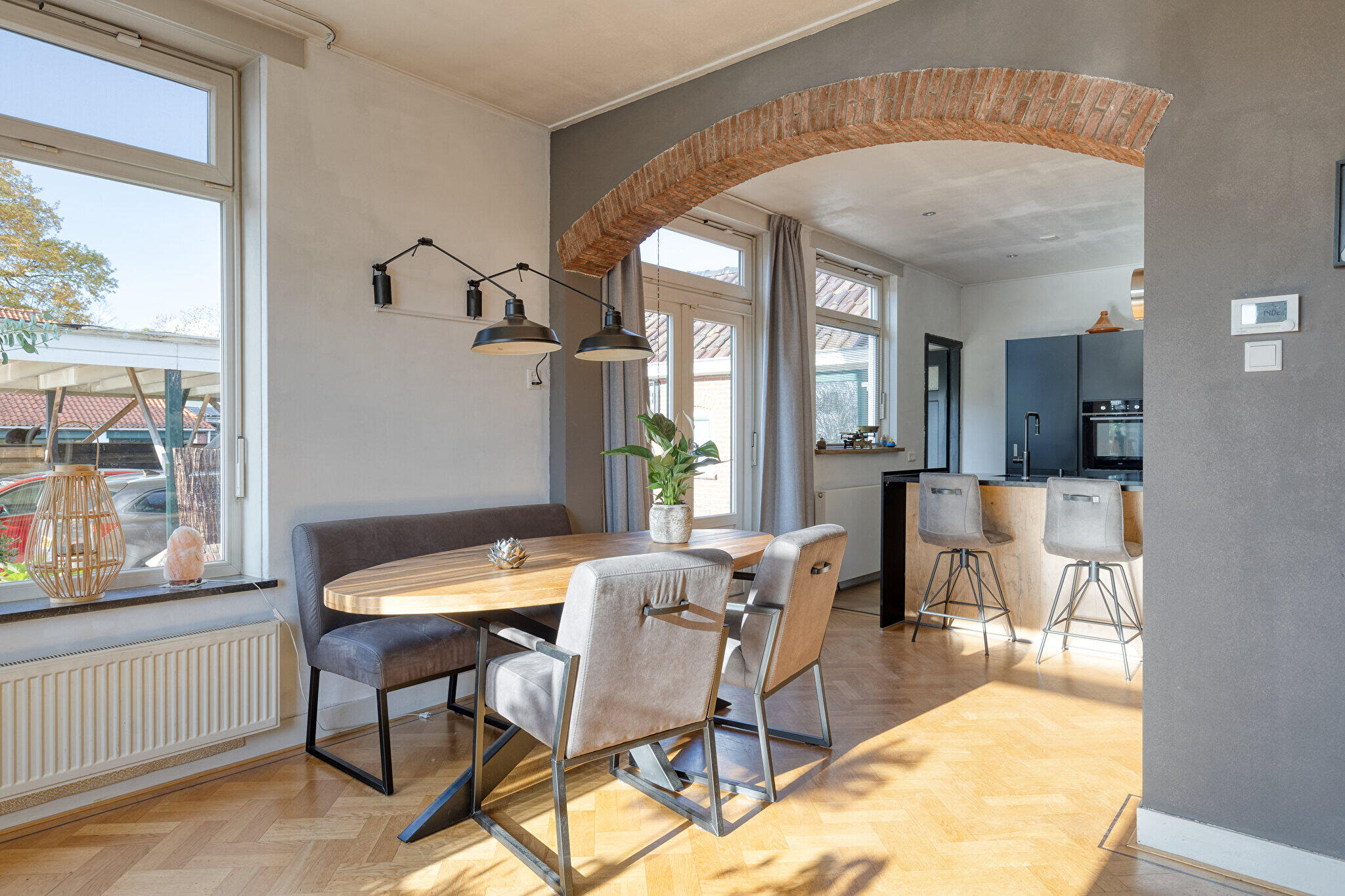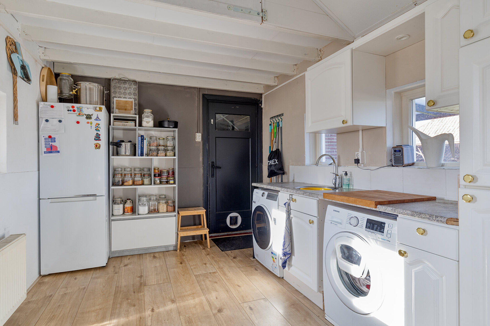 Begane grond: zij-entree, /hal met bordestrapopgang, tussenhal met toegang tot kelder, moderne toiletruimte met wandcloset en fonteintje, L-vormige woonkamer, open keuken met moderne U-vormige keukeninrichting (2021) voorzien van diverse inbouwapparatuur en openslaande tuindeuren naar terras, slaap-/ hobbykamer, met vaste kast, aangrenzende badkamer met ligbad, vaste wastafel met meubel en vaste kast, zeer grote bijkeuken met achterentree, tuindeur naar overkapping en toegang tot de garage.