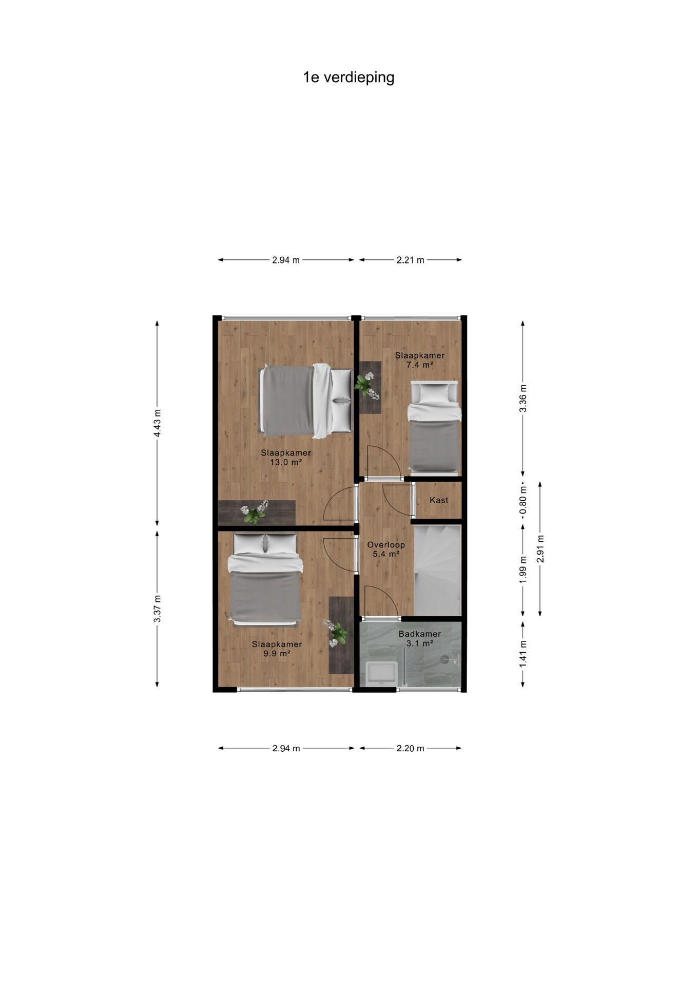 Eerste verdieping: overloop met vaste kast, 3 ruime slaapkamers, badkamer met douchegelegenheid, vaste wastafel en designradiator.