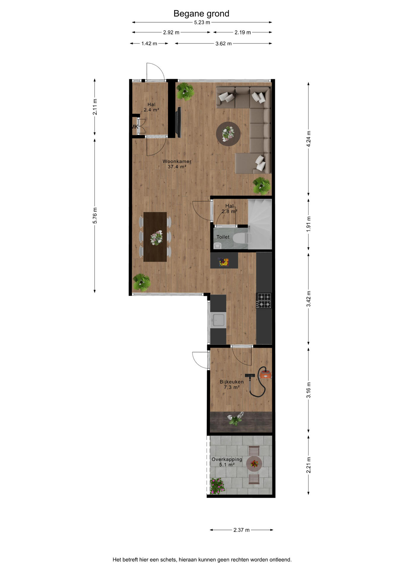 Begane grond: hal/entree, Z-vormige woon-/eetkamer, tussenhal met trapopgang en toiletruimte met wandcloset en fonteintje, half-open keuken voorzien van diverse inbouwapparatuur (o.a. 5-pits gasfornuis, vaatwasser, combimagnetron en Quooker), bijkeuken met vaste kast en achterentree.