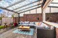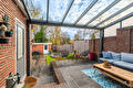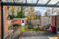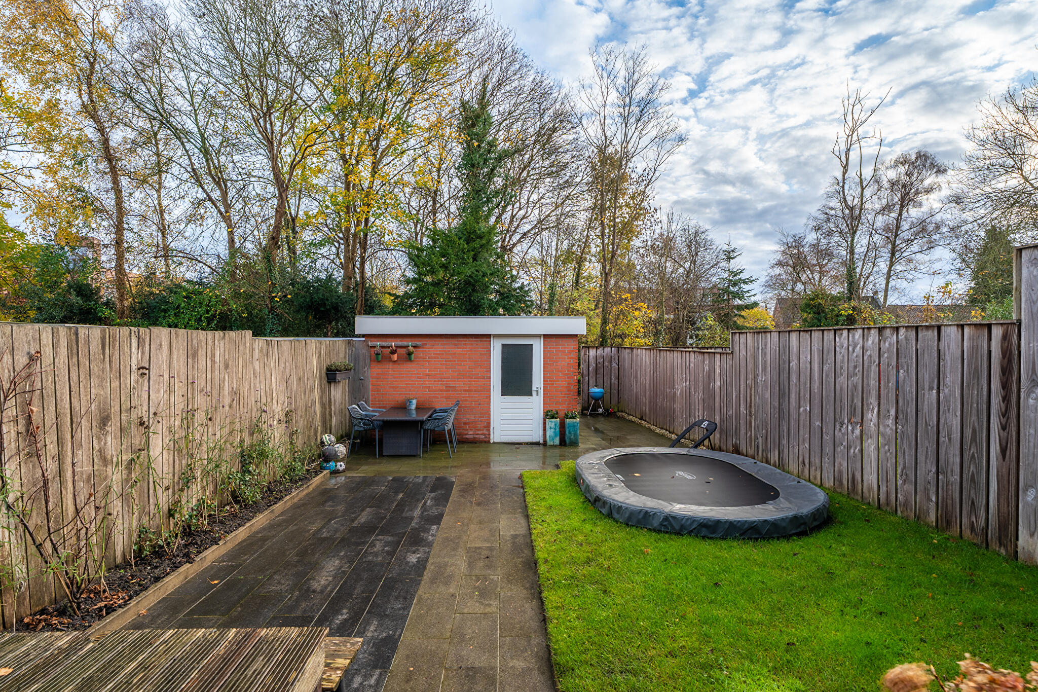 Buitenruimte: gezellige, privacyvolle achtertuin gesitueerd op het zuiden, aangebouwde overkapping met elektrische zonwering, vrijstaande stenen berging en achterom.