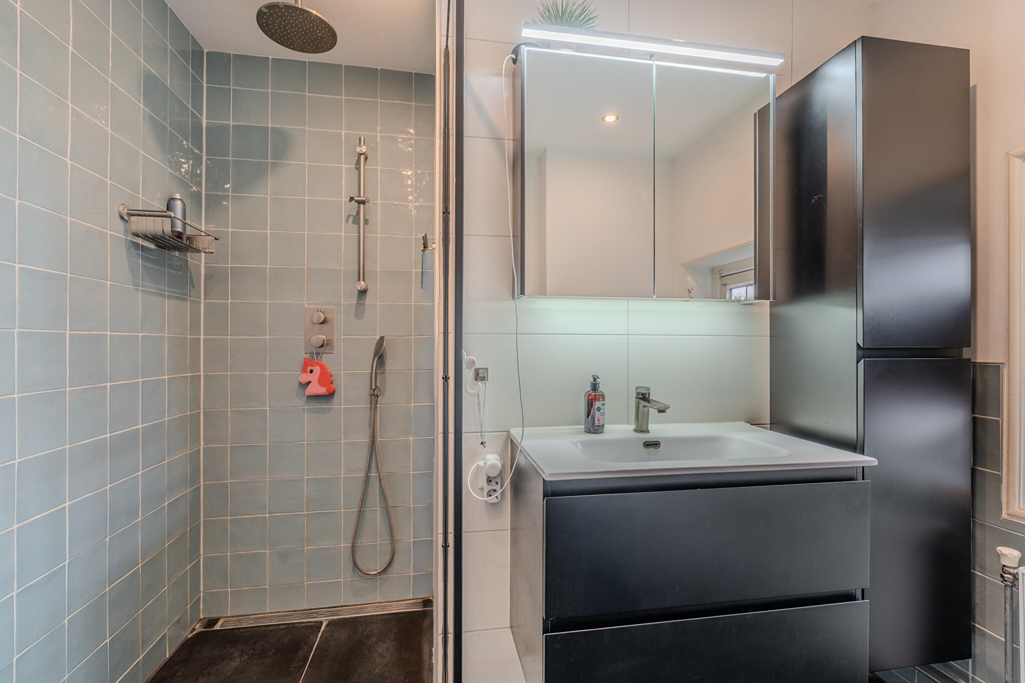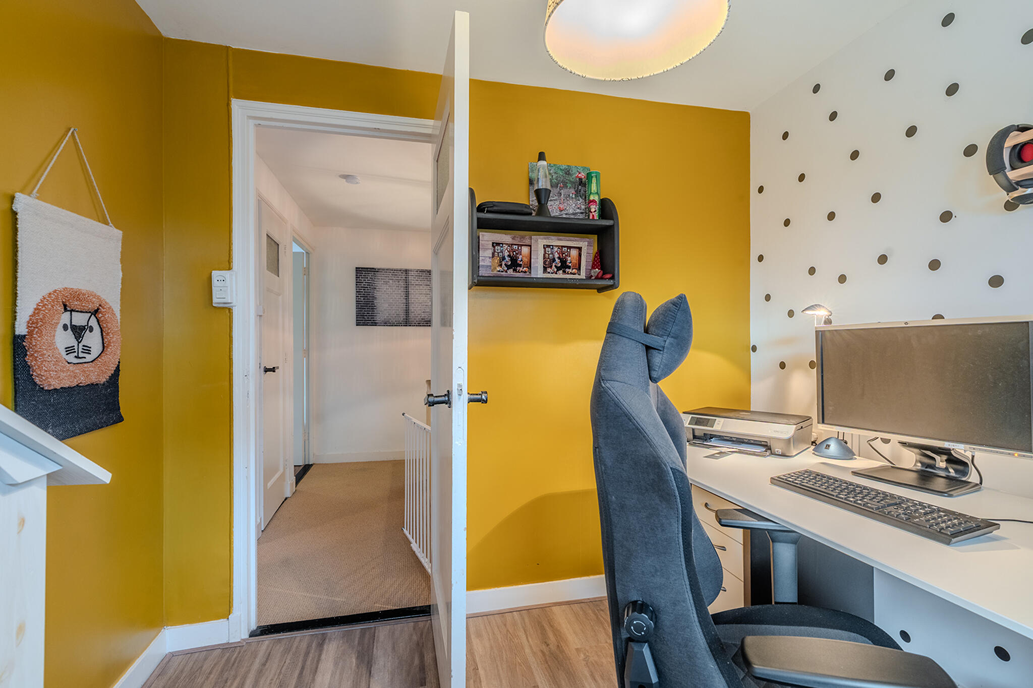 Eerste verdieping: overloop, totaal 3 slaapkamers, waarvan 1 momenteel ingericht als kantoor, badkamer voorzien van inloopdouche, 2e toilet en wastafel met meubel.