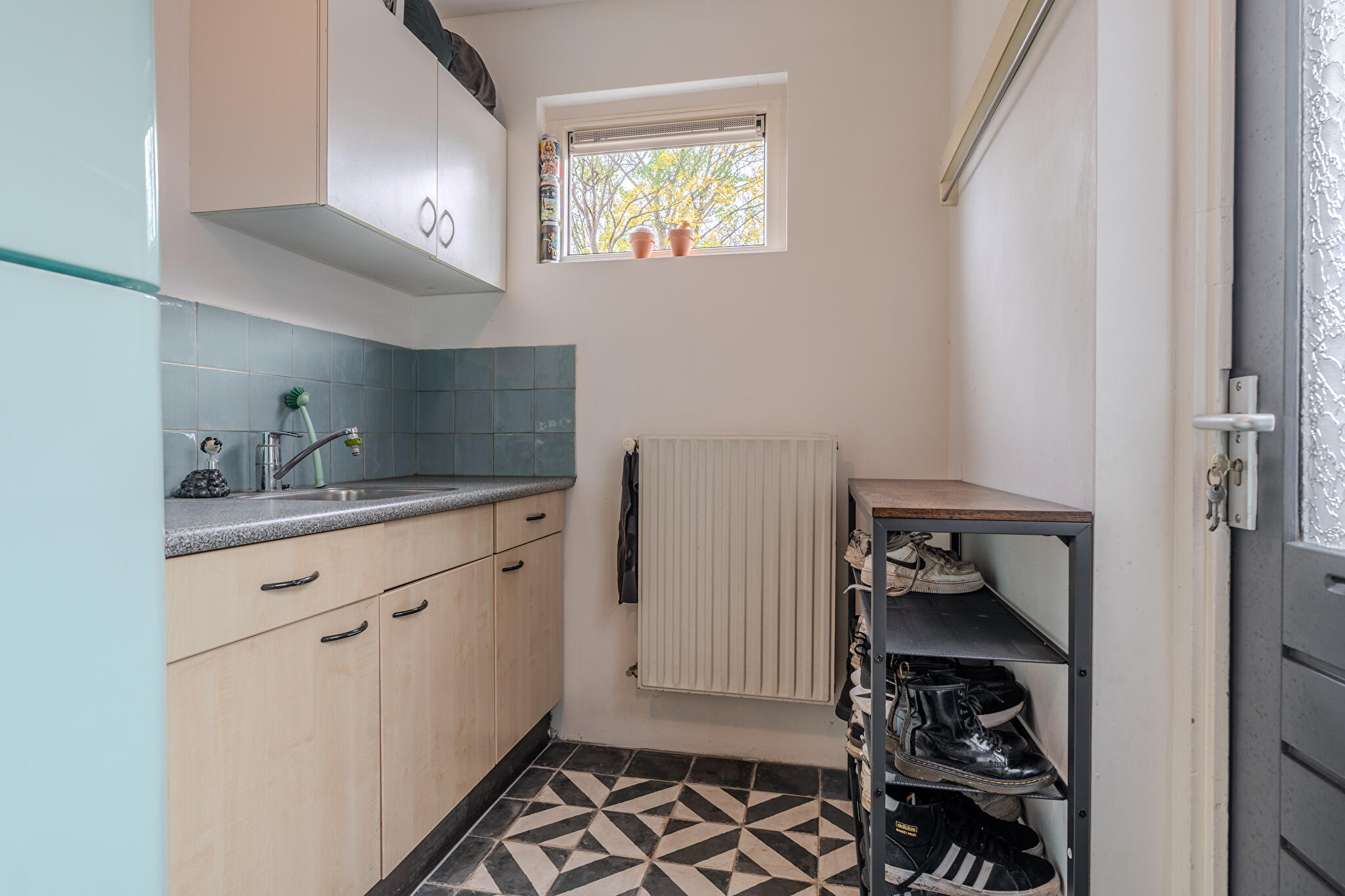 Begane grond: entree aan voorzijde van de woning, hal, toiletruimte met fonteintje, trapopgang naar de verdieping, lichte woonkamer voorzien van goed onderhouden parketvloer en sfeervolle en-suite deuren, eetkeuken met moderne hoekopgestelde keuken en openslaande terrasdeuren naar de achtertuin, praktische bijkeuken voorzien van witgoedaansluiting.