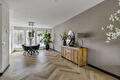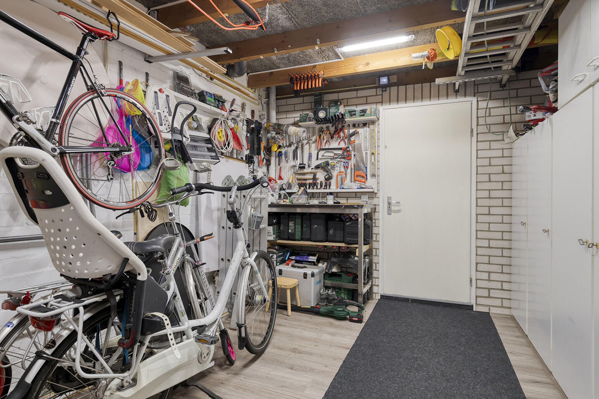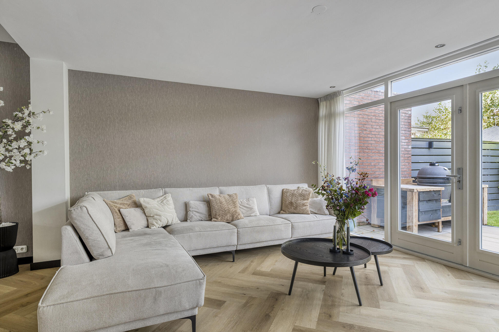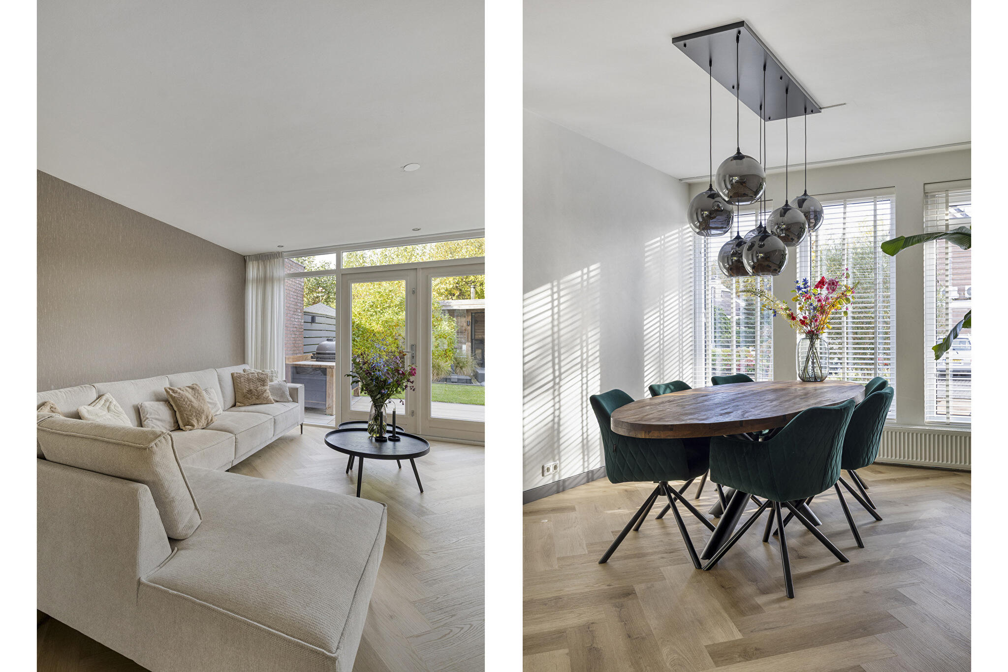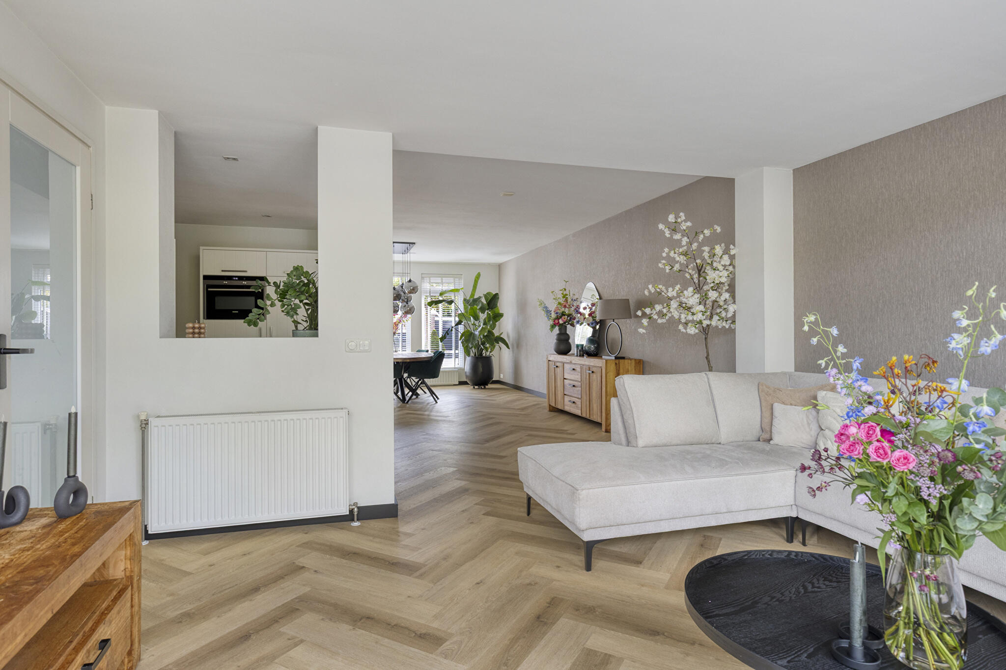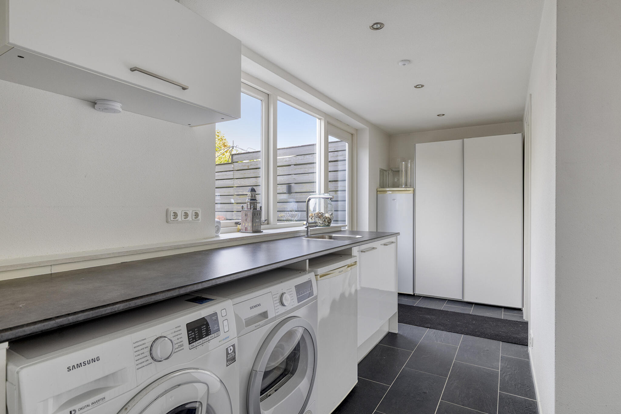 Begane grond: overdekt entree, hal met toiletruimte voorzien van wandcloset en fonteintje, en trapopgang naar de eerste verdieping. De royale, lichte woonkamer is voorzien van een Pvc-vloer, grote raampartijen en openslaande tuindeuren die toegang bieden tot het terras en de achtertuin. De open keuken is voorzien van moderne inbouwapparatuur (o.a. 4-pits gaskookplaat met wokbrander, combi-oven, afzuigkap, vaatwasser, koelkast en cooker). Aangrenzend bevindt zich een praktische bijkeuken met witgoedaansluitingen en volop bergruimte. Vanuit de bijkeuken is de garage via een tussendeur bereikbaar.