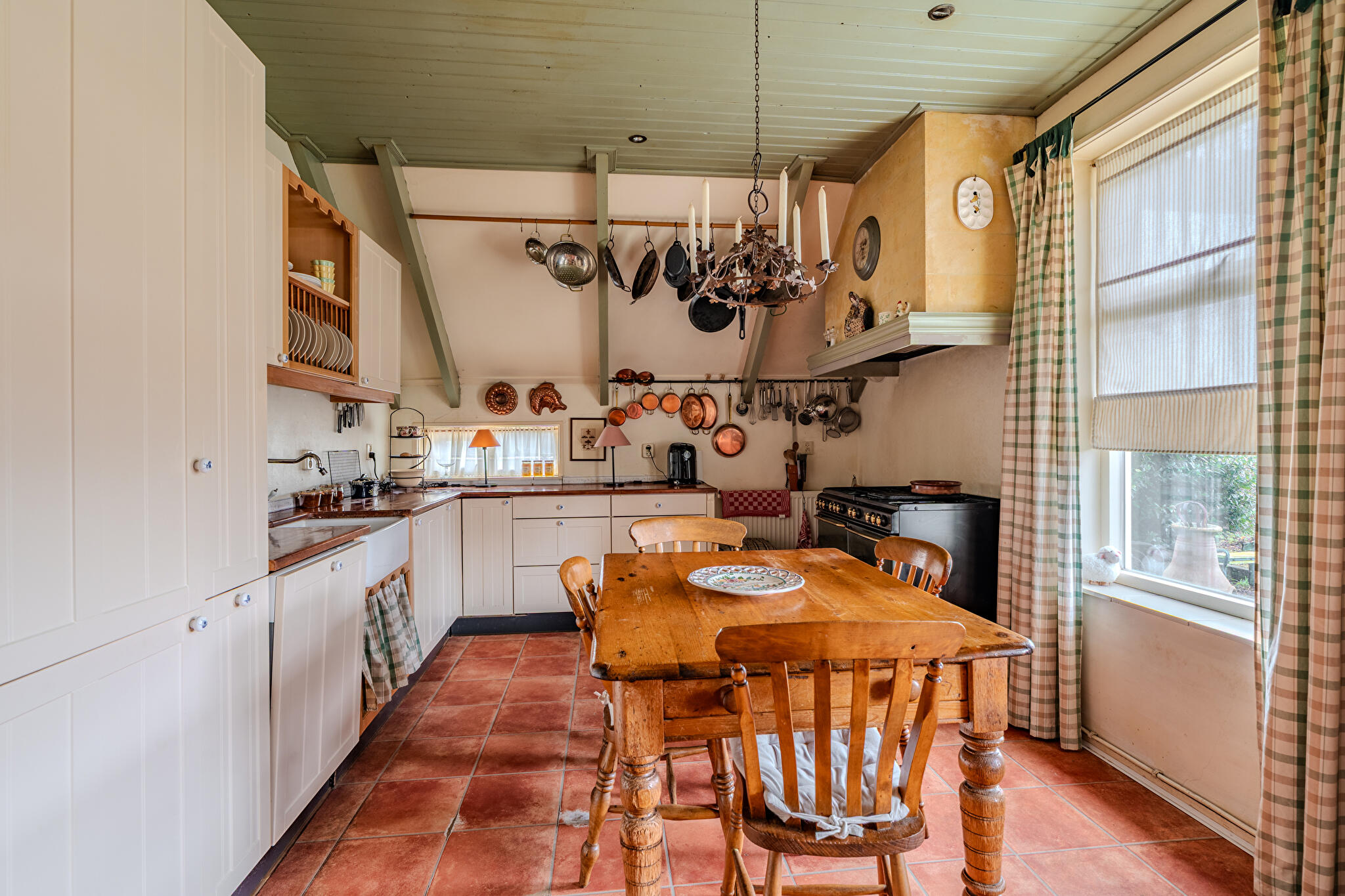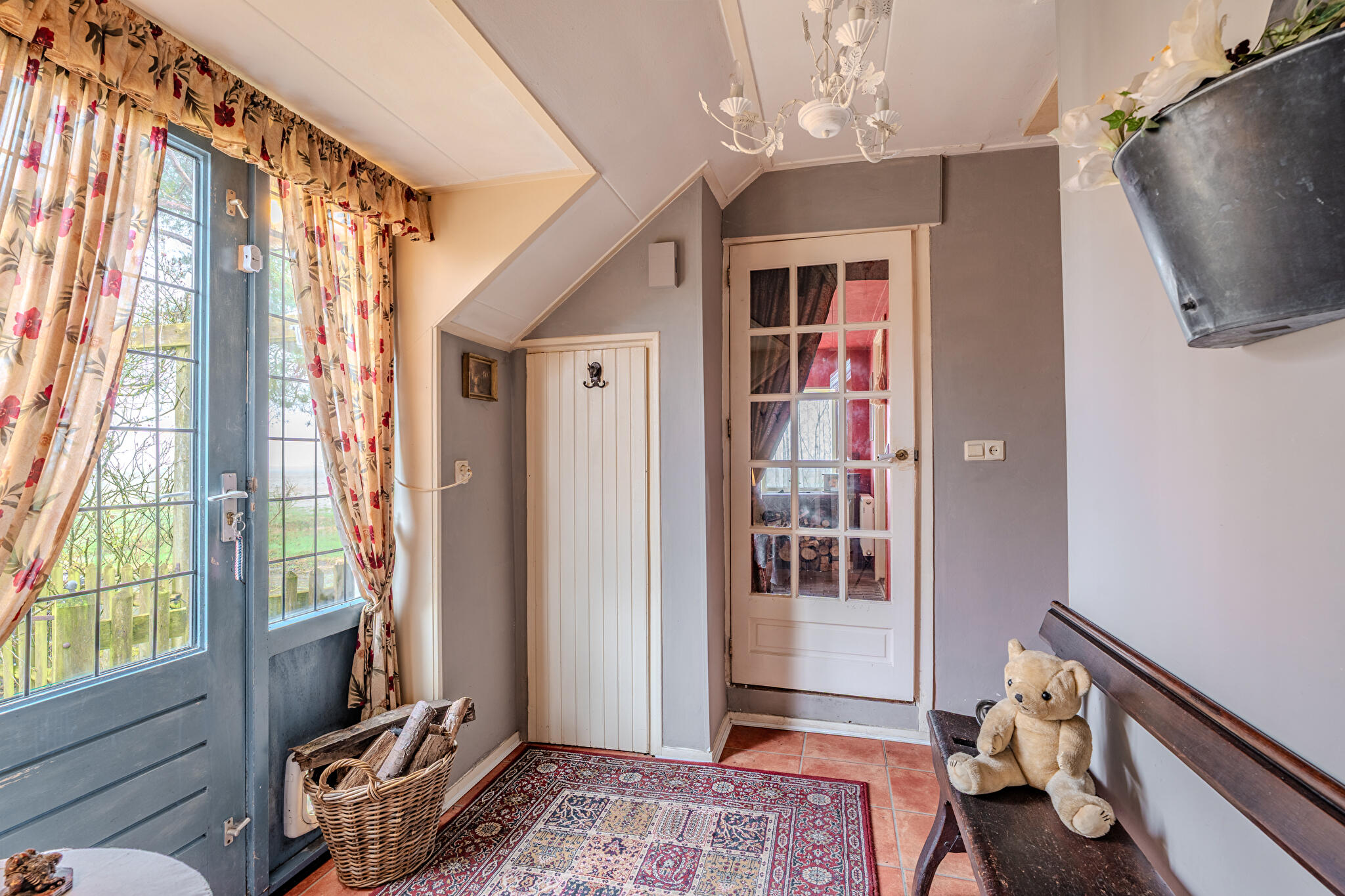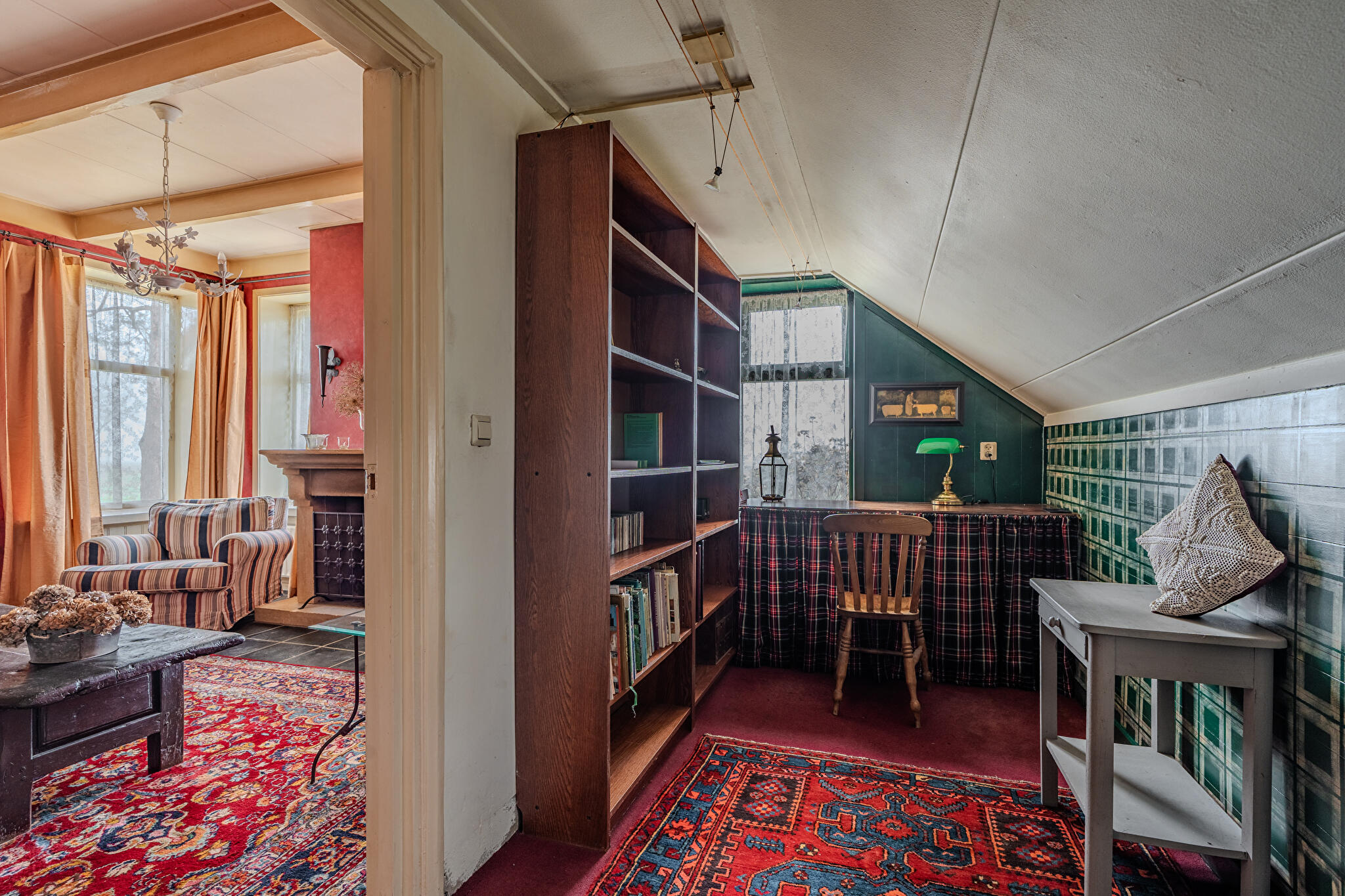 Begane grond: royale hal/entree met vaste kasten, bijkeuken/wasruimte met witgoedaansluitingen en dakraam, badkamer met douchecabine, vaste wastafel en toilet, ouderslaapkamer met dakraam, woonkamer met imposante schouw en open haard, separate hoek voor bijvoorbeeld speelruimte, hobby, kantoor etc., slaapkamer met bedstede, gezellige woonkeuken met hoekopgestelde keukeninrichting voorzien van enige inbouwapparatuur en deur naar terras.