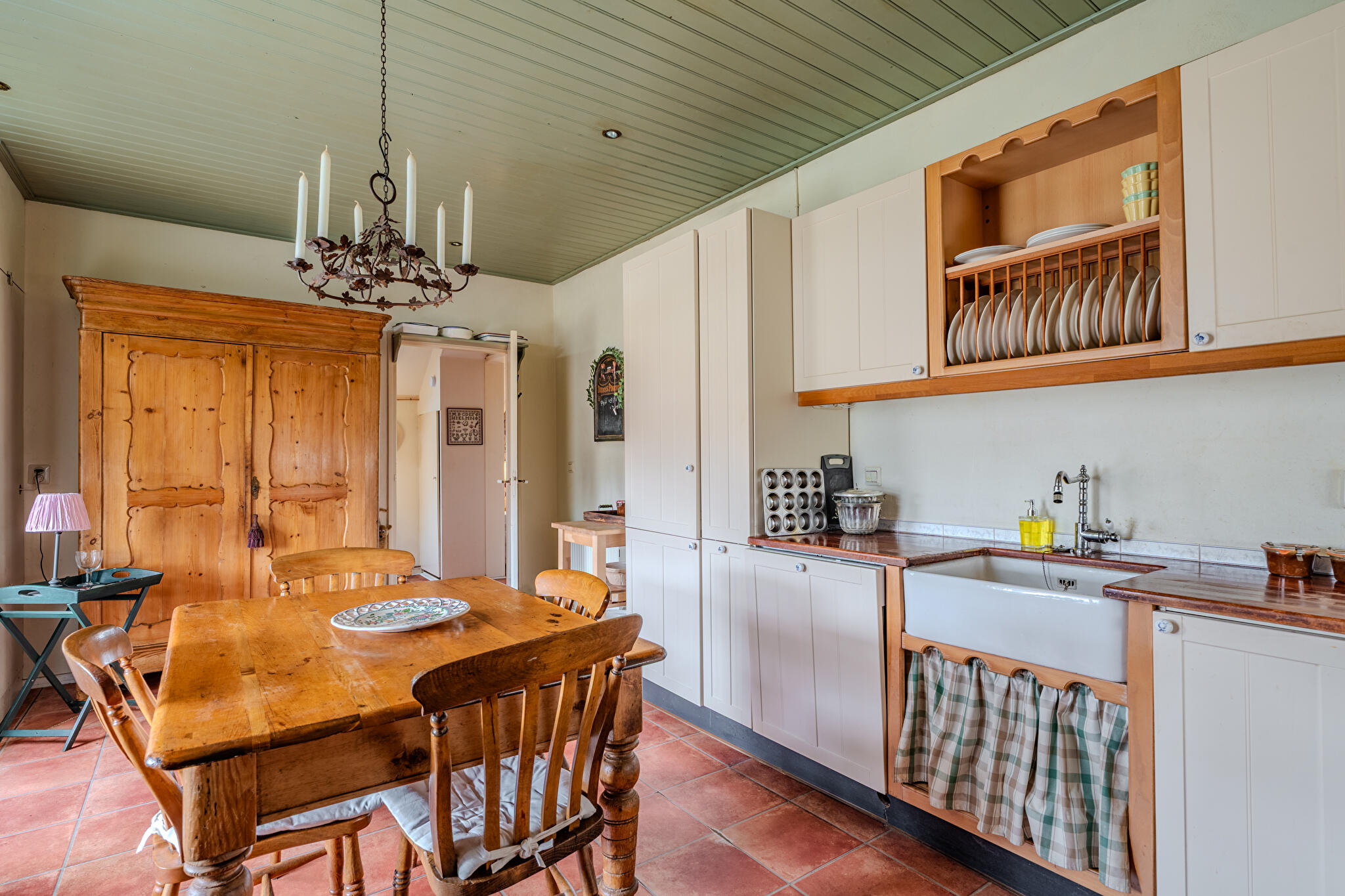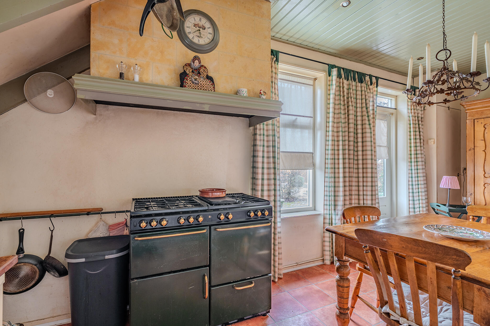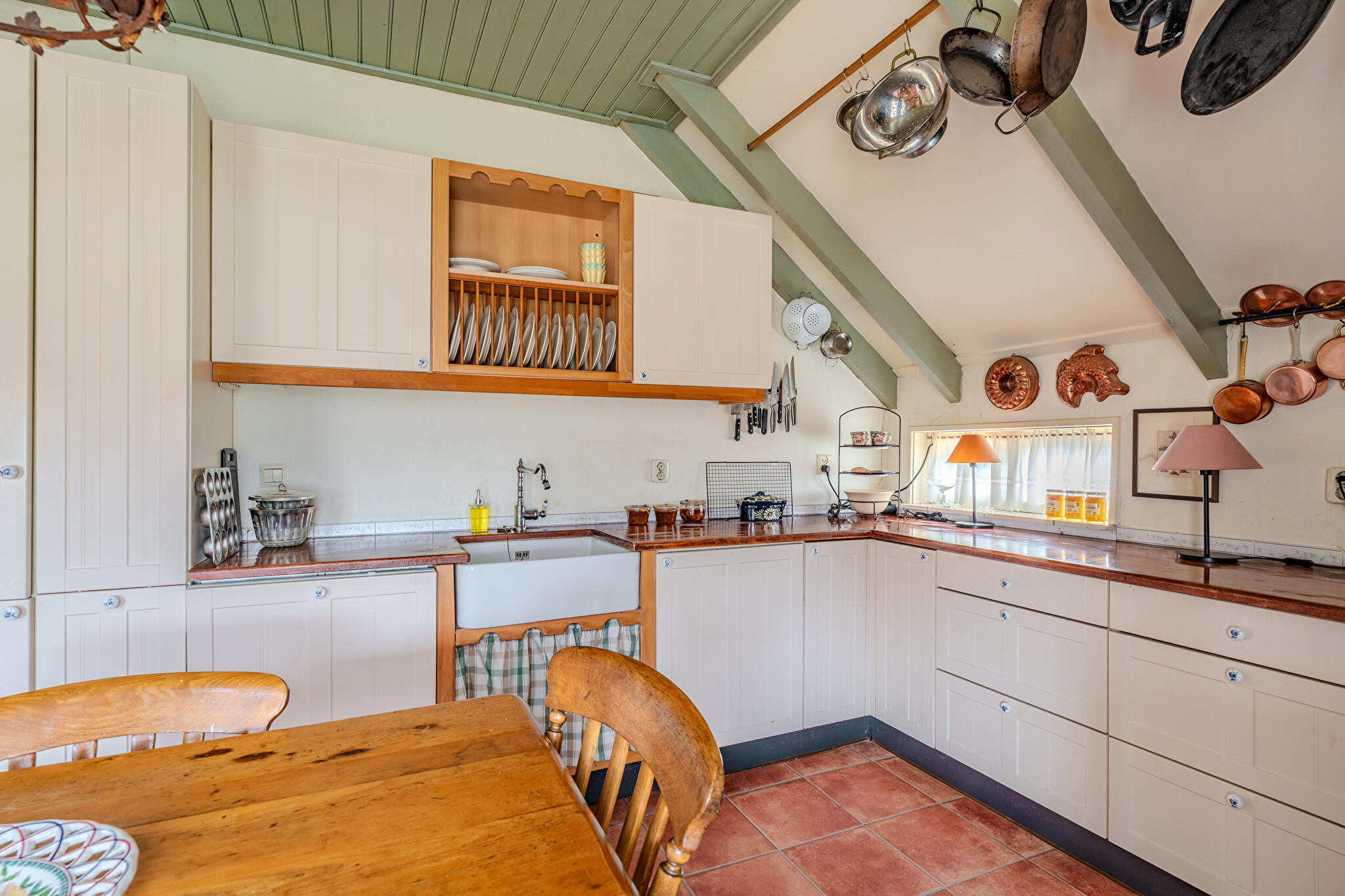Begane grond: royale hal/entree met vaste kasten, bijkeuken/wasruimte met witgoedaansluitingen en dakraam, badkamer met douchecabine, vaste wastafel en toilet, ouderslaapkamer met dakraam, woonkamer met imposante schouw en open haard, separate hoek voor bijvoorbeeld speelruimte, hobby, kantoor etc., slaapkamer met bedstede, gezellige woonkeuken met hoekopgestelde keukeninrichting voorzien van enige inbouwapparatuur en deur naar terras.