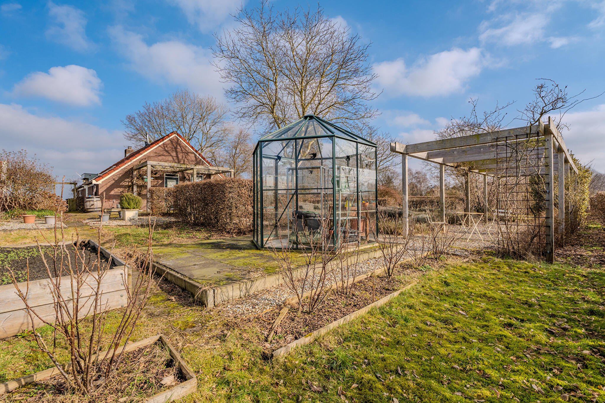Buiten: Ruime schuur, pergola en plantenkas. De tuin beschikt over een grote diversiteit aan bloemen en planten en is met de nodige zorg en kennis aangelegd. Vanzelfsprekend zijn er ruime mogelijkheden voor het houden van dieren, tuinbouw of genieten van een mooie siertuin.
