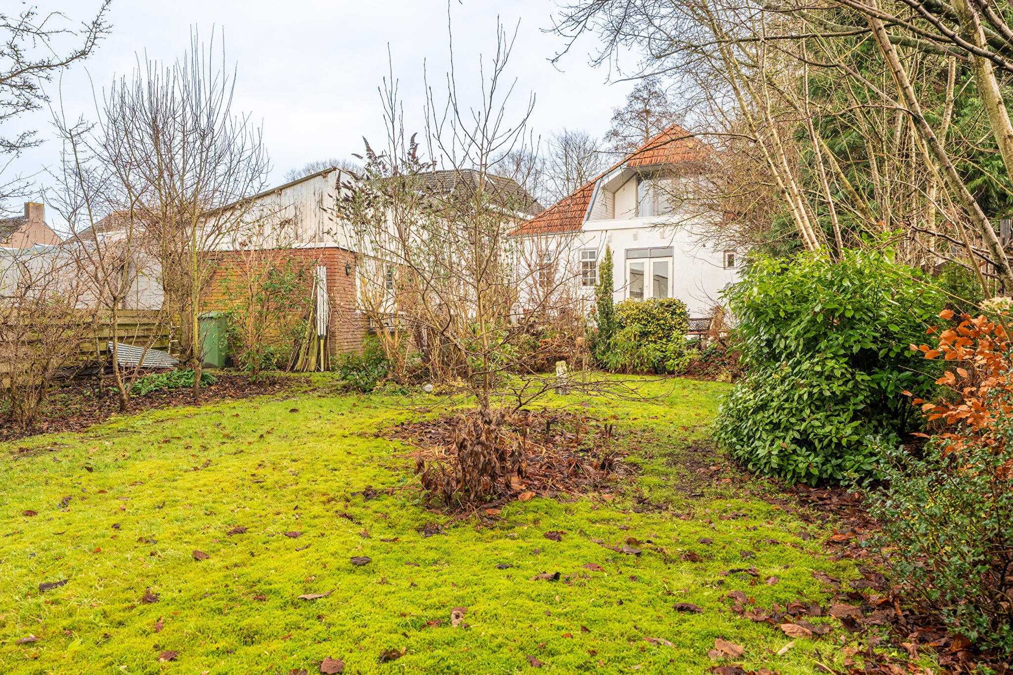 Diepe achtertuin op het zuidwesten biedt een combinatie van bestrating, gazon, fruitbomen, beplanting en groen. Dankzij de oprit is er plaats voor meerdere auto’s. Een royaal perceel met volop ruimte voor spelende kinderen, hobbydieren of een moestuin. De vrijstaande stenen garage beschikt over veel bergingsruimte, ideaal als werkplaats, opslag of hobbyruimte.